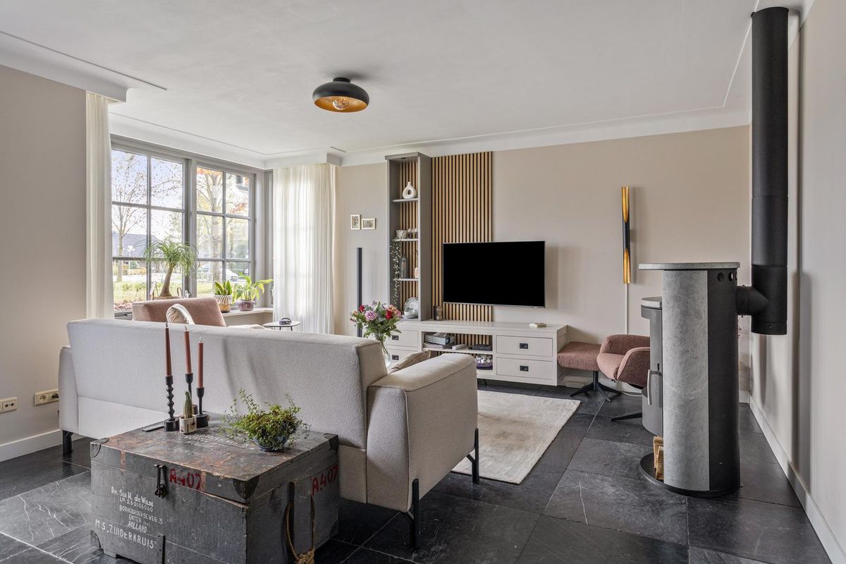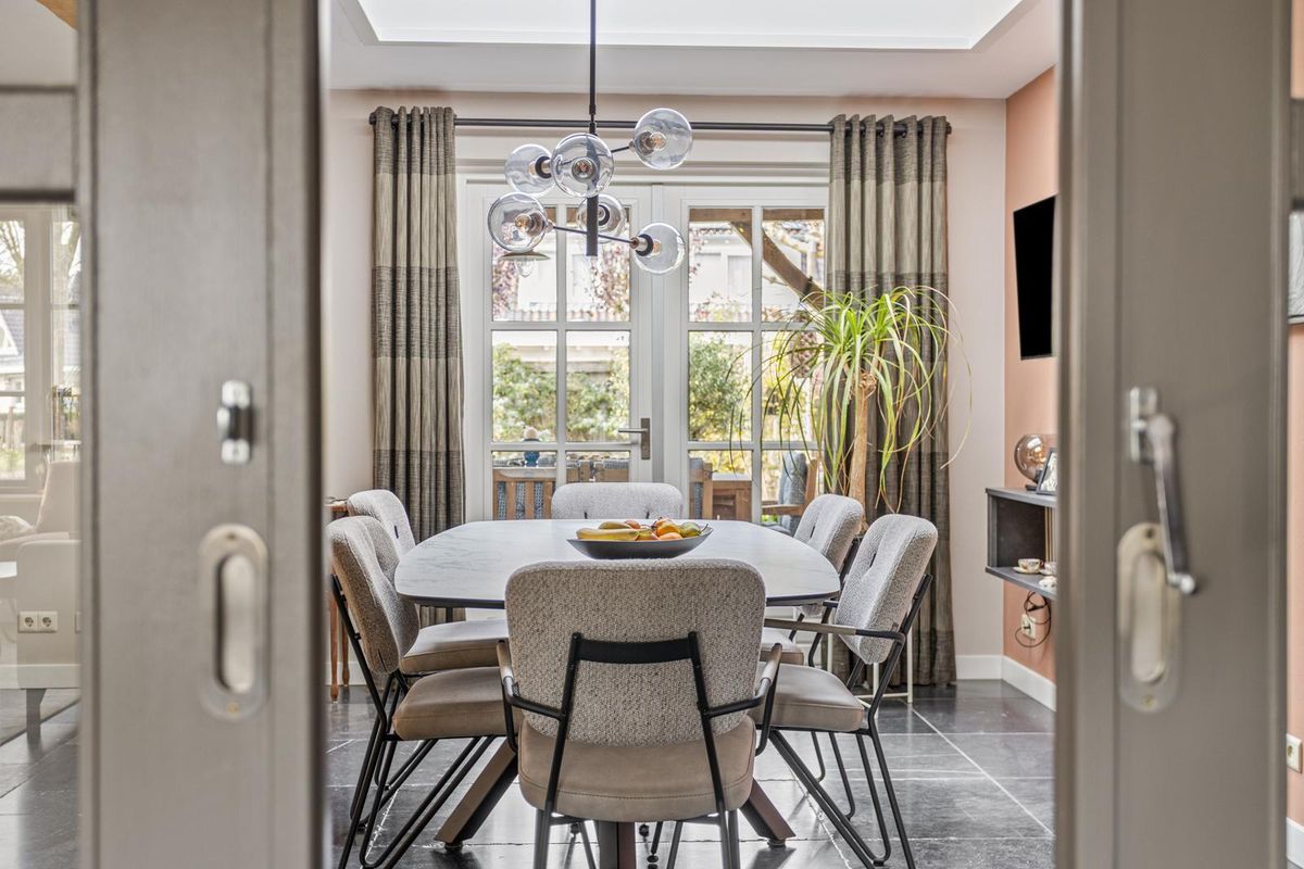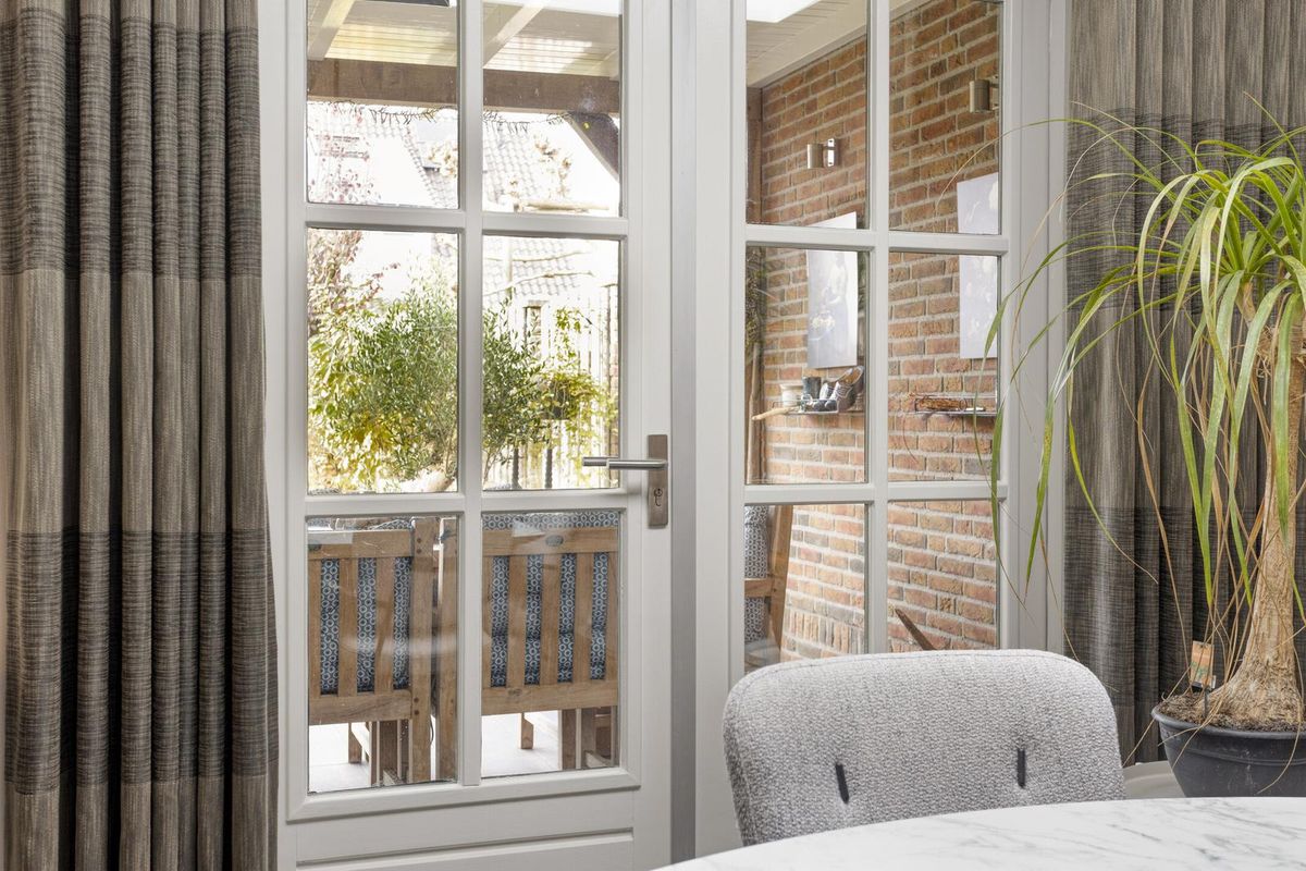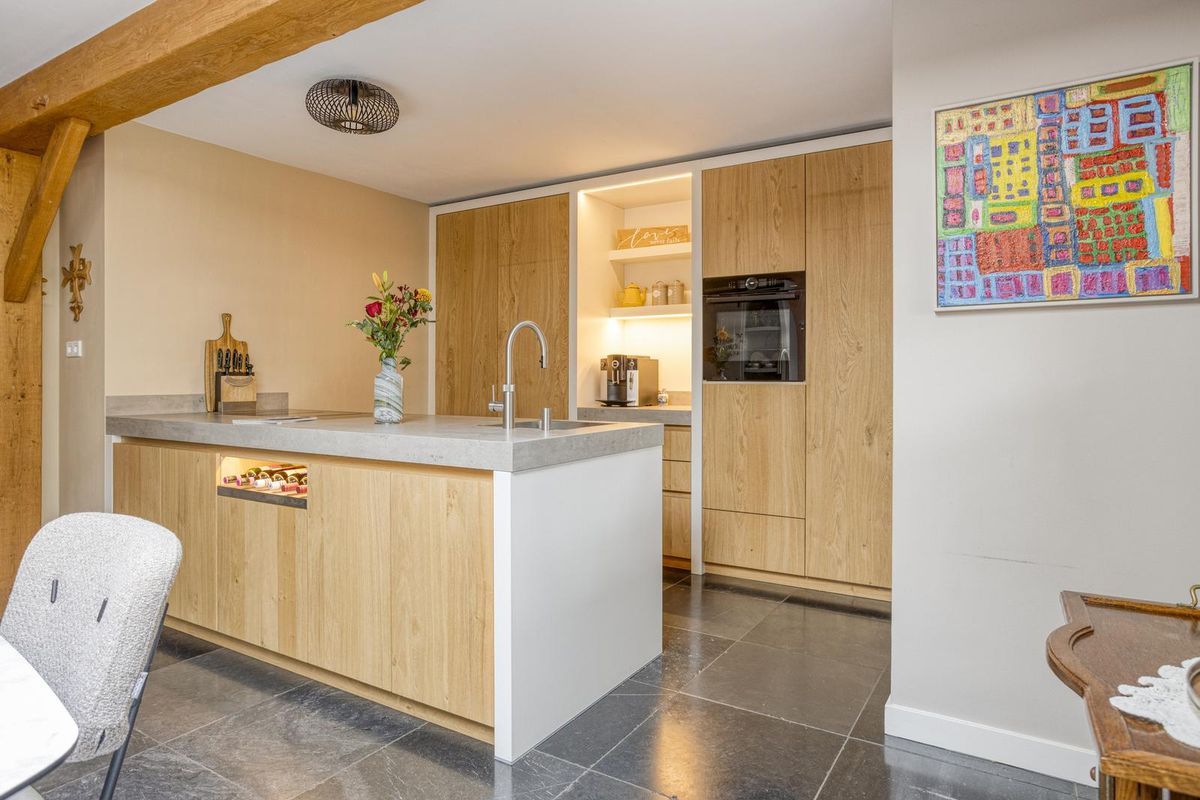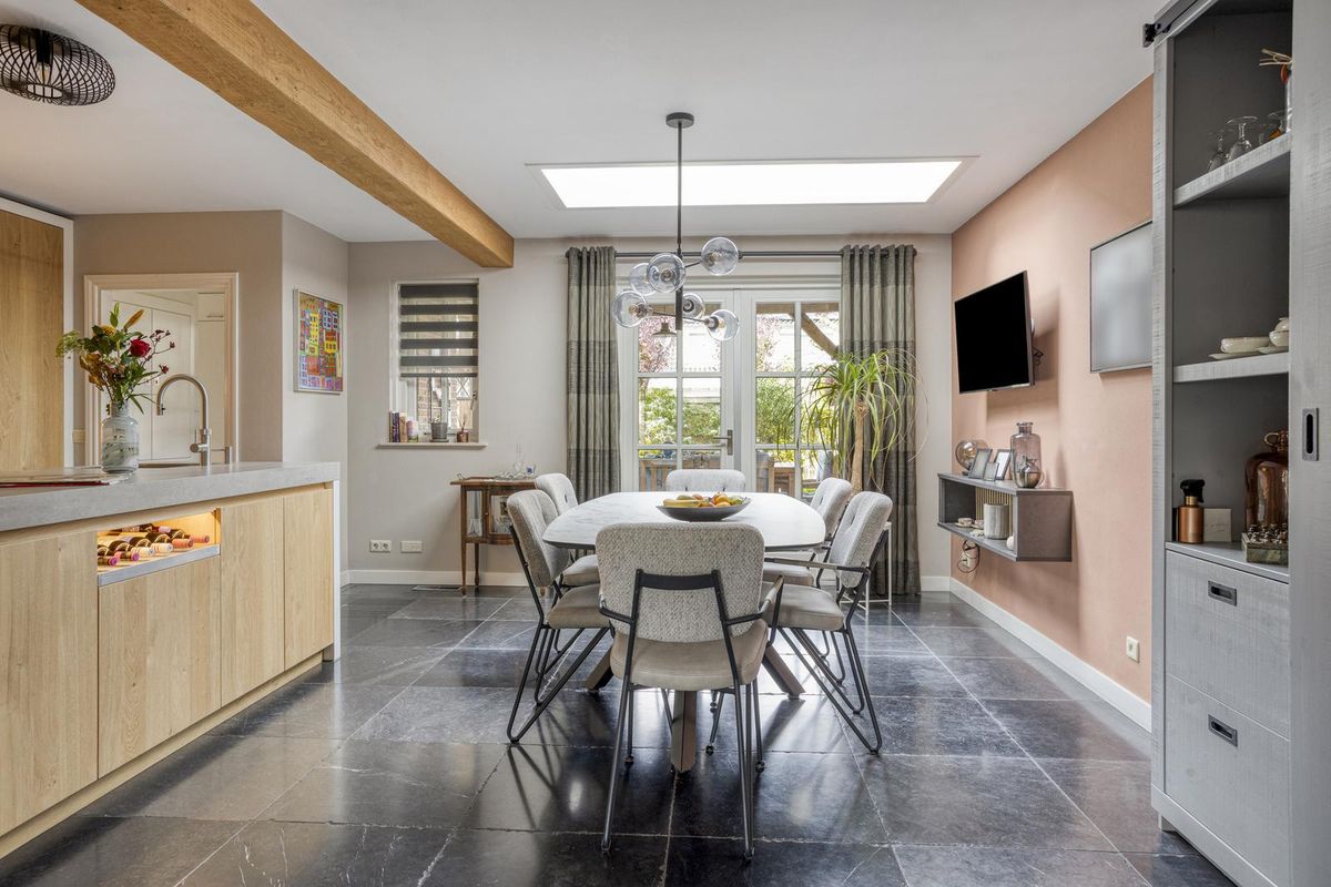 Zodra je binnenkomt, proef je de zorg waarmee deze woning is onderhouden en ingericht. De ruime hal, met doorlopende natuurstenen vloer, trapopgang en toiletruimte met fonteintje, geeft direct een voorproefje van het hoge afwerkingsniveau. De woonkamer is een plek die uitnodigt tot leven en samenzijn: licht, ruim en sfeervol tegelijk. De erker en grote raampartij zorgen voor overvloedig daglicht, terwijl de combinatie van warme tinten en de houtkachel een gemoedelijke sfeer oproepen. De vloerverwarming zorgt hier, net als in de keuken, voor een behaaglijke basis, terwijl de heteluchtverwarming op de warmtepomp in de zomer juist kan koelen. Een heerlijke plek voor gezellige samenkomsten met het gezin. Een heerlijke plek voor gezellige samenkomsten met het gezin. Een subtiel hoogtepunt in deze ruimte zijn de prachtige en suitedeuren, omlijst door op maat gemaakte boekenkasten. Ze vormen een stijlvolle overgang tussen de woonkamer en de woonkeuken, waarmee beide ruimtes met één vloeiende beweging kunnen worden verbonden of juist intiem afgesloten. De woonkeuken is het kloppend hart van het huis — een combinatie van modern design en natuurlijke warmte. De houten balkenconstructie, het royale daklicht en de zachte wandafwerking creëren een uitnodigende ambiance. De keukenopstelling is tot in detail doordacht, met een ruim kookeiland, betonlook werkblad en houtlook fronten. Alle gewenste inbouwapparatuur is aanwezig: een inductiekookplaat met geïntegreerde afzuiging, combi-oven, vaatwasser, Quooker, koelkast en vriezer. Er is zelfs een handige koffiecorner. Via dubbele deuren stap je zó de veranda onder, waardoor binnen en buiten op zonnige dagen naadloos in elkaar overlopen. Aansluitend aan de keuken ligt de praktische bijkeuken met witgoedaansluitingen, toegang tot de kelder en doorgang tot de garage. Hier bevindt zich ook de in 2023 geplaatste waterontharder, die zorgt voor zacht water en minder kalkafzetting in leidingen en apparaten.
