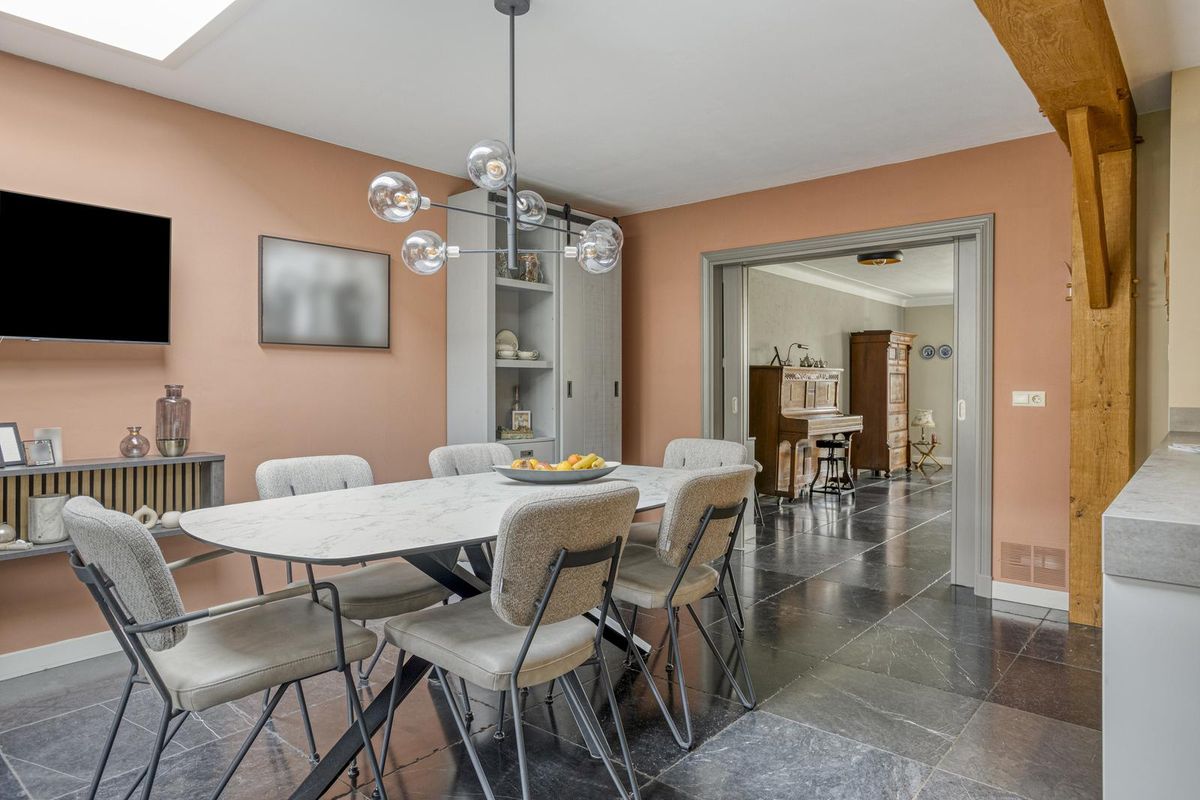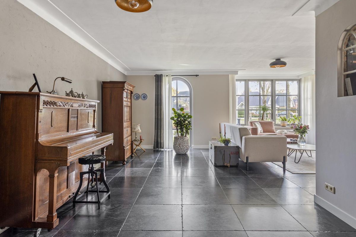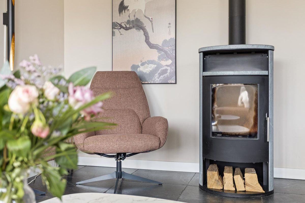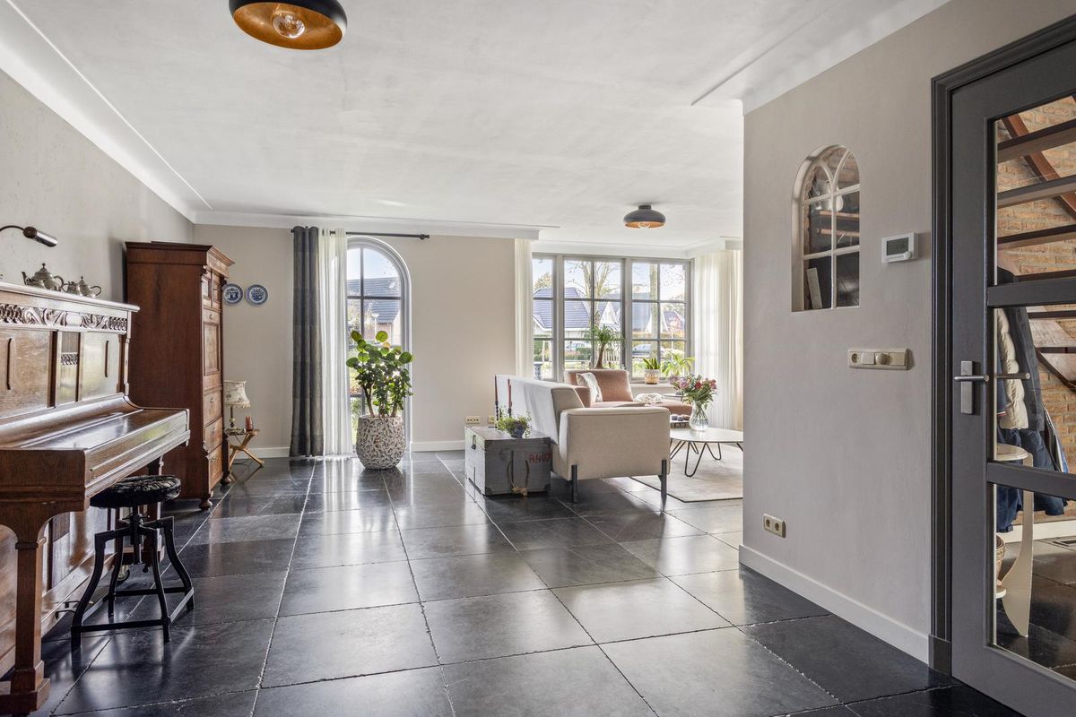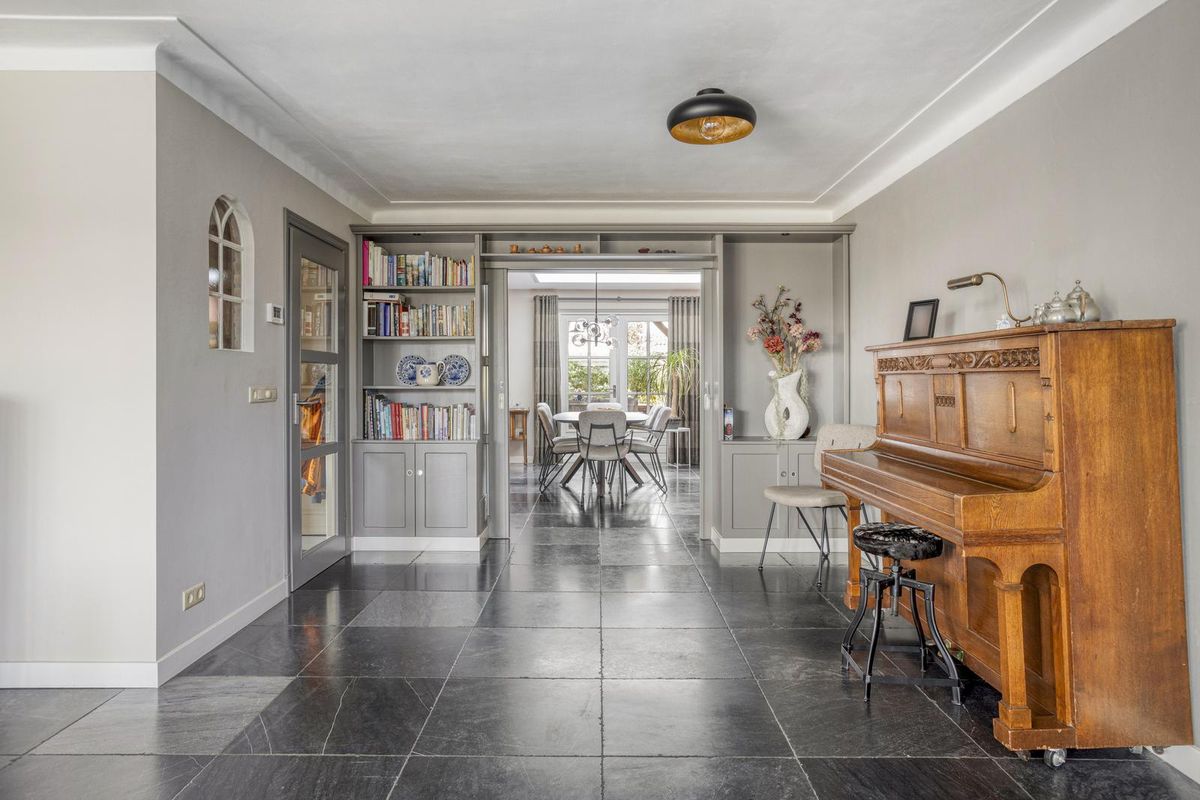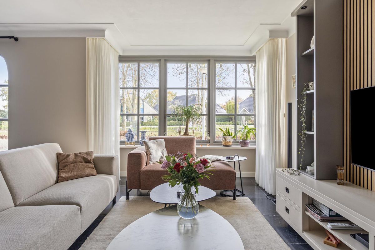 Zodra je binnenkomt, proef je de zorg waarmee deze woning is onderhouden en ingericht. De ruime hal, met doorlopende natuurstenen vloer, trapopgang en toiletruimte met fonteintje, geeft direct een voorproefje van het hoge afwerkingsniveau. De woonkamer is een plek die uitnodigt tot leven en samenzijn: licht, ruim en sfeervol tegelijk. De erker en grote raampartij zorgen voor overvloedig daglicht, terwijl de combinatie van warme tinten en de houtkachel een gemoedelijke sfeer oproepen. De vloerverwarming zorgt hier, net als in de keuken, voor een behaaglijke basis, terwijl de heteluchtverwarming op de warmtepomp in de zomer juist kan koelen. Een heerlijke plek voor gezellige samenkomsten met het gezin. Een heerlijke plek voor gezellige samenkomsten met het gezin. Een subtiel hoogtepunt in deze ruimte zijn de prachtige en suitedeuren, omlijst door op maat gemaakte boekenkasten. Ze vormen een stijlvolle overgang tussen de woonkamer en de woonkeuken, waarmee beide ruimtes met één vloeiende beweging kunnen worden verbonden of juist intiem afgesloten. De woonkeuken is het kloppend hart van het huis — een combinatie van modern design en natuurlijke warmte. De houten balkenconstructie, het royale daklicht en de zachte wandafwerking creëren een uitnodigende ambiance. De keukenopstelling is tot in detail doordacht, met een ruim kookeiland, betonlook werkblad en houtlook fronten. Alle gewenste inbouwapparatuur is aanwezig: een inductiekookplaat met geïntegreerde afzuiging, combi-oven, vaatwasser, Quooker, koelkast en vriezer. Er is zelfs een handige koffiecorner. Via dubbele deuren stap je zó de veranda onder, waardoor binnen en buiten op zonnige dagen naadloos in elkaar overlopen. Aansluitend aan de keuken ligt de praktische bijkeuken met witgoedaansluitingen, toegang tot de kelder en doorgang tot de garage. Hier bevindt zich ook de in 2023 geplaatste waterontharder, die zorgt voor zacht water en minder kalkafzetting in leidingen en apparaten.