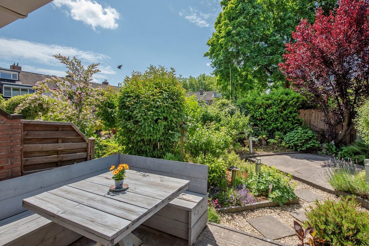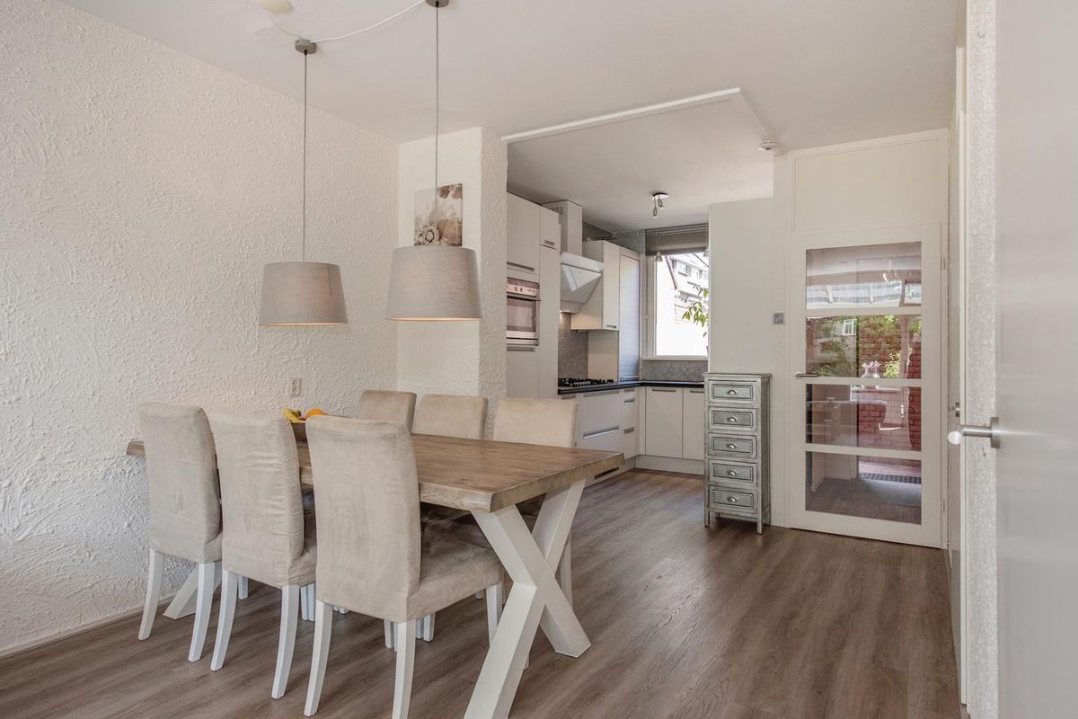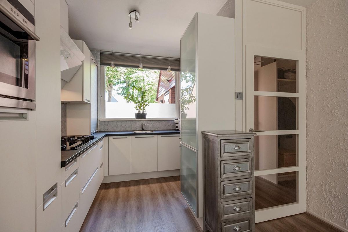 Voortuin met toegang tot de stenen berging en entree naar de woning. Entree/hal met meterkast, apart toilet (hangend met fonteintje) en doorgang naar de woonkamer via een paneeldeur. De benedenverdieping is afgewerkt met een fraaie PVC vloer. Aan de voorzijde ligt de half open keuken, voorzien van 5-pits gaskookplaat, afzuigkap, combi-oven-magnetron, vaatwasmachine en koelkast. Vanuit de woonkamer kijk je via een grote raampartij uit op de fraai aangelegde achtertuin die door de achterdeur en via een achterom bereikbaar is. De tuin ligt gunstig op het zonnige zuiden en grenst aan een groenvoorziening, wat aangenaam veel privacy geeft. De tuin is voorzien van een buitenkraan en tuinkast.