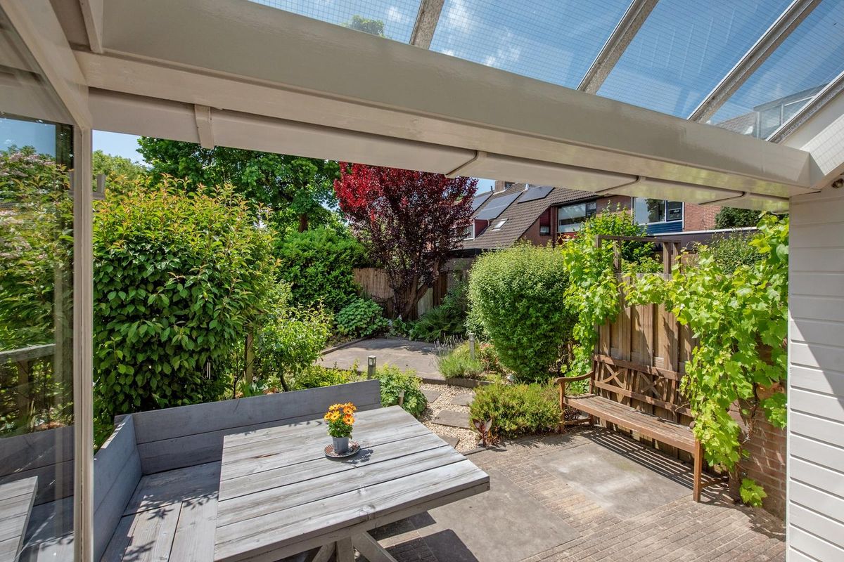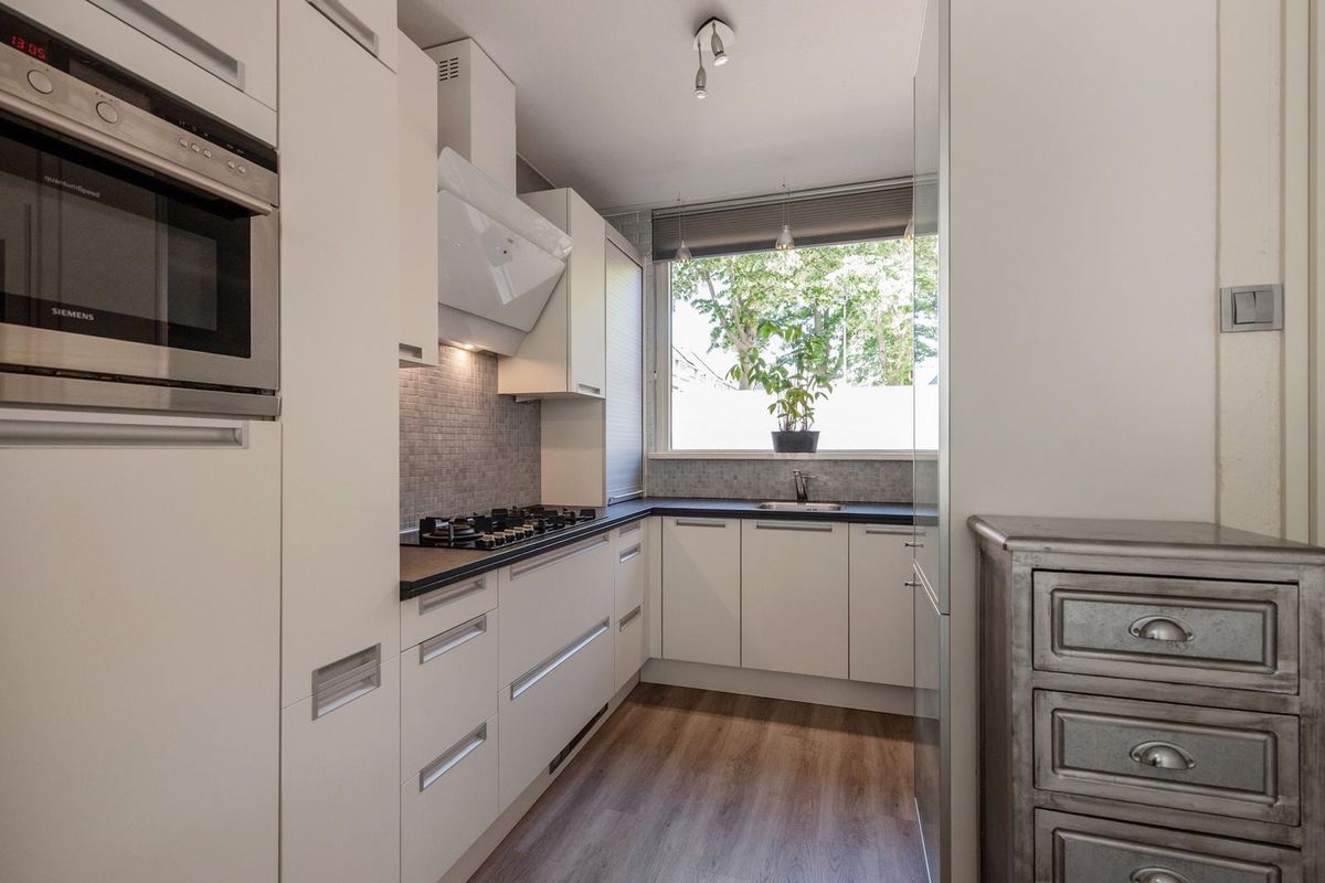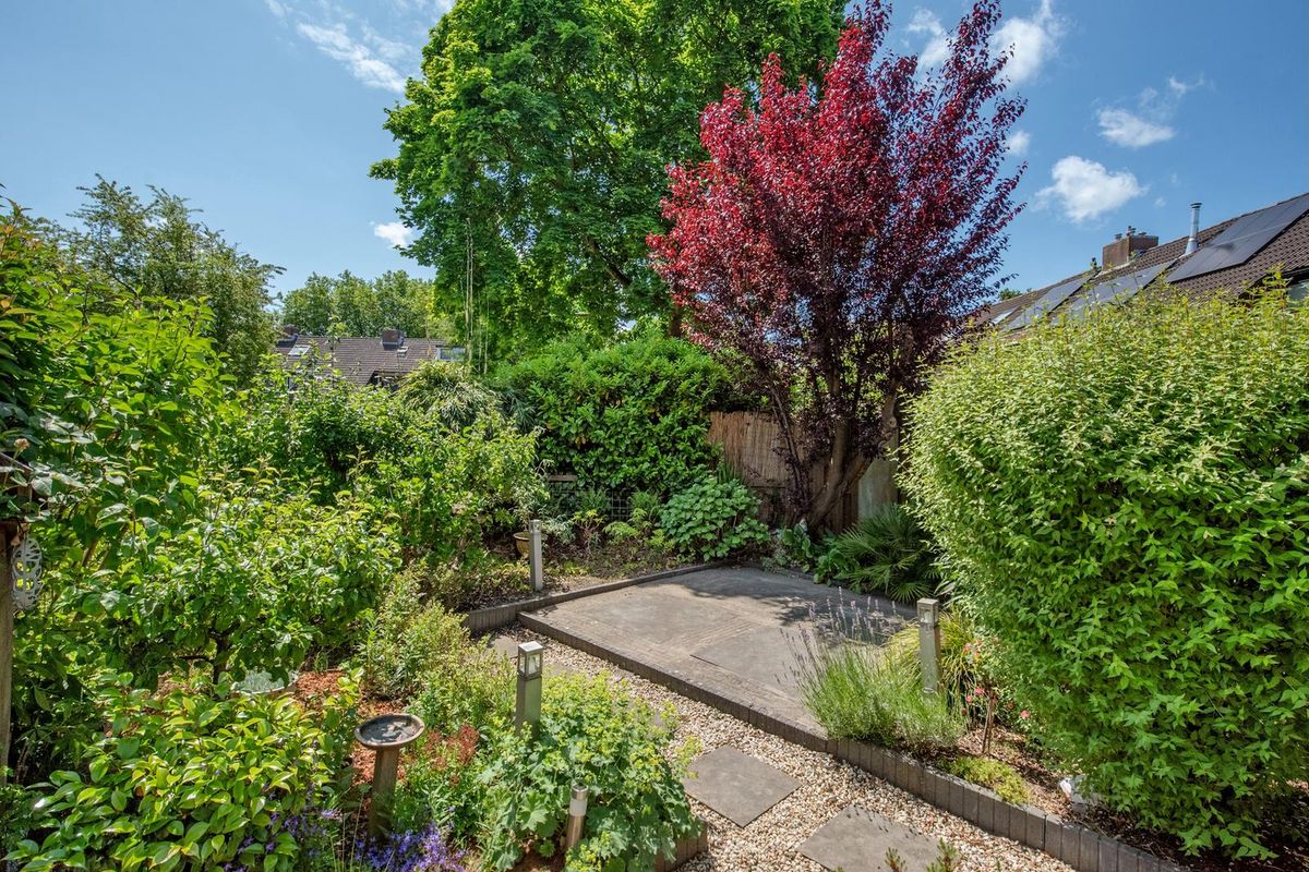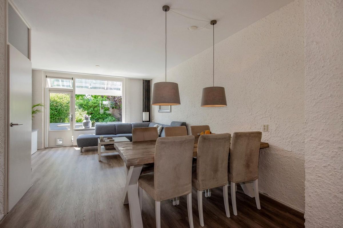 Voortuin met toegang tot de stenen berging en entree naar de woning. Entree/hal met meterkast, apart toilet (hangend met fonteintje) en doorgang naar de woonkamer via een paneeldeur. De benedenverdieping is afgewerkt met een fraaie PVC vloer. Aan de voorzijde ligt de half open keuken, voorzien van 5-pits gaskookplaat, afzuigkap, combi-oven-magnetron, vaatwasmachine en koelkast. Vanuit de woonkamer kijk je via een grote raampartij uit op de fraai aangelegde achtertuin die door de achterdeur en via een achterom bereikbaar is. De tuin ligt gunstig op het zonnige zuiden en grenst aan een groenvoorziening, wat aangenaam veel privacy geeft. De tuin is voorzien van een buitenkraan en tuinkast.