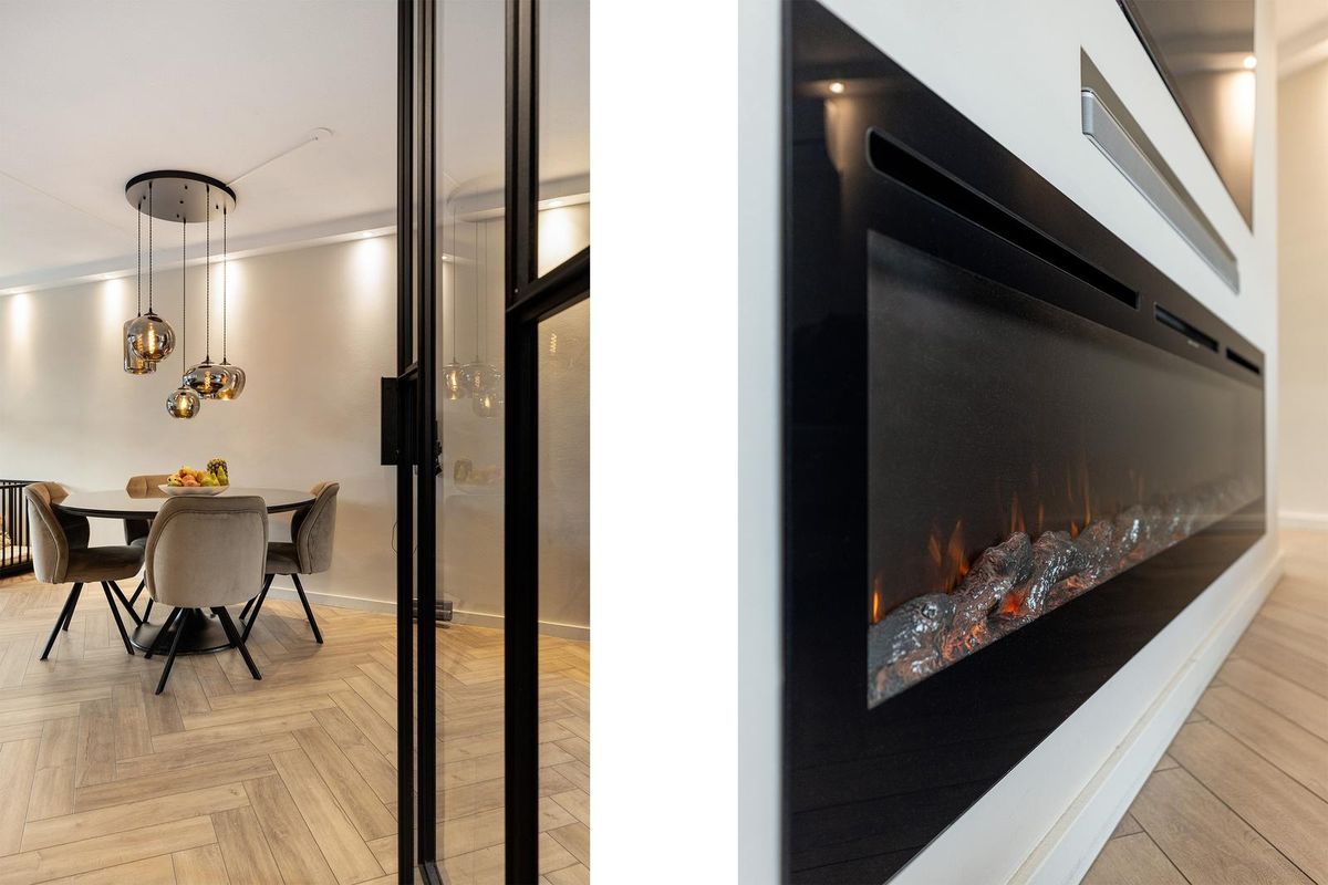 De fraaie cinewall met elektrische haard en uitsparing voor de televisie zorgt voor een luxe uitstraling.