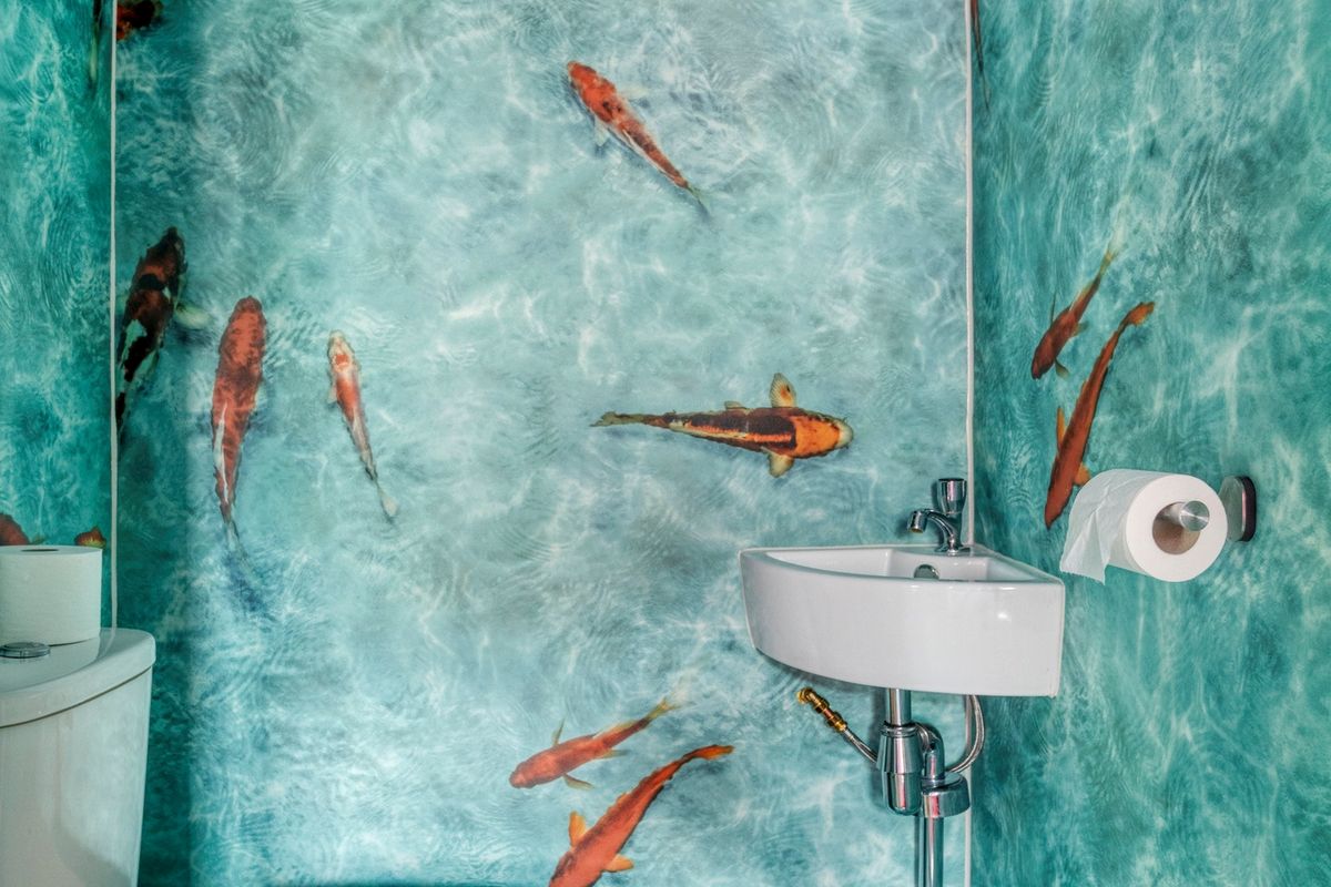 Het toilet is voorzien van een hoekfontein en een originele sfeer.