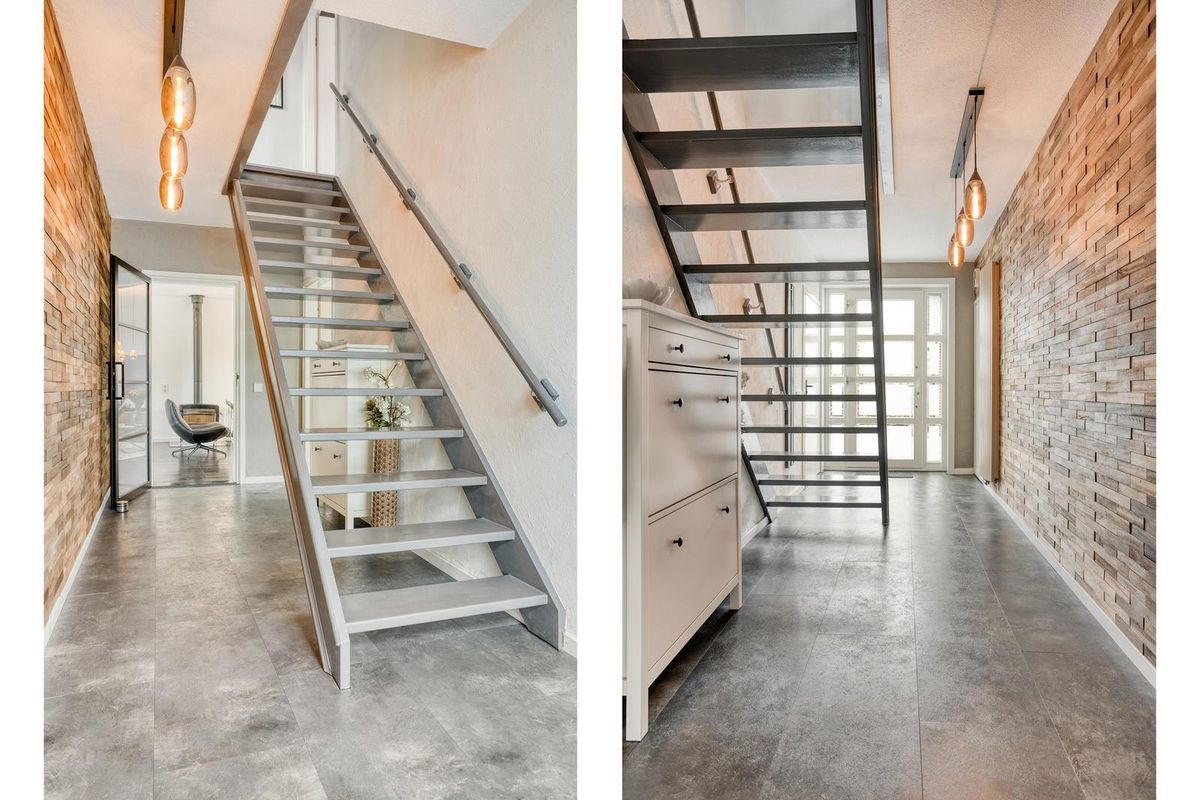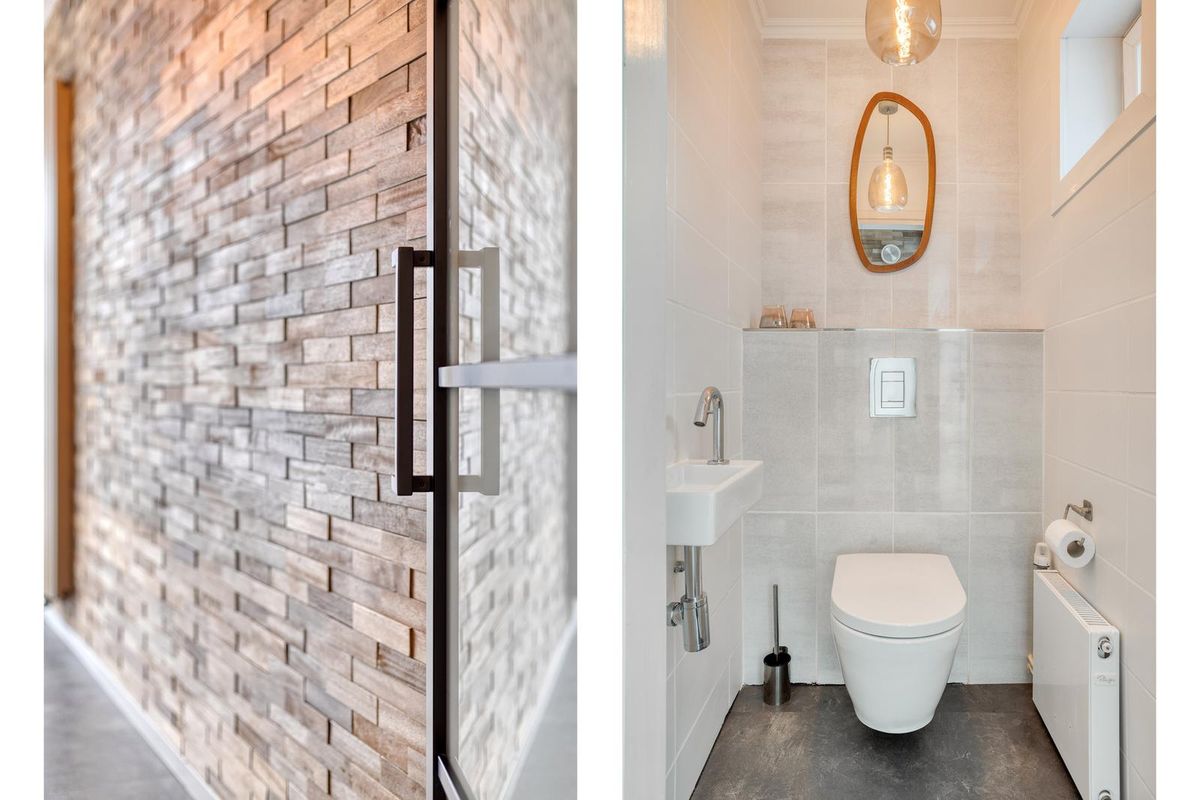 Binnenkomst in de hal met meterkast, hangtoilet met fonteintje en trap naar de verdieping. Vanuit de hal is de slaapkamer en de woonkamer toegankelijk.