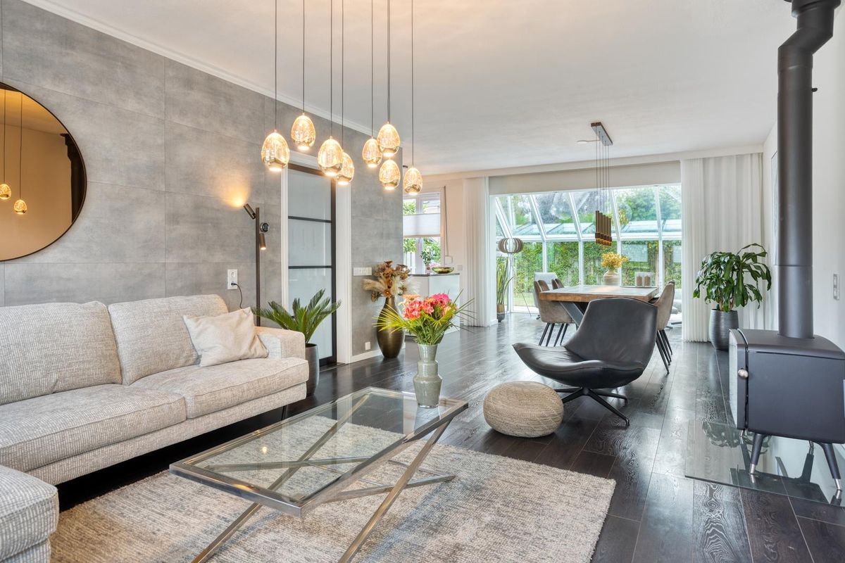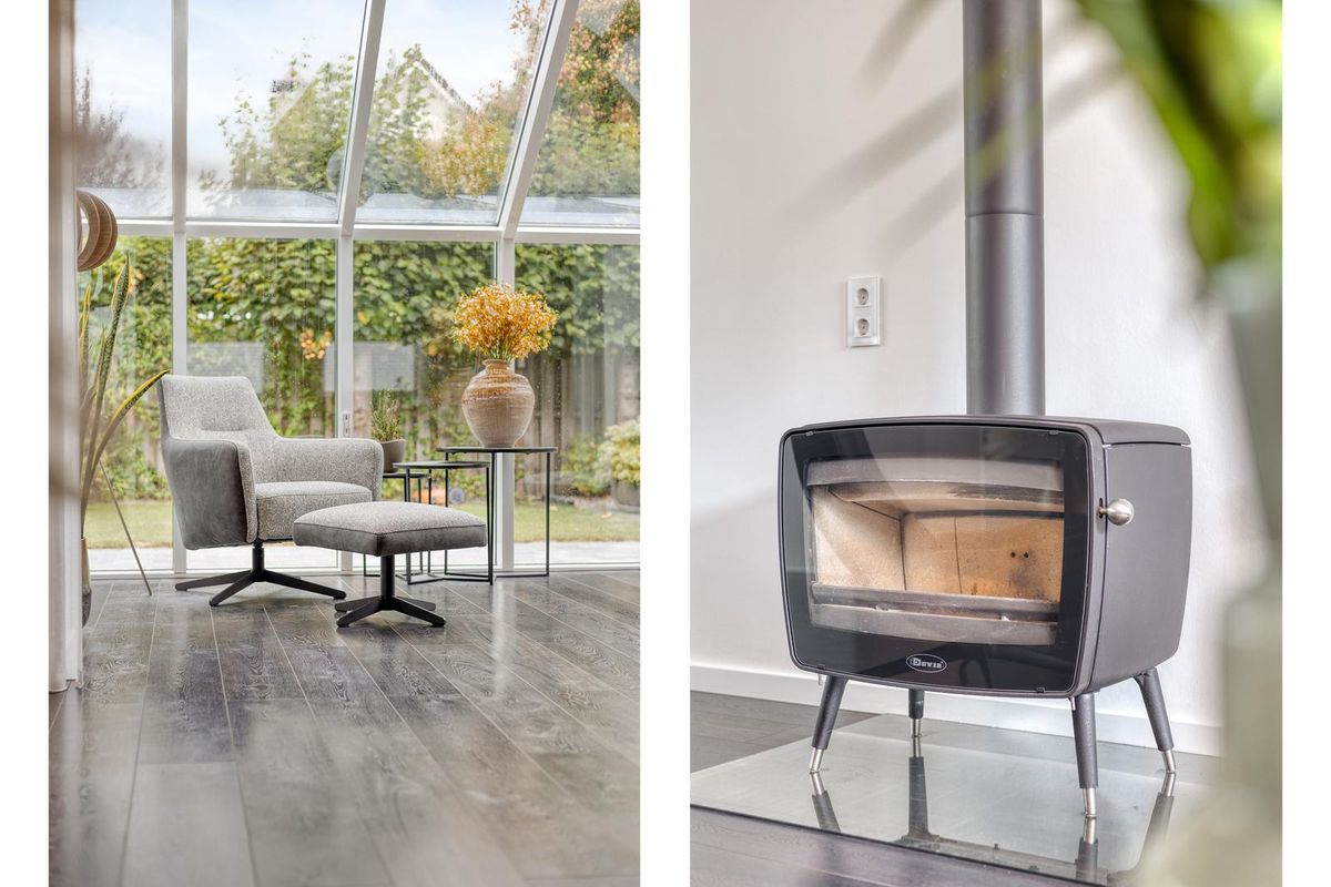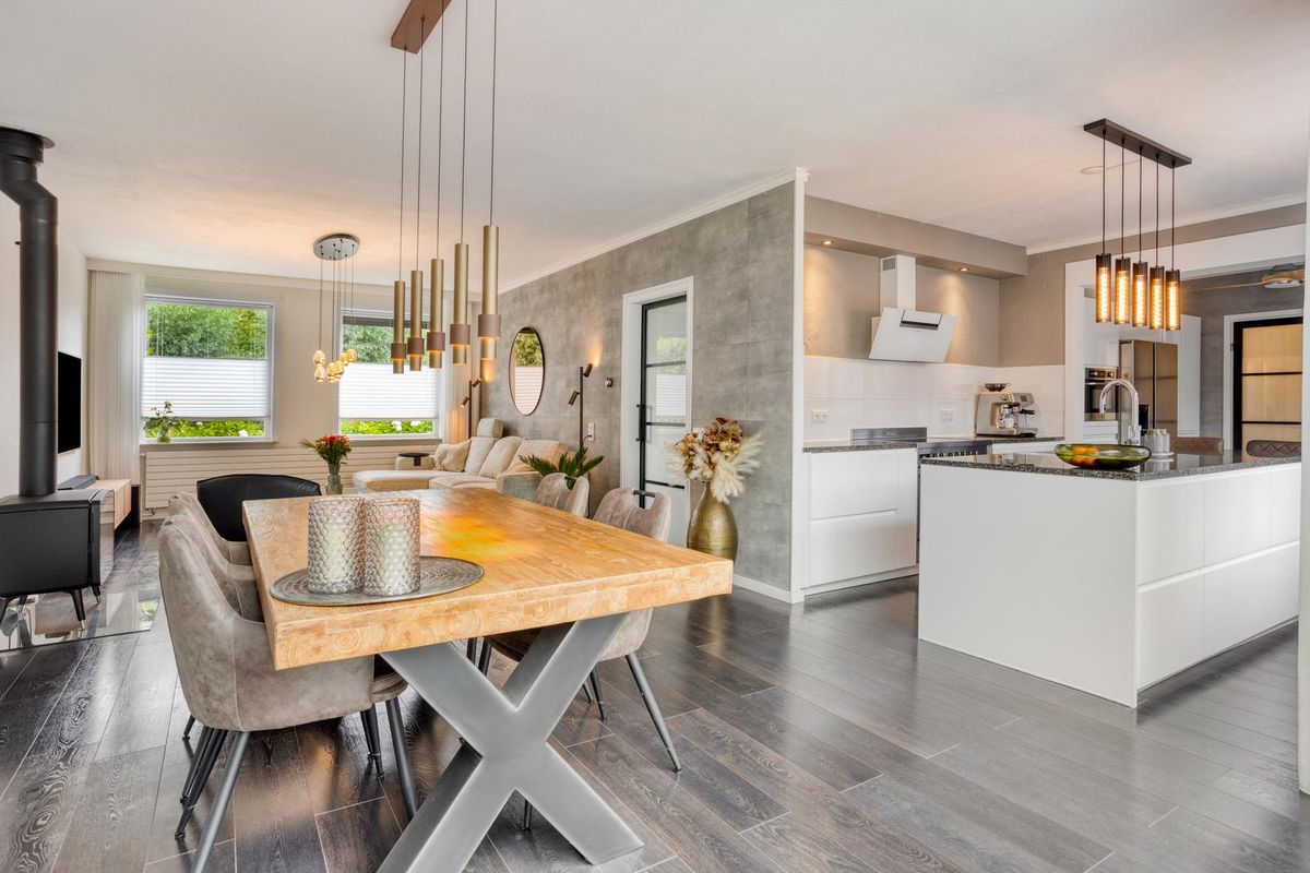 De sfeervolle woonkamer met half open keuken is aan de achterzijde uitgebouwd met een fraaie serre wat voor een heerlijke lichtinval zorgt. De vloer is afgewerkt met een mooi laminaat en is er een gezellige vrijstaande houtkachel. Het is een ideale combinatie van stijl en comfort, waar je heerlijk tot rust komt of kan genieten van de mooie dingen in het leven met je gezin, familie of vrienden.