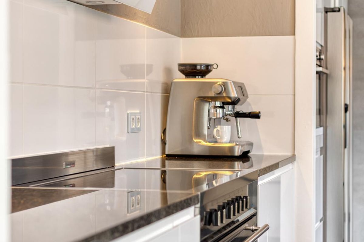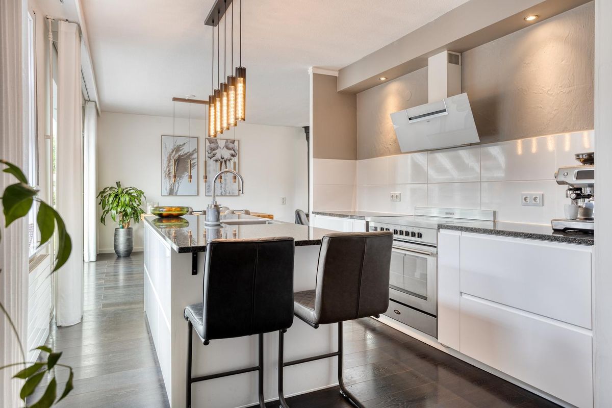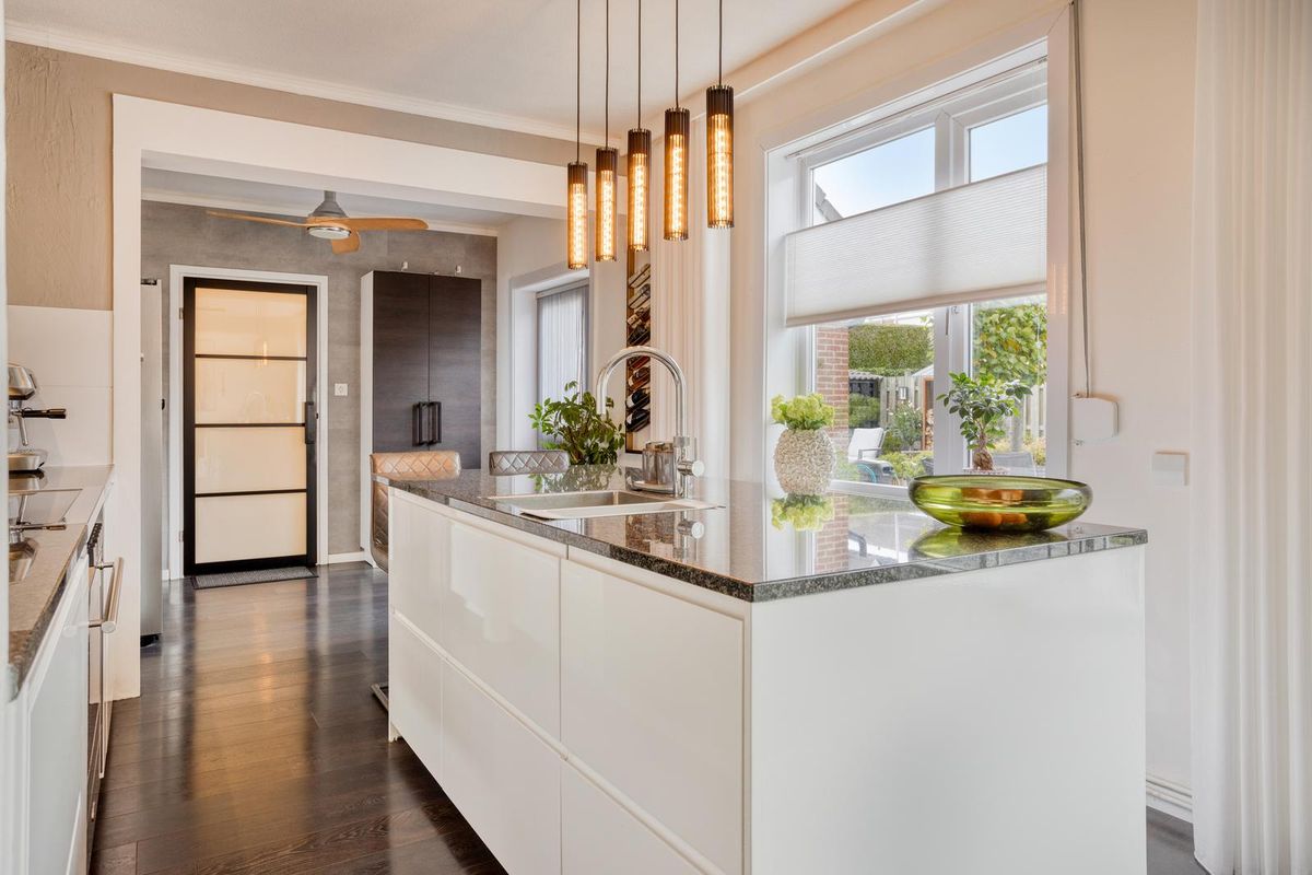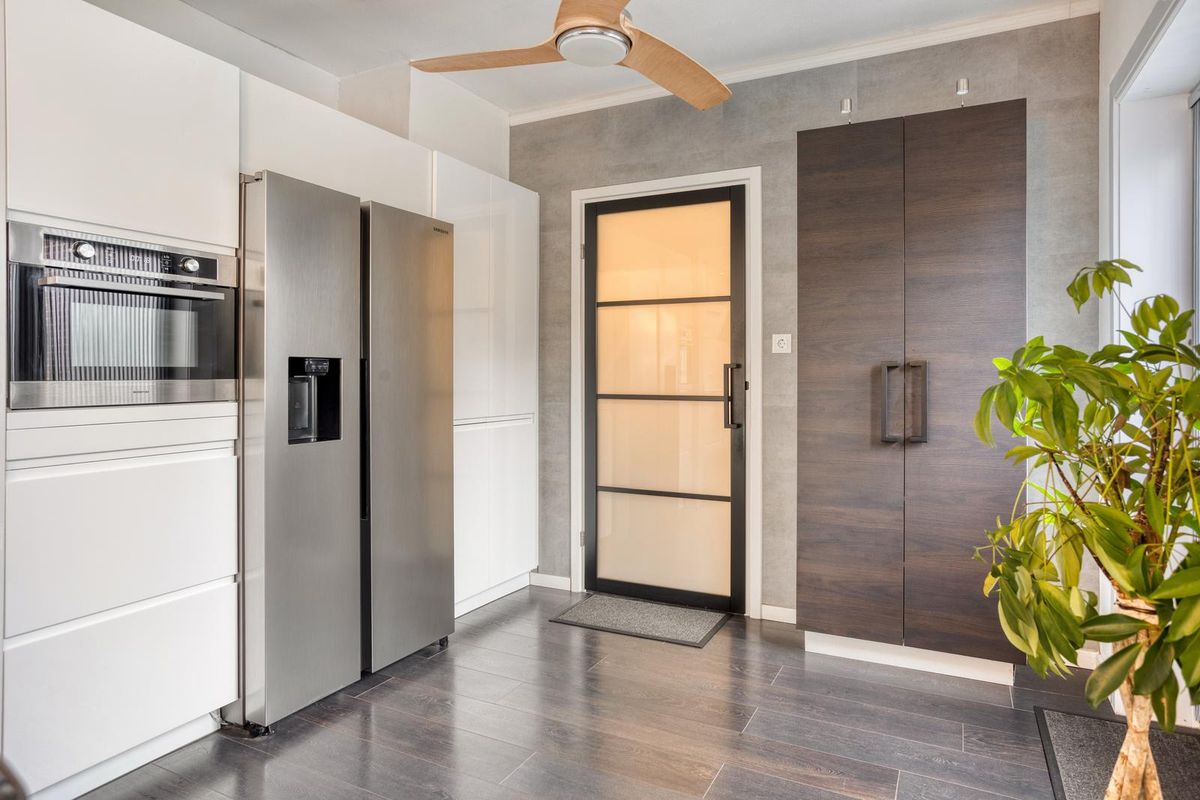 De moderne recente keuken is tijdloos door zijn witte kastjes en stenen werkblad. Voor de thuis chef is alle inbouwapparatuur aanwezig, zo is de keuken uitgevoerd met spoeleiland, ingebouwde vaatwasmachine, luxe Boretti inductie fornuis, afzuigkap, Quooker kraan en Amerikaanse koelkast met ijsdispenser. Naast de keuken geeft de tussenhal, met aansluitingen voor het witgoed, toegang tot de garage en de vaste trap naar de zolderkamer. Vanuit de ruime geïsoleerde garage met brede elektrische sectionalpoort is net als vanuit de keuken de tuin bereikbaar.