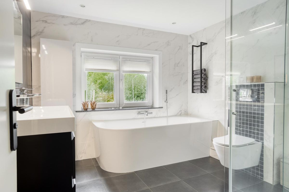 De luxe en zeer smaakvolle badkamer is uitgevoerd met dubbel was meubel met bijbehorende spiegel, ruime inloopdouche met glazen wanden en regen- en handdouche, tweede hangtoilet en design radiator. De vloerverwarming zorgt voor extra comfort.