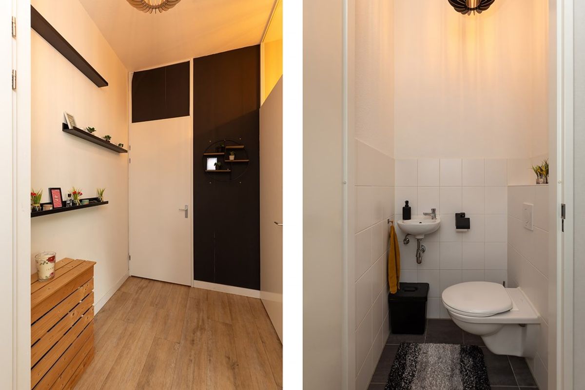 De woning ligt op de beganegrond en via je eigen entrée stap je het appartement binnen. Bij de entrée kun je op zonnige dagen al heerlijk een ochtendkoffie drinken. Eenmaal in de hal heb je toegang tot de woonkamer, een modern toilet en de inpandige berging met wasmachine-aansluiting.