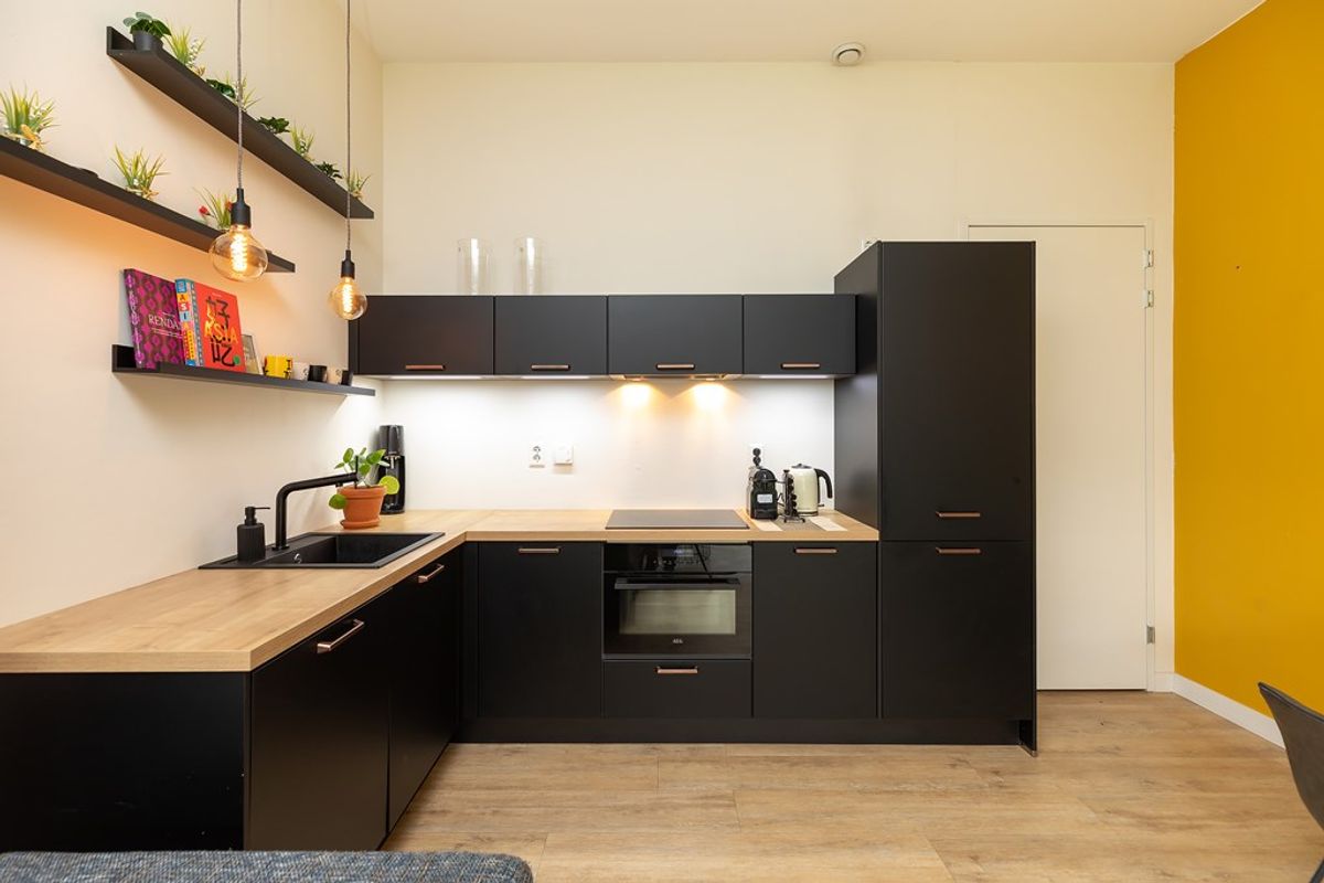 De open keuken is modern en praktisch. Dankzij de L-opstelling heb je volop werkruimte en kastruimte. Vanzelfsprekend is alles aanwezig wat je nodig hebt: een koelkast, vriezer, combi-oven, vaatwasser en inductiekookplaat.
