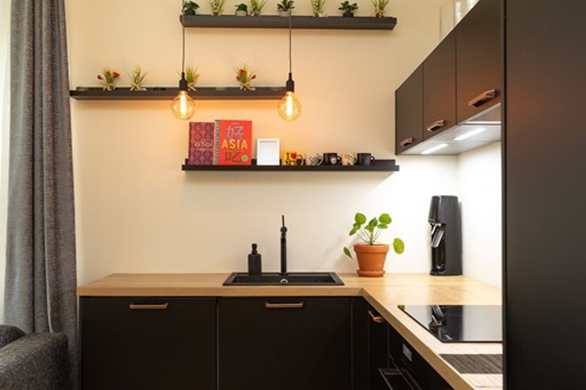 The open kitchen is modern and practical. Its L-shaped layout provides plenty of workspace and storage. It comes fully equipped with a fridge, freezer, combi-oven, dishwasher, and induction hob.