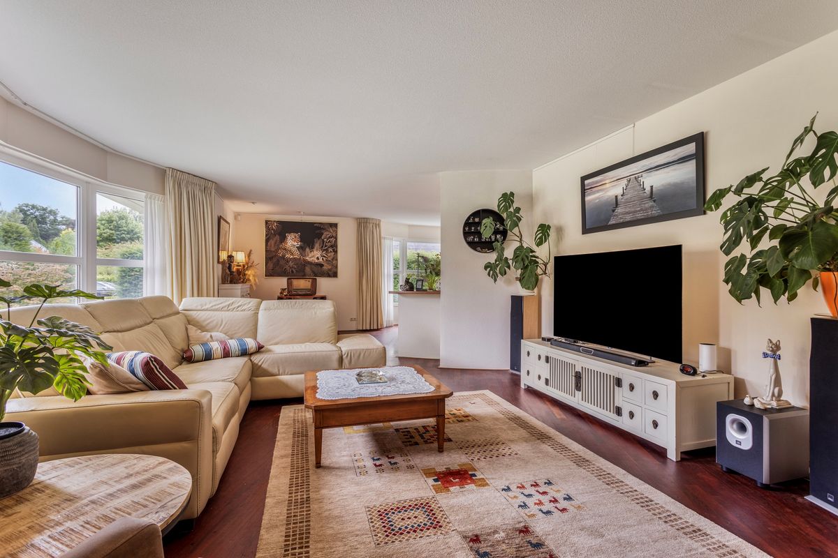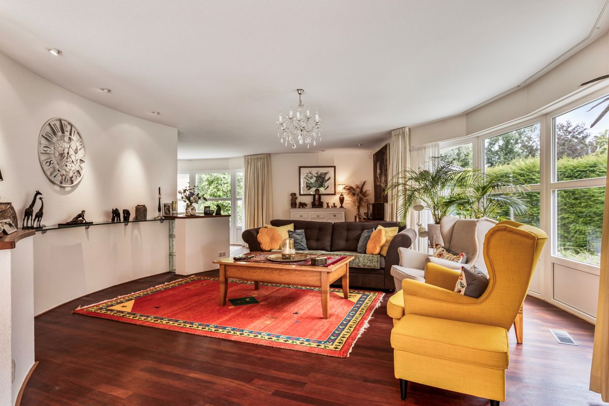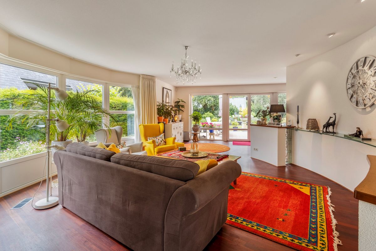 De woonkamer is speels ingedeeld met twee leuke zitjes. Vooral de rondingen in de gevels maken deze ruimte bijzonder. Bovendien heeft u vanuit deze zitjes ook prachtig zicht op de tuin.