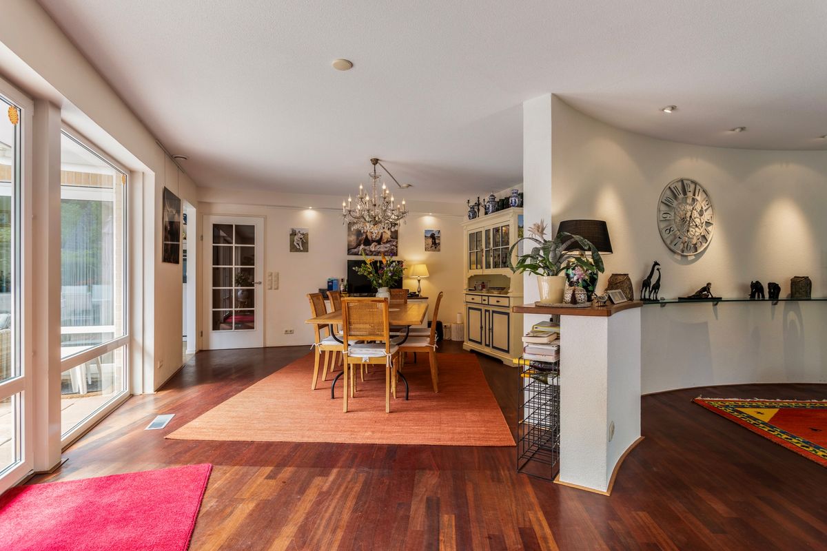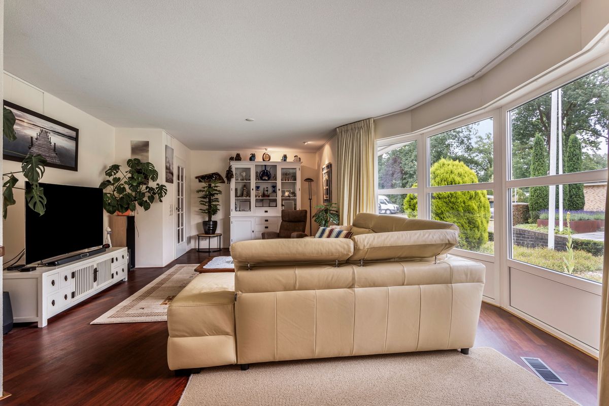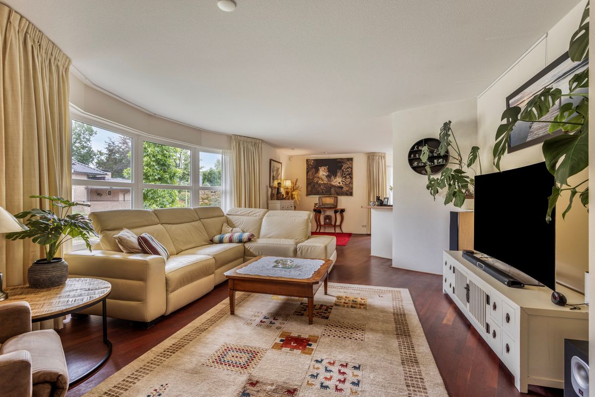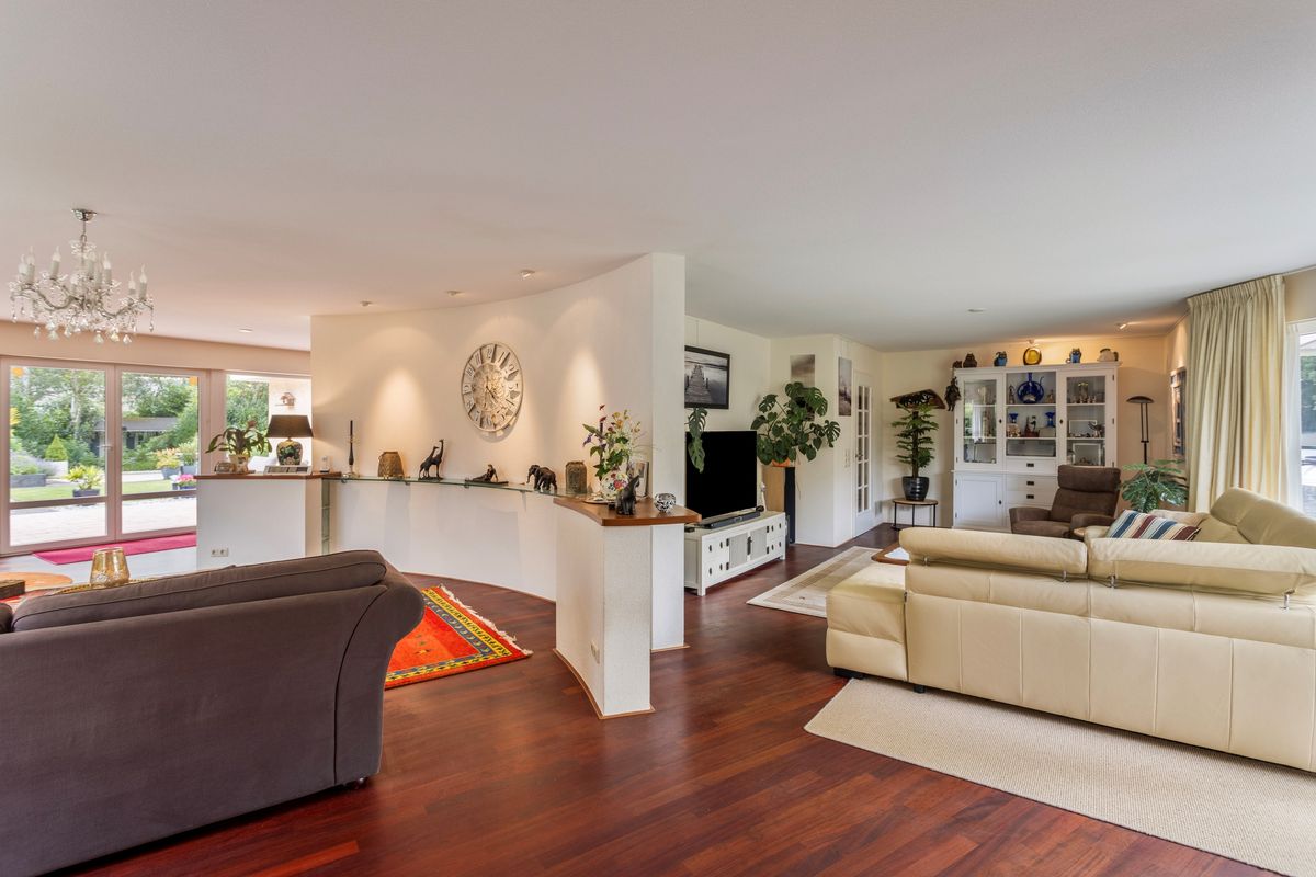 De woonkamer is speels ingedeeld met twee leuke zitjes. Vooral de rondingen in de gevels maken deze ruimte bijzonder. Bovendien heeft u vanuit deze zitjes ook prachtig zicht op de tuin.