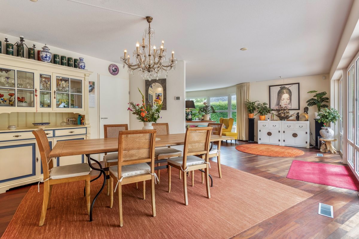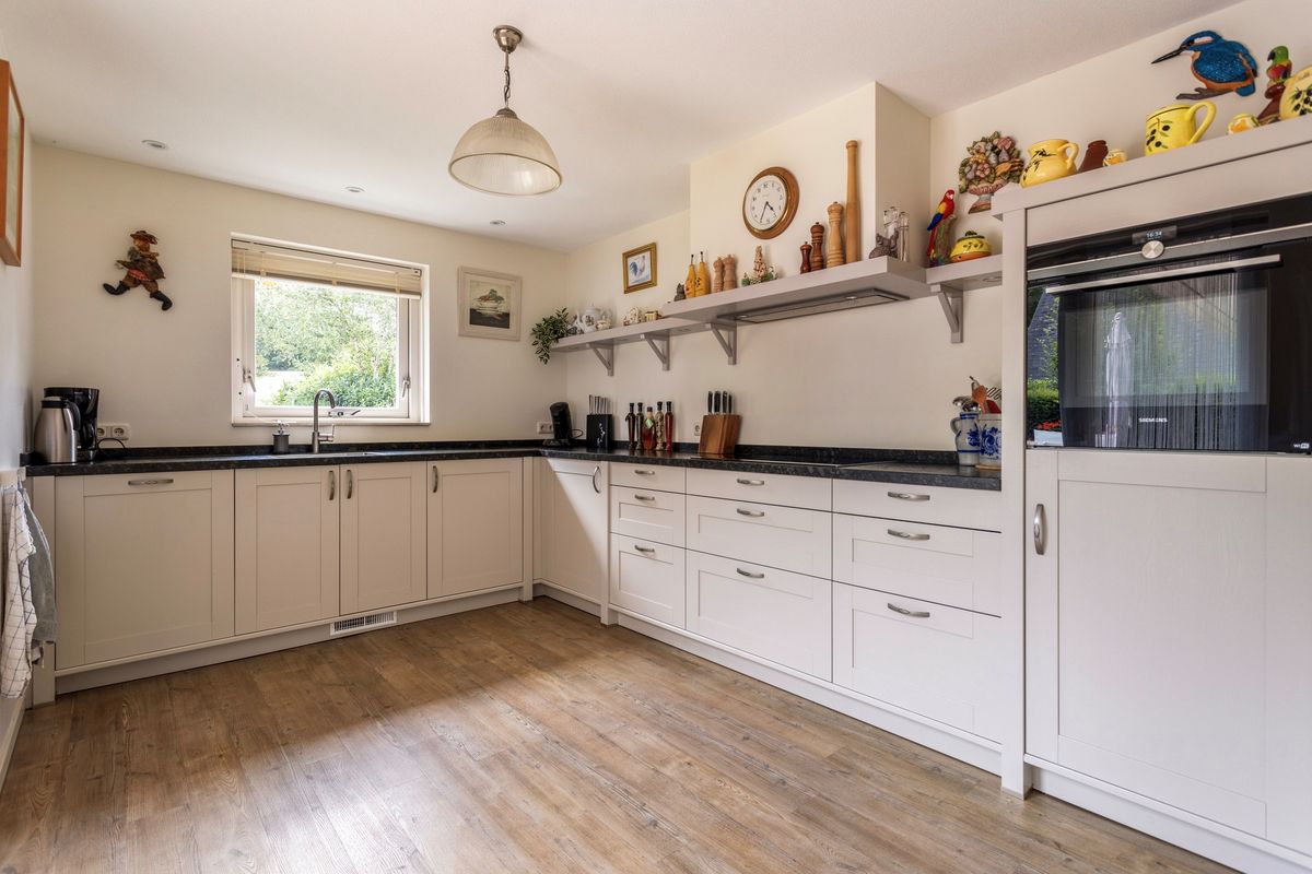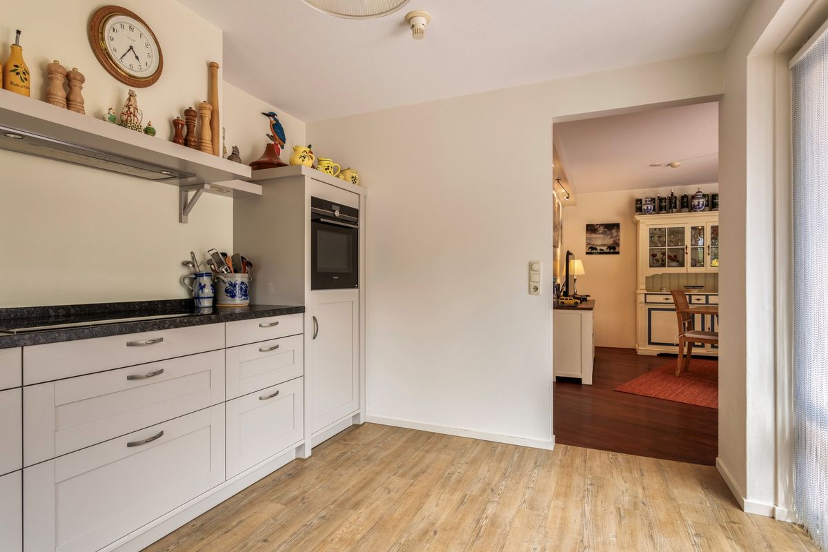De ruime eetkamer heeft prachtig uitzicht over de achtertuin, toegang tot een trapkast en doorgang naar de besloten keuken. De keuken is nieuw geplaatst in 2018 en voorzien van een combi-oven, vaatwasser, inductiekookplaat, afzuigkap en koelkast.
