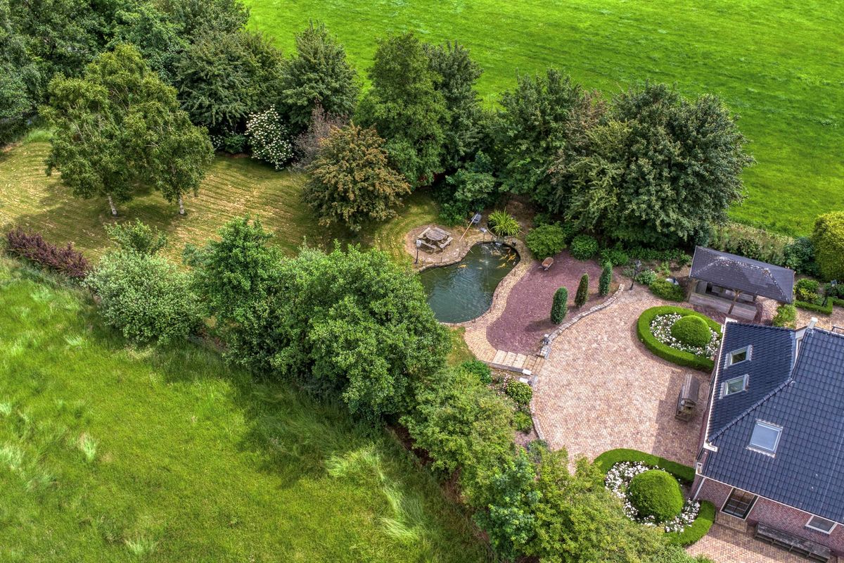 Grote fraai aangelegde tuin met verschillende terrassen, een terrasoverkapping, een vijver en een boomgaard. De mooie borders geven de tuin veel kleur in de zomer.