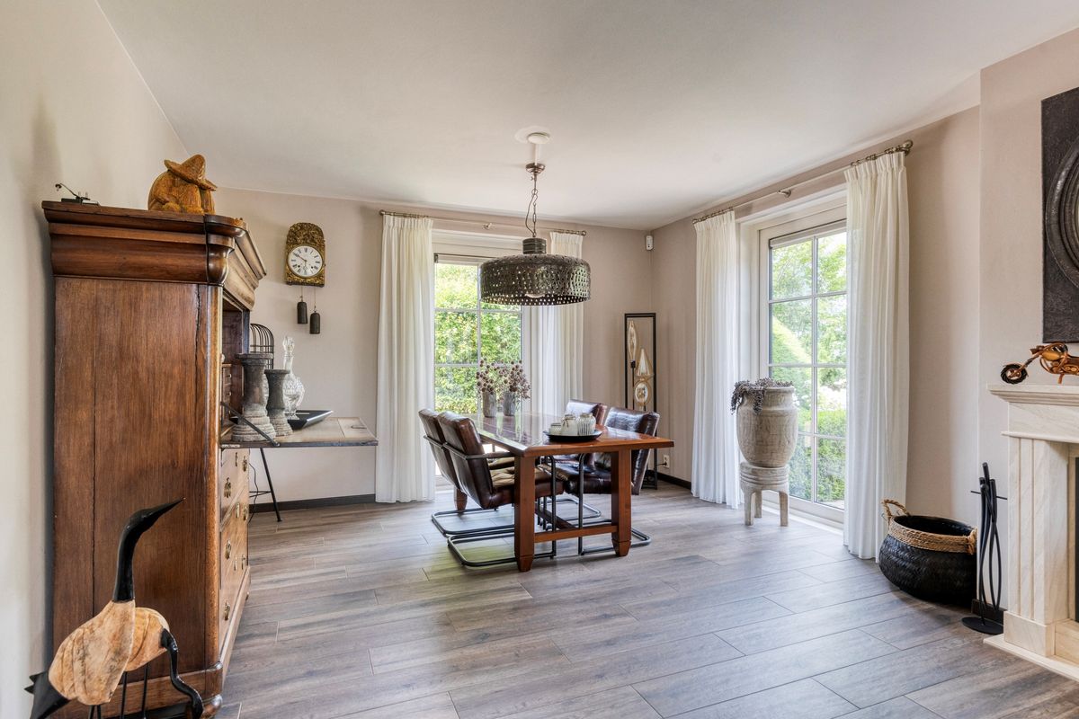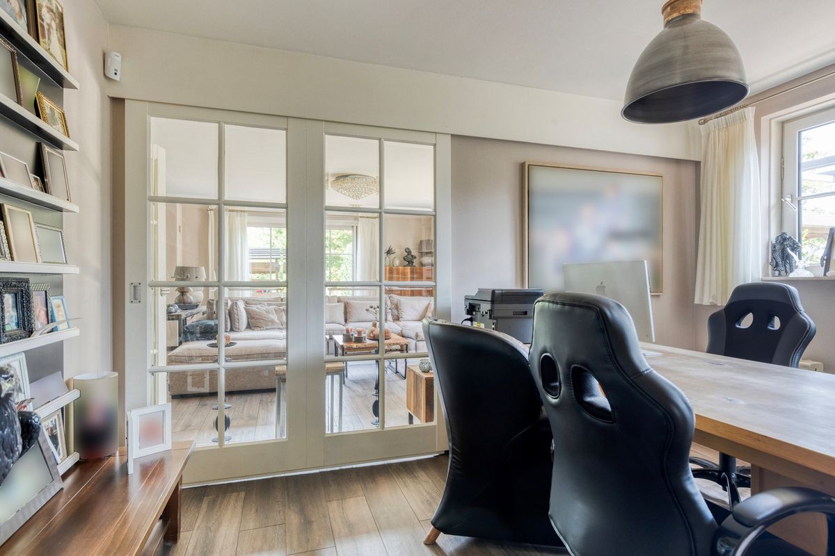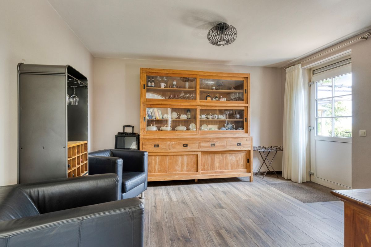 Ruime entree/hal met vide, toilet, grote leefkeuken met toegang tot terras, fijne werkkamer, royale woonkamer met gashaard en openslaande deuren naar buiten, praktische bijkeuken. Voorzien van plavuizen met vloerverwarming.