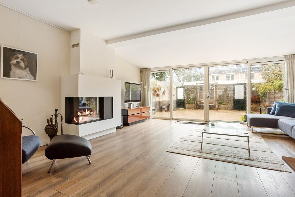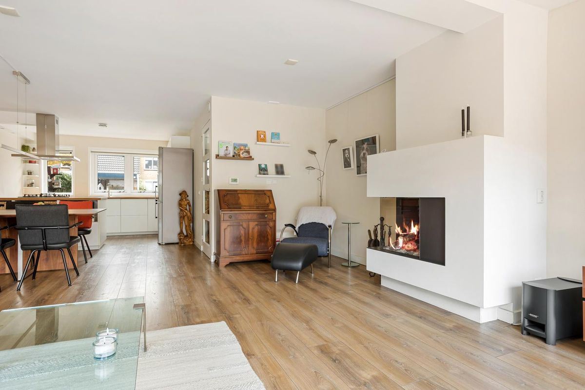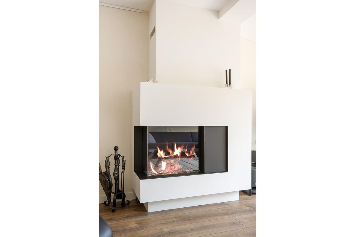 Aan de tuinzijde bevindt zich de royale, uitgebouwde woonkamer met een zee aan licht dankzij de grote raampartijen en schuifpui naar de zonnige tuin. De sfeervolle gashaard, strak afgewerkte wanden en de fraaie laminaatvloer met vloerverwarming zorgen voor een warm en sfeervol geheel.
