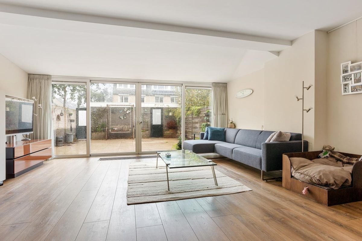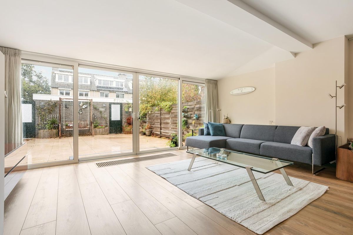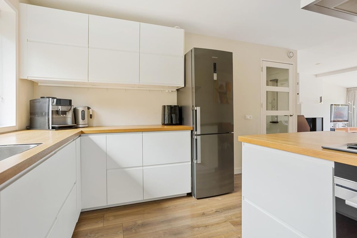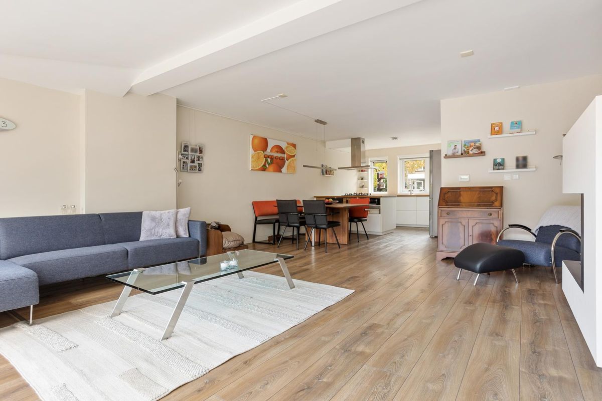 Aan de tuinzijde bevindt zich de royale, uitgebouwde woonkamer met een zee aan licht dankzij de grote raampartijen en schuifpui naar de zonnige tuin. De sfeervolle gashaard, strak afgewerkte wanden en de fraaie laminaatvloer met vloerverwarming zorgen voor een warm en sfeervol geheel.