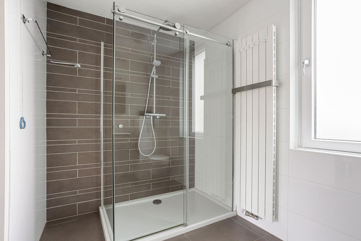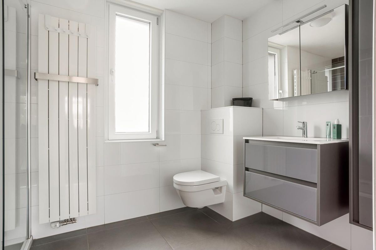 De moderne badkamer (2018) is voorzien van een inloopdouche, tweede toilet, stijlvol wastafelmeubel met lades en een extra zwevende kast.