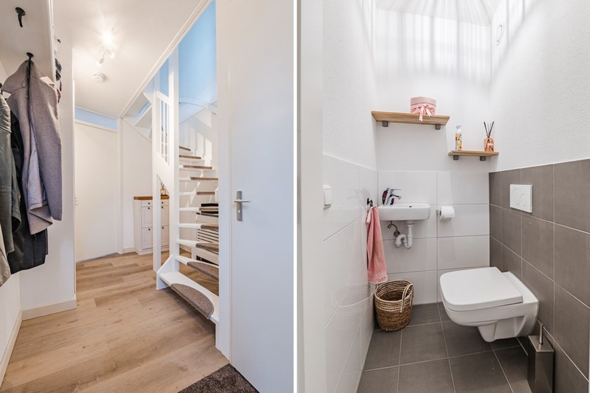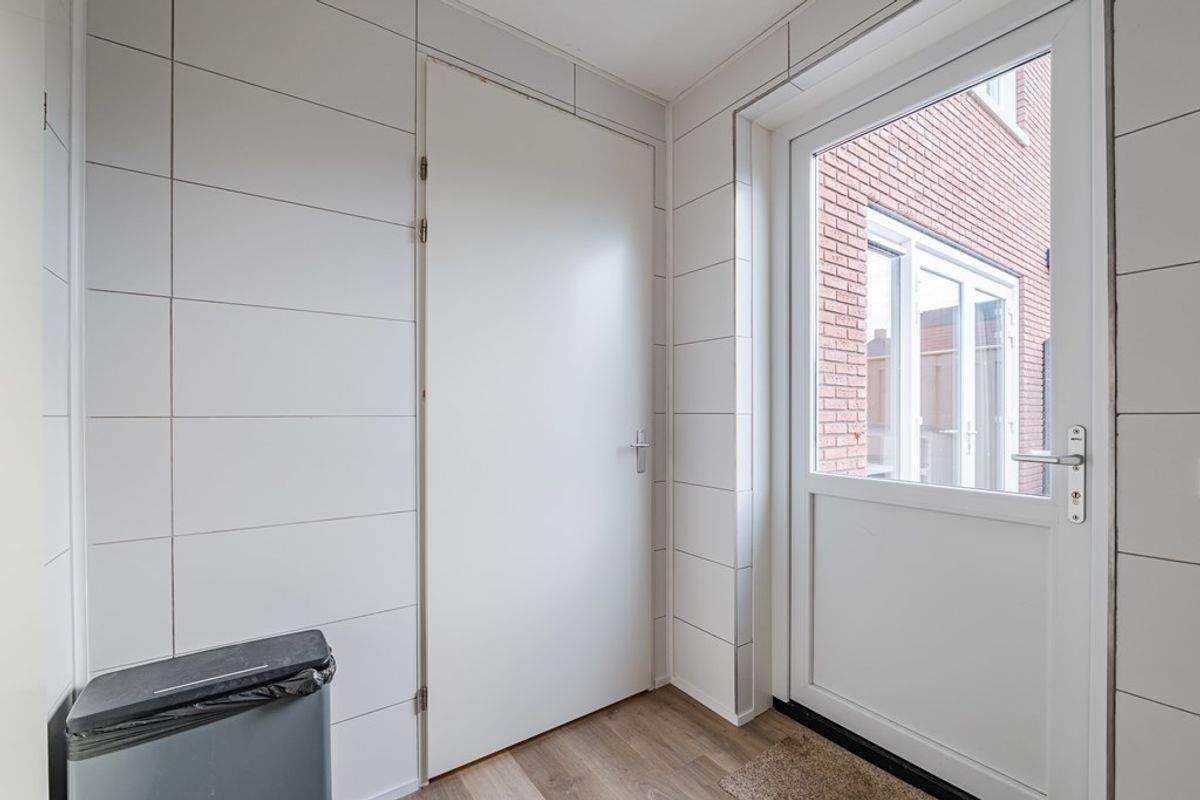 - Volledig betegelde bijkeuken met wasmachine-/droger aansluiting en deuren naar de tuin en naar de garage