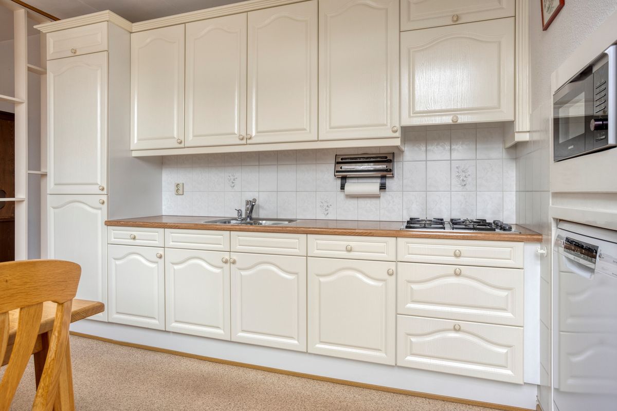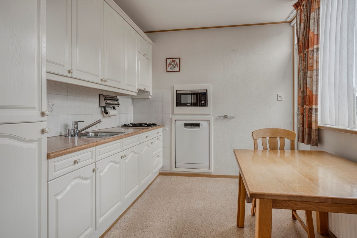 De dichte keuken is eenvoudig, maar netjes onderhouden en biedt toegang tot de achtertuin.