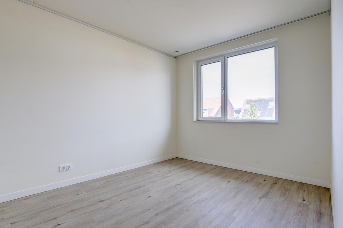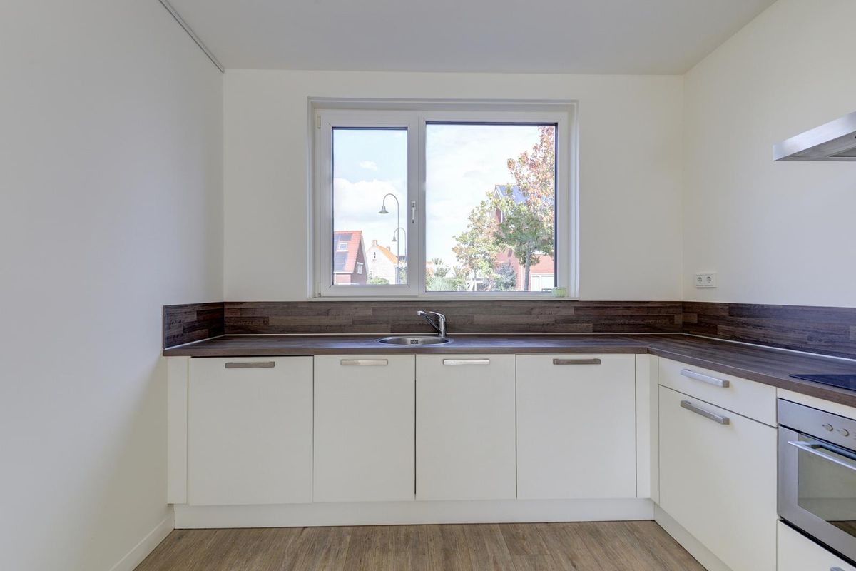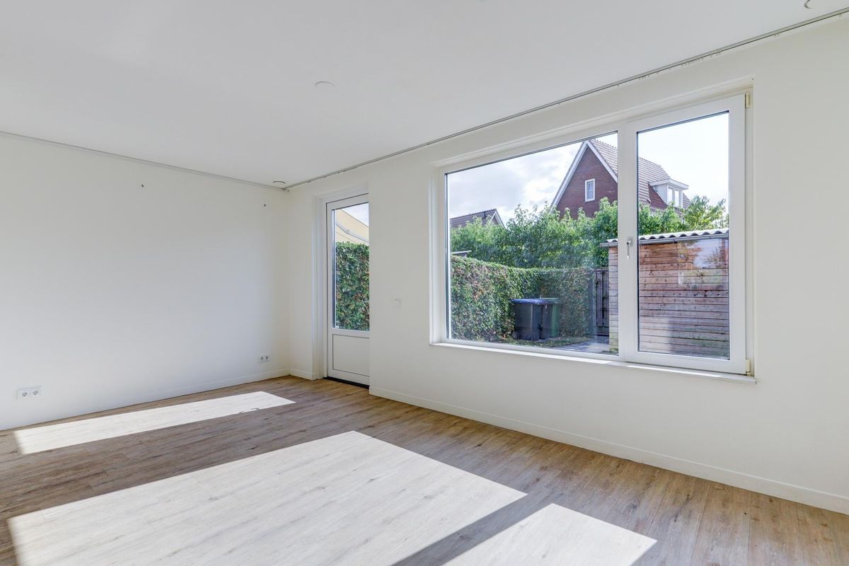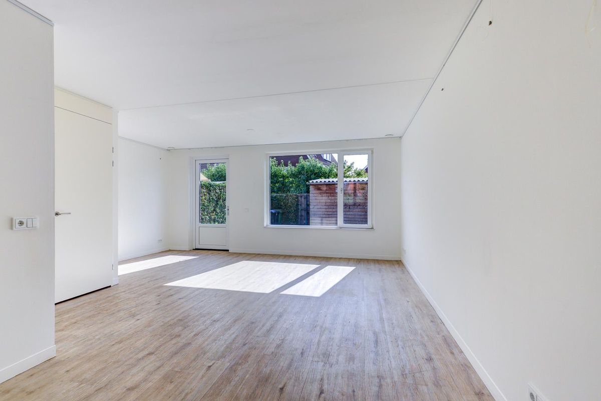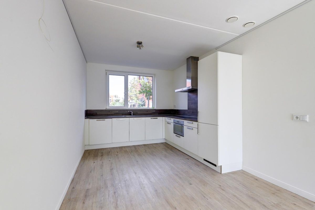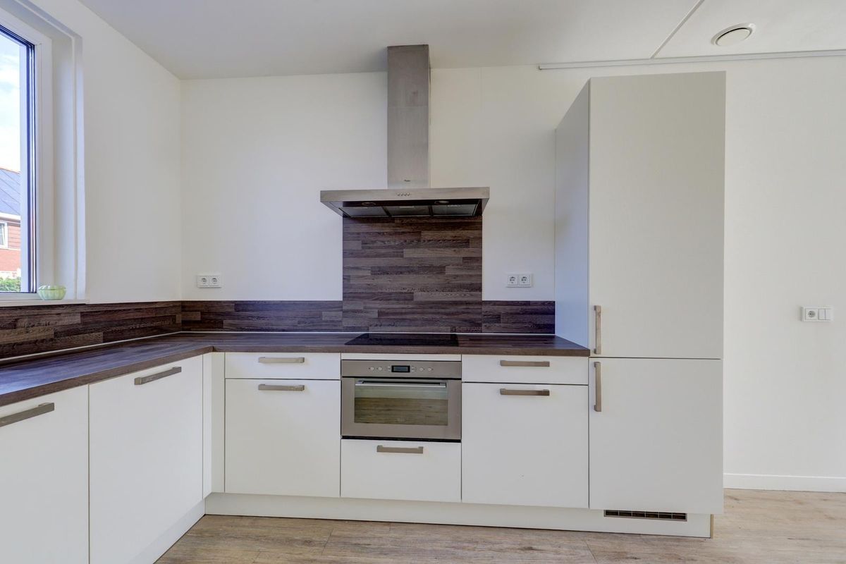U komt binnen via de voordeur in de hal met meterkast, toiletruimte en trapopgang. De deuren en wanden zijn fris wit gesausd, op de vloer ligt een doorlopende houtlook vloer (PVC/laminaat) die de gehele verdieping een rustige basis geeft, waardoor het eenvoudig is de woning geheel naar uw eigen stijl om te toveren. De woonkamer ligt aan de tuinzijde en is opvallend licht door het grote raam en de tuindeur. De wanden zijn strak afgewerkt en het vlakke plafond oogt modern. Door de rechthoekige vorm is er veel ruimte voor een royale zithoek én eethoek. Aan de voorzijde bevindt zich de open keuken in L-opstelling. De keuken is uitgevoerd met matwitte fronten, een donker houtlook werkblad en achterwand, en een rvs-schouwkap. Ingebouwd zijn o.a. een oven, kookplaat en vaatwasser, de hoge kast biedt plek aan koel/vries. Het raam in de voorgevel zorgt voor prettig daglicht tijdens het koken.