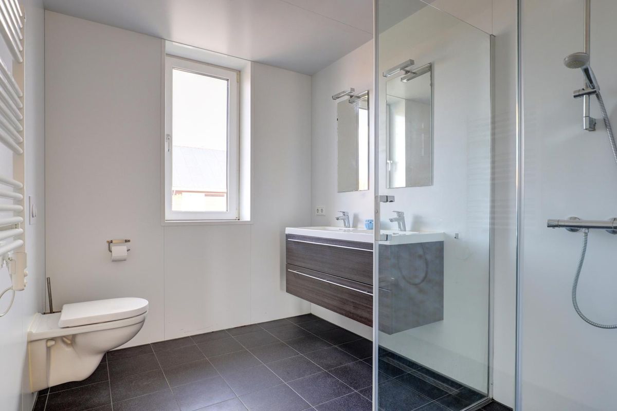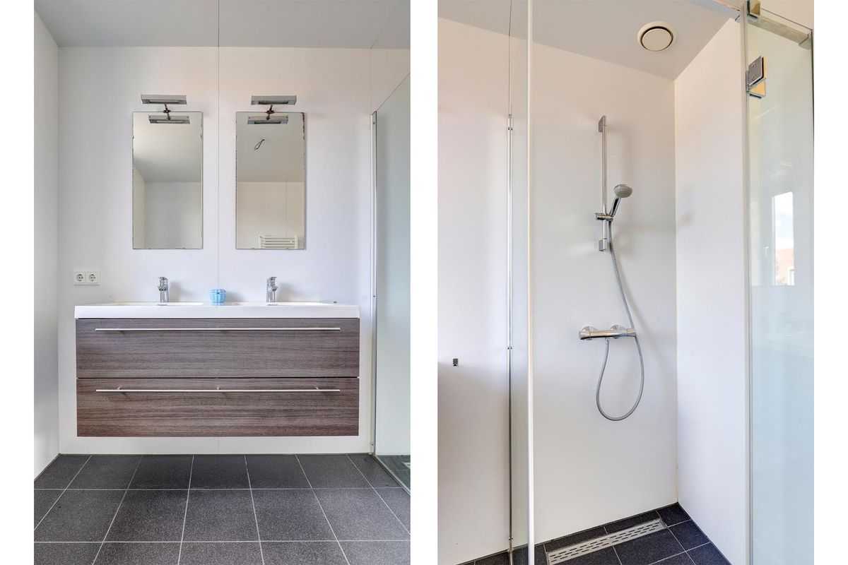 De overloop geeft toegang tot drie slaapkamers van goede maat. Door de rechte geveldaken zijn de kamers praktisch in te delen. De afwerking is neutraal, met lichte wanden en witte kozijnen. De badkamer is modern en compleet met antraciet vloertegels, strakke witte wanden, een inloopdouche met glazen wand, zwevend toilet, dubbele wastafelmeubel in donker houtdecor met spiegelverlichting en een handdoekradiator. Dankzij het raam is er daglicht en natuurlijke ventilatie.