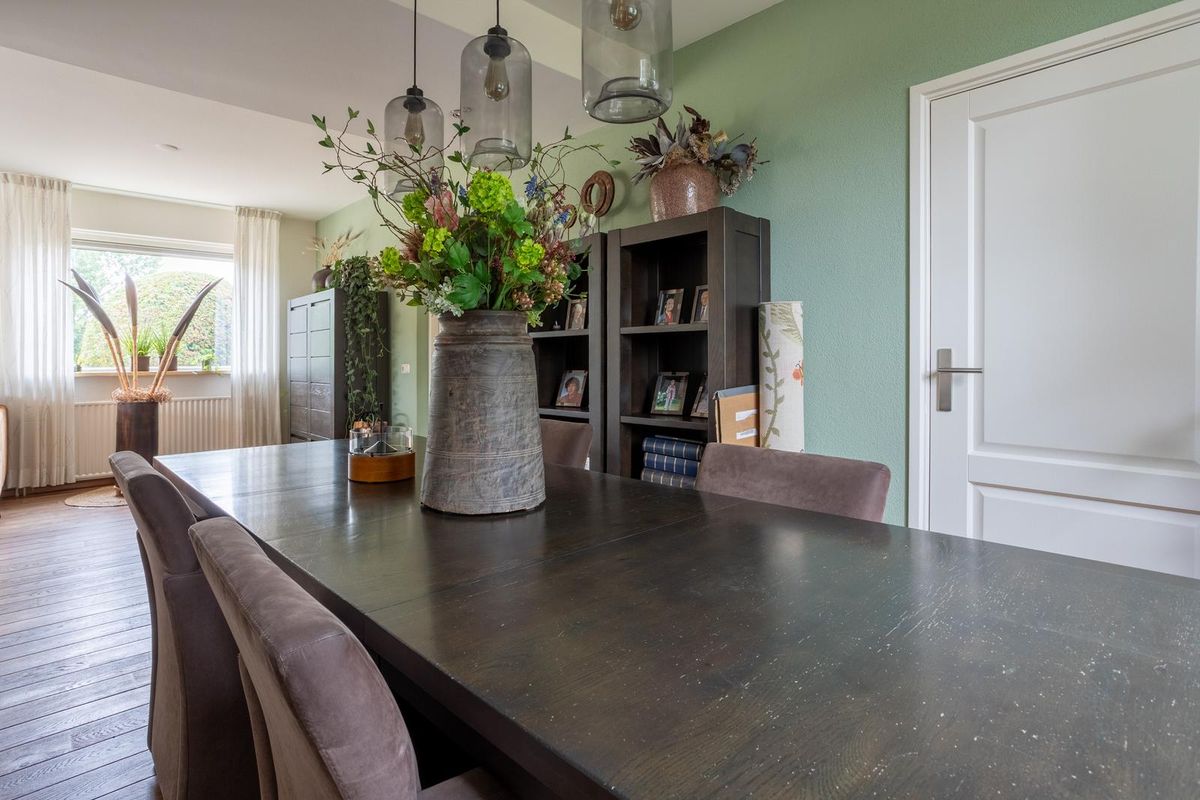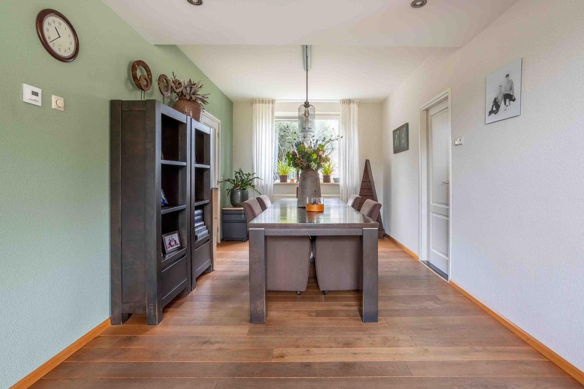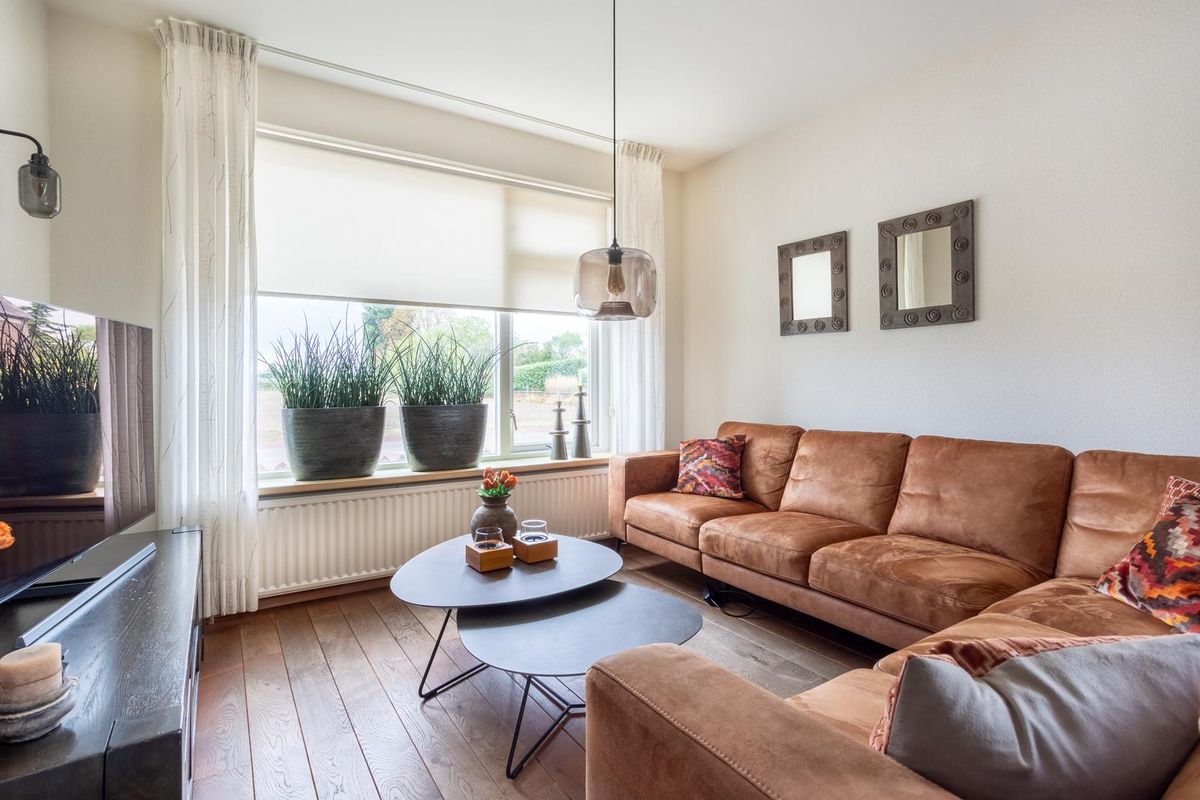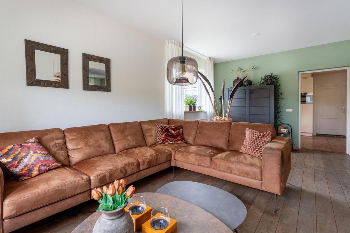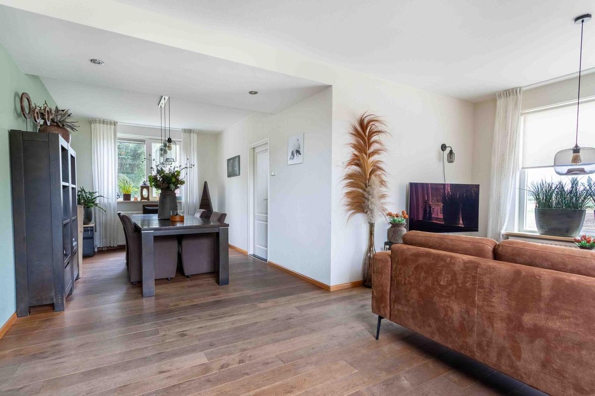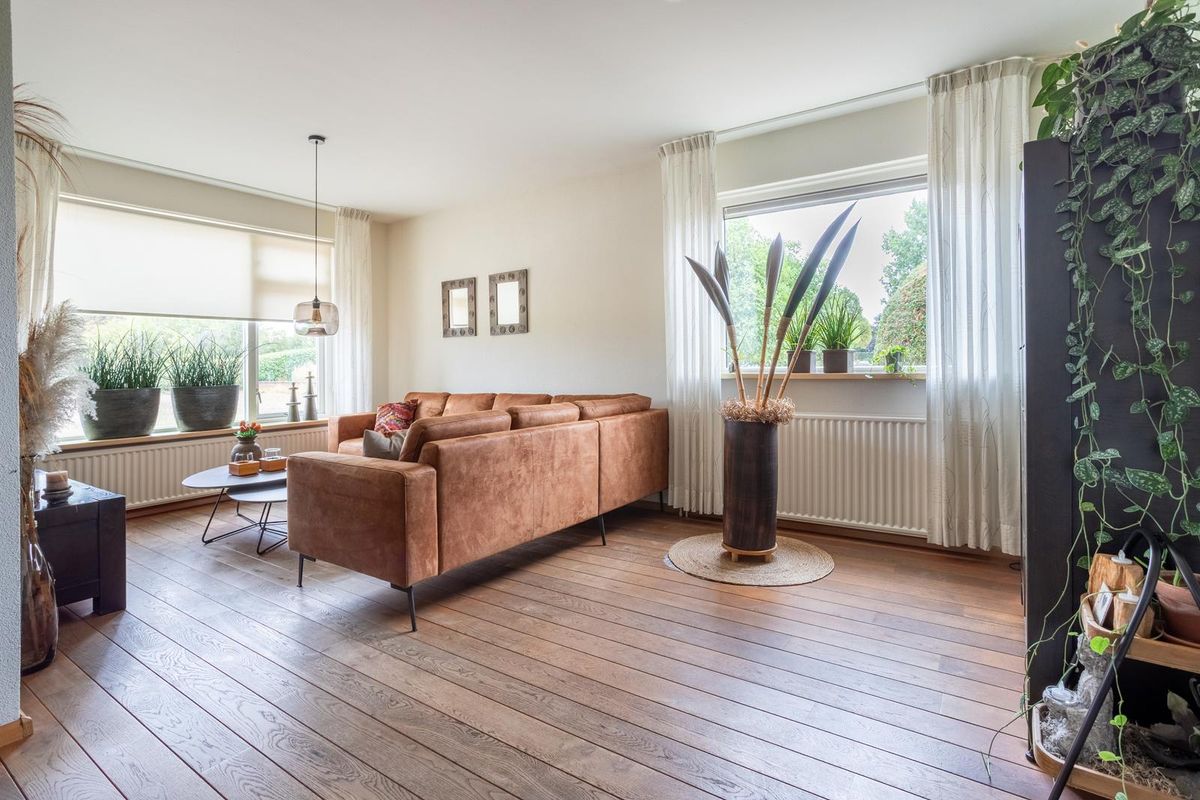 - L-vormige woonkamer met houten vloer en prettig uitzicht over het erf;