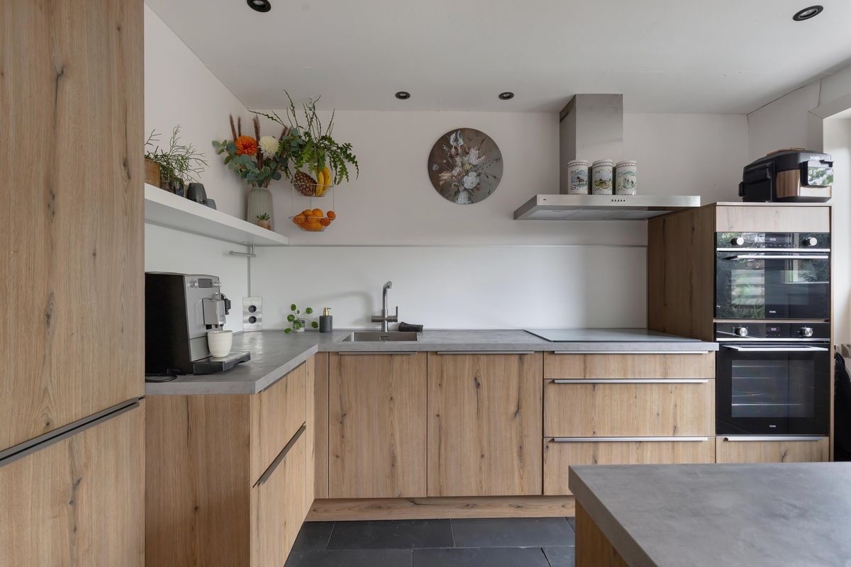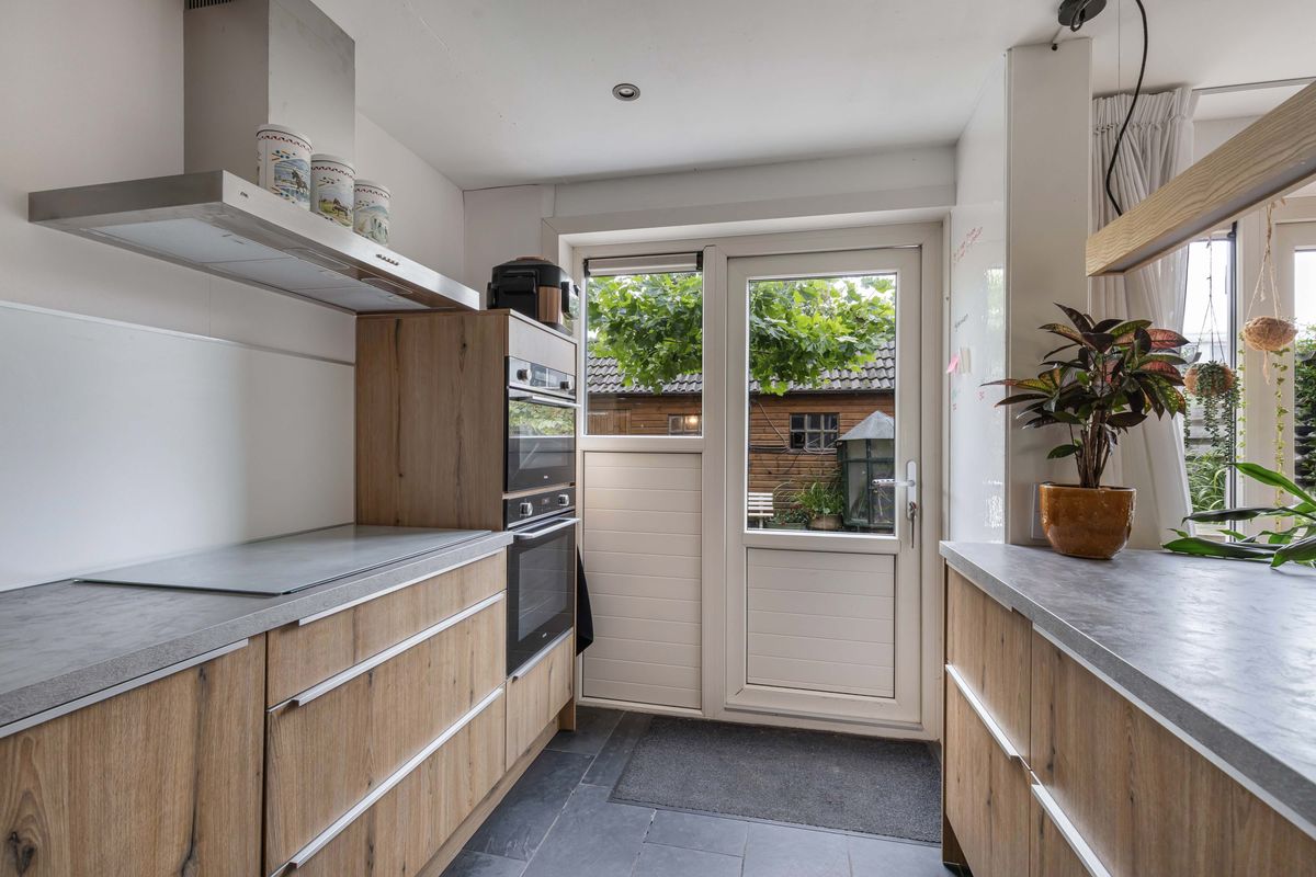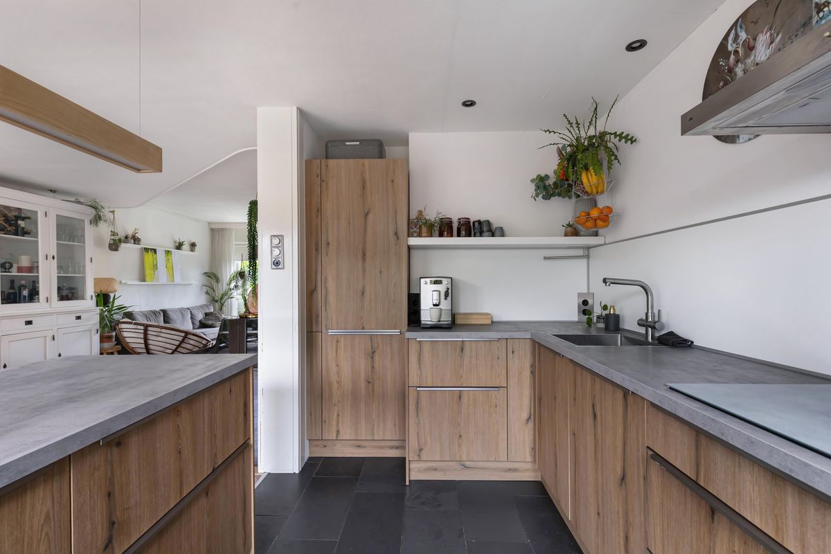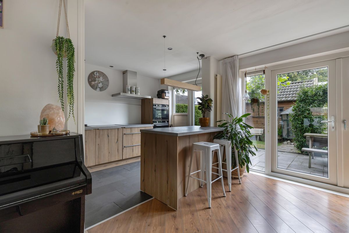 De doorzonwoonkamer is een fijne plek om samen te komen, waarbij de openslaande deuren de verbinding met de zonnige achtertuin op het zuiden versterken. De moderne keuken is ingericht met een centraal eiland, voorzien van praktische lades aan de ene kant en een barfunctie met ruimte voor krukken aan de andere kant, ideaal om te koken én gezellig samen te zijn.