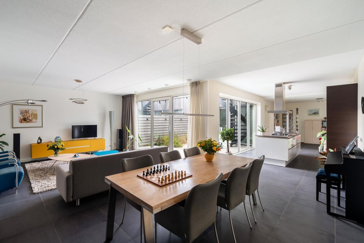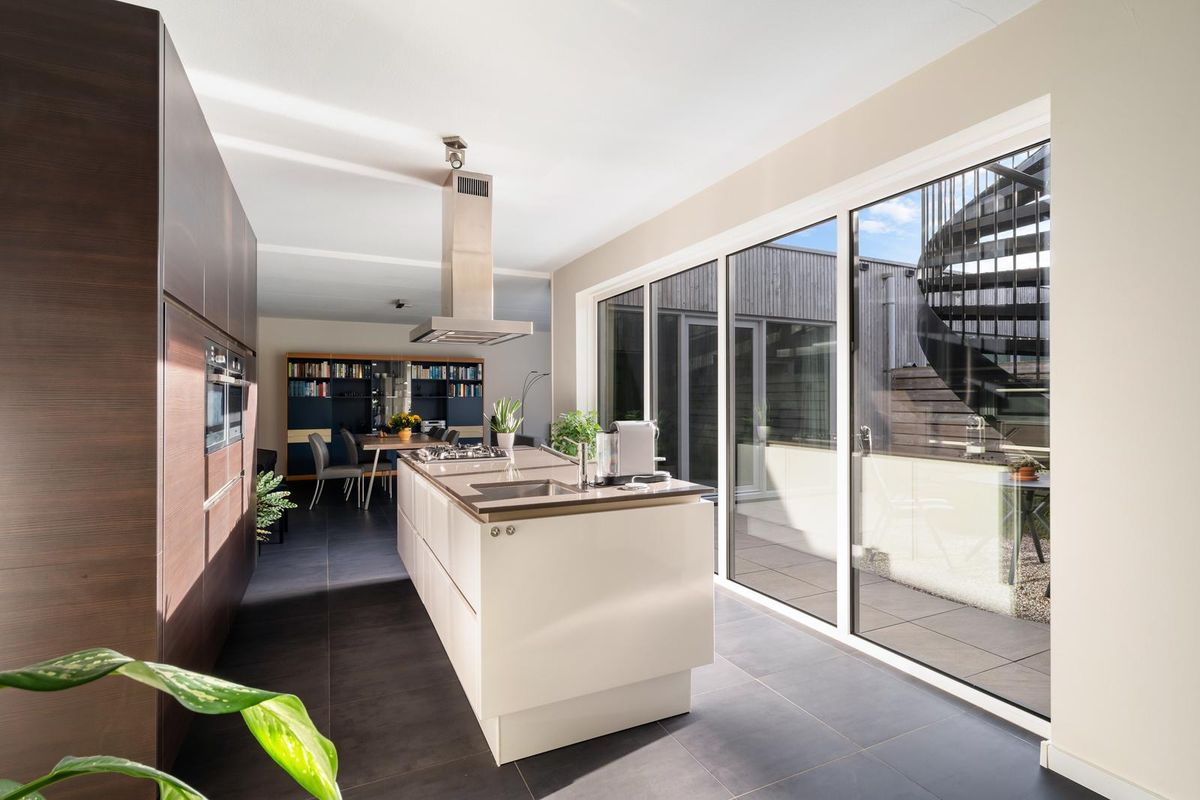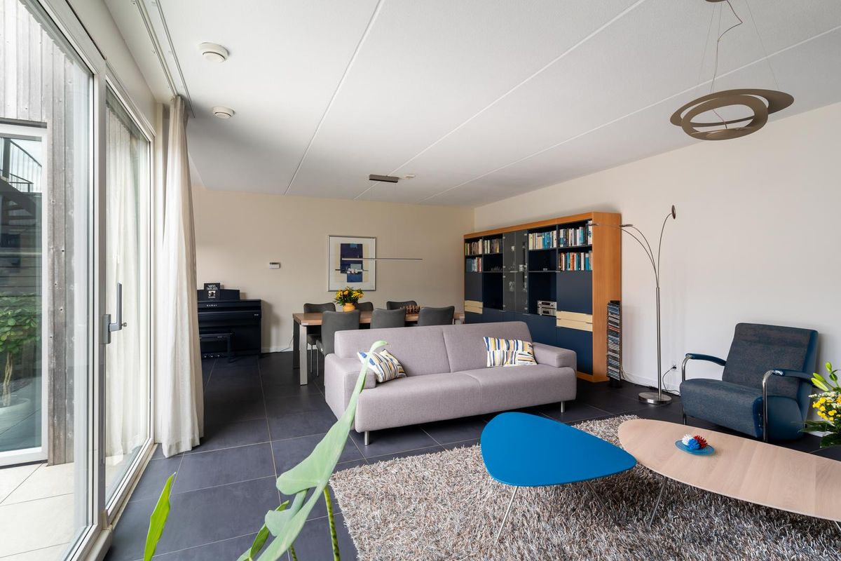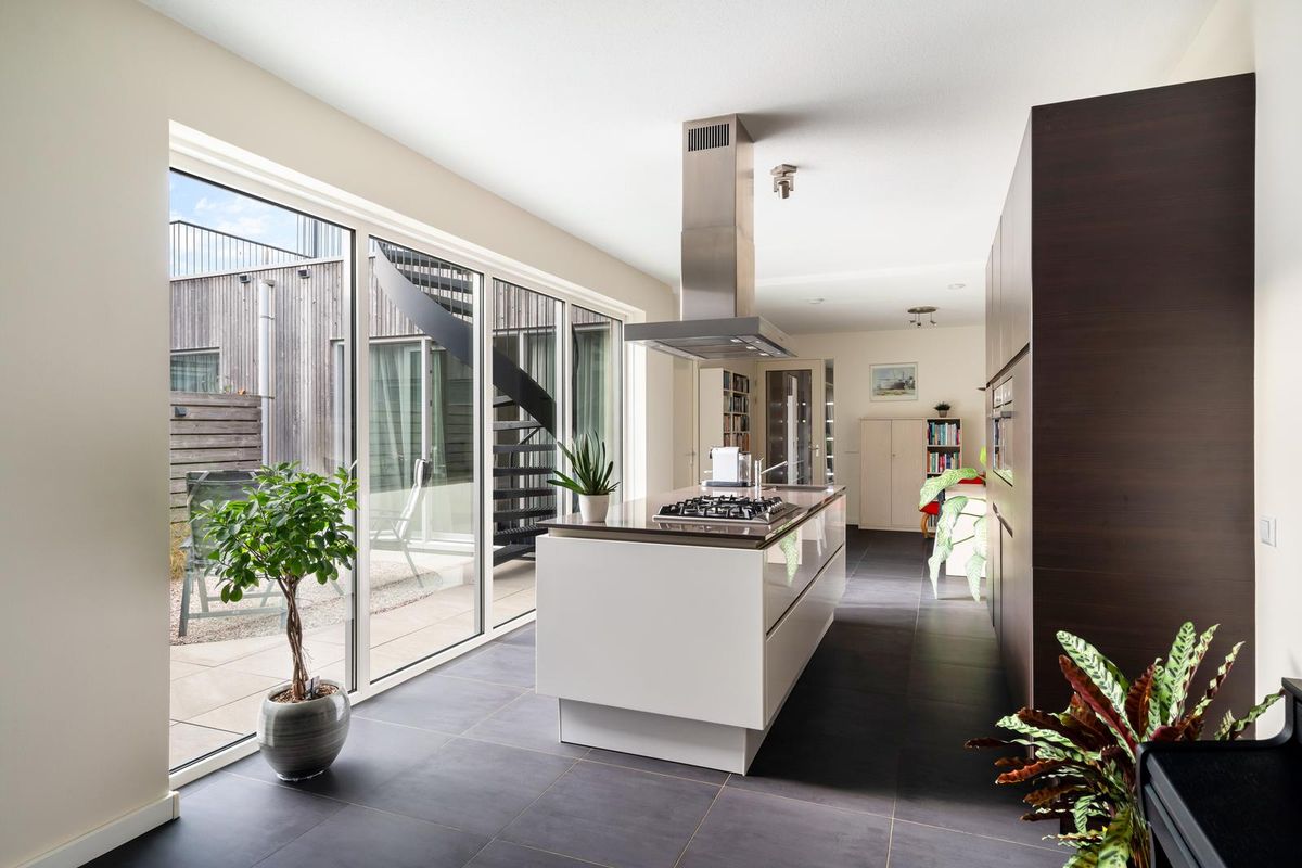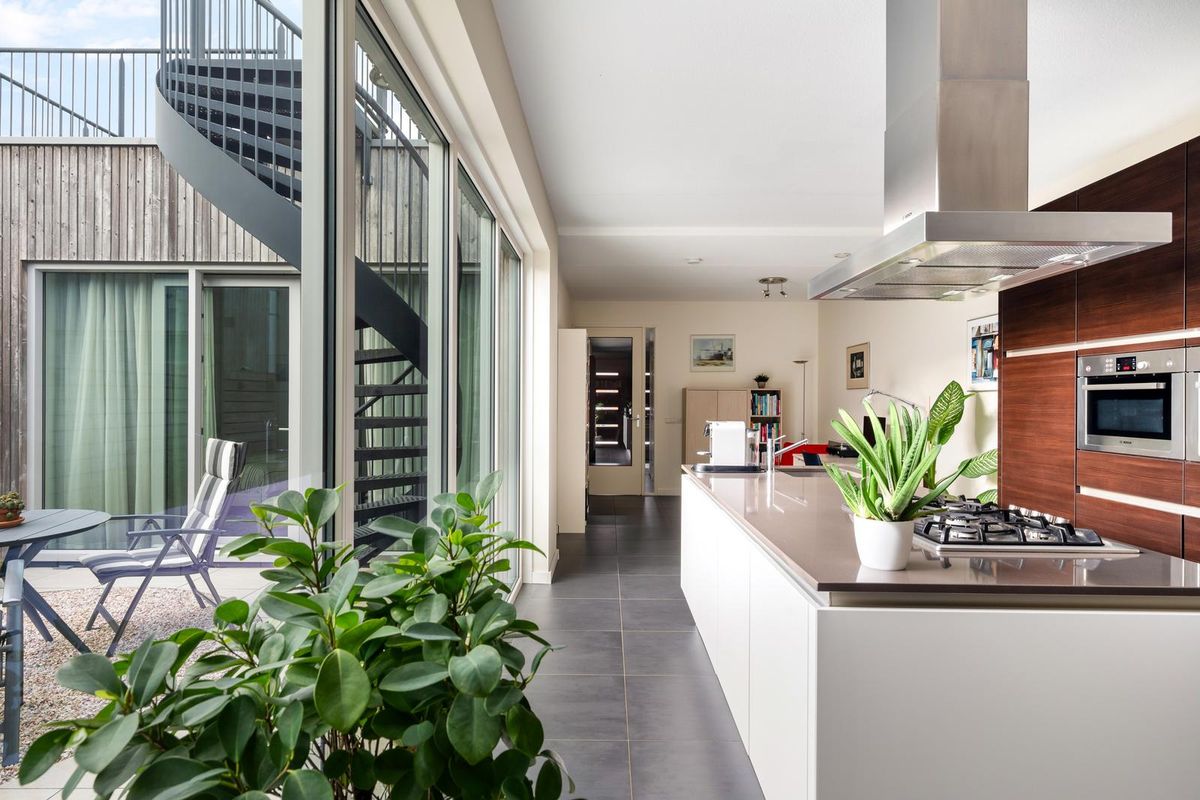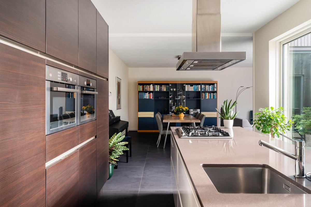 Fraai aangelegde voortuin met groenborders aan de zijkanten en de mogelijkheid om meerdere auto’s direct voor de deur op eigen terrein te parkeren. Entree/hal met meterkast, modern toilet en aparte was-/stookruimte met de opstelplaatsen van de wasmachine, CV-ketel en WTW-installatie. De keuken heeft een moderne opstelling met een kook-/spoeleiland en inbouwapparatuur (koelkast, vriezer, vaatwasmachine, 5-pits gaskookplaat, oven, magnetron en afzuigkap). De L-vormige indeling van de woonkamer en keuken zorgt ervoor dat er vanuit de keuken goed zicht is op zowel de living als de patiotuin en dat de ruimte aangenaam licht is. De woon- en eetkamer hebben een mooie afmeting, met een breedte van maar liefst 8.34 meter. Via de schuifpui is de eveneens fraai aangelegde patiotuin toegankelijk, met buitenkraan, betegeld terras, grindterras en voldoende ruimte voor groen. Er is een wenteltrap naar het betegelde dakterras.