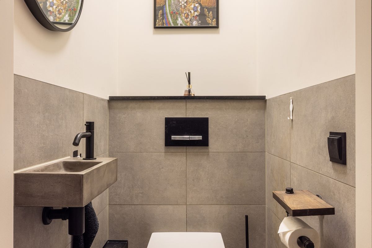 De badkamer is volledig gemoderniseerd en met oog voor detail afgewerkt. De ruimte is geheel betegeld en voorzien van een ligbad met regendouche en glazen wand, een stijlvol wastafelmeubel met waskom, een zwevend toilet en een designradiator. De combinatie van neutrale tinten en zwarte accenten zorgt voor een moderne, luxe uitstraling.