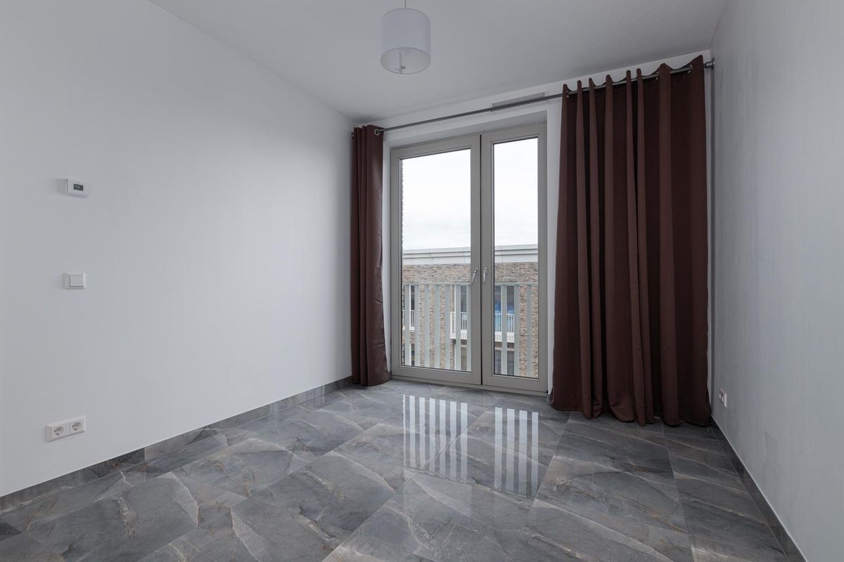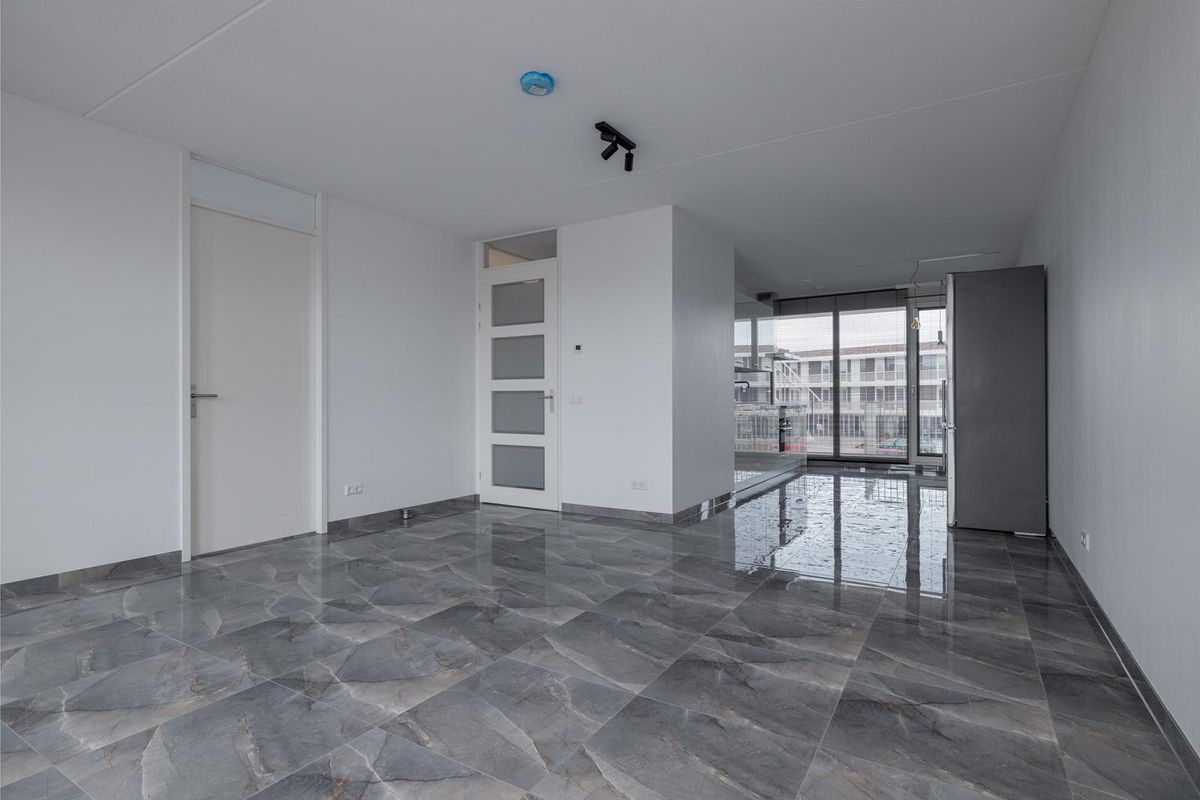 Toegang tot de woonkamer, gelegen is aan de achterzijde van de woning. Een heerlijke lichte ruimte dankzij de vele Franse balkons, met uitzicht op de winkels. Vanuit de woonkamer is de luxe open keuken te bereiken. De keuken is uitgevoerd in wit met een zwart blad. Deze is voorzien van een kookplaat met afzuigkap, vaatwasser, een combi-oven en een vrijstaande koel-/vriescombinatie. Vanuit de woonkamer is tevens de tweede slaapkamer te bereiken van circa 13m2. Ook deze kamer is voorzien van een grote raampartij welke uitkijkt op de winkels.