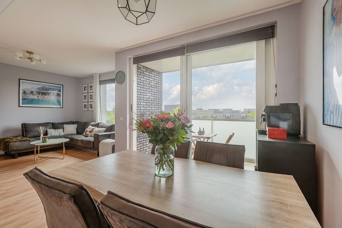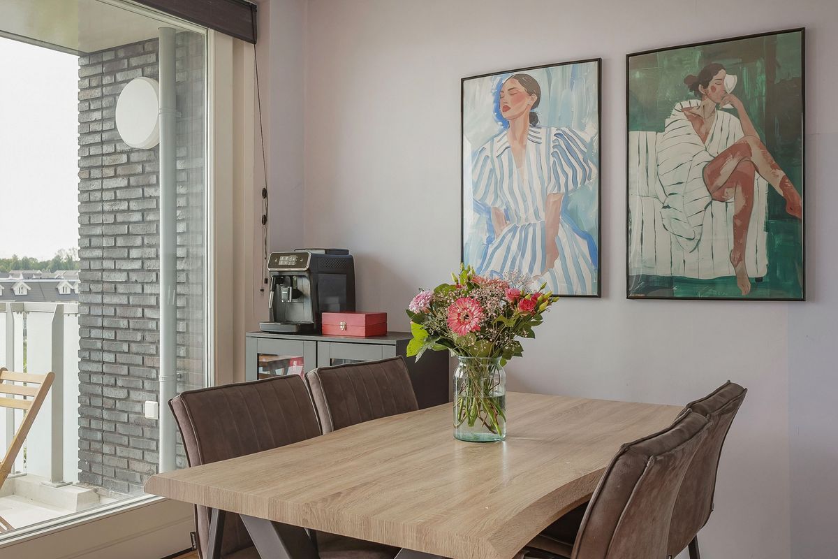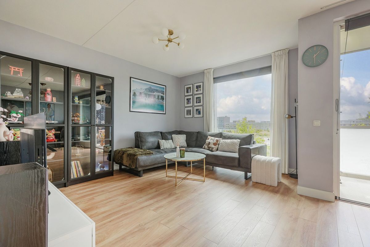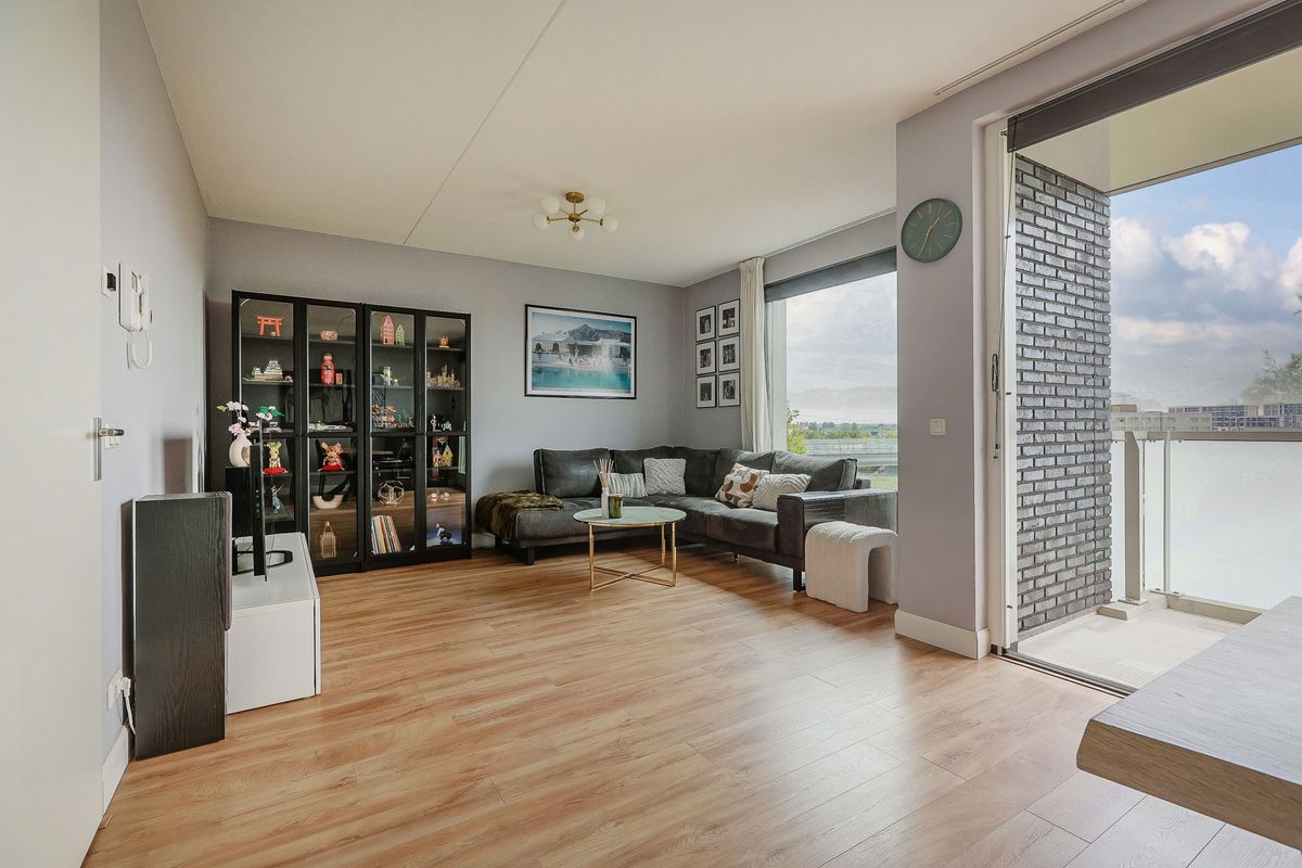 De lichte woonkamer vormt het hart van de woning. Dankzij de grote ramen geniet je hier van veel daglicht en een mooi vrij uitzicht. Vanuit de woonkamer loop je zo het zonnige balkon op het zuiden op, een heerlijke plek om te ontspannen.