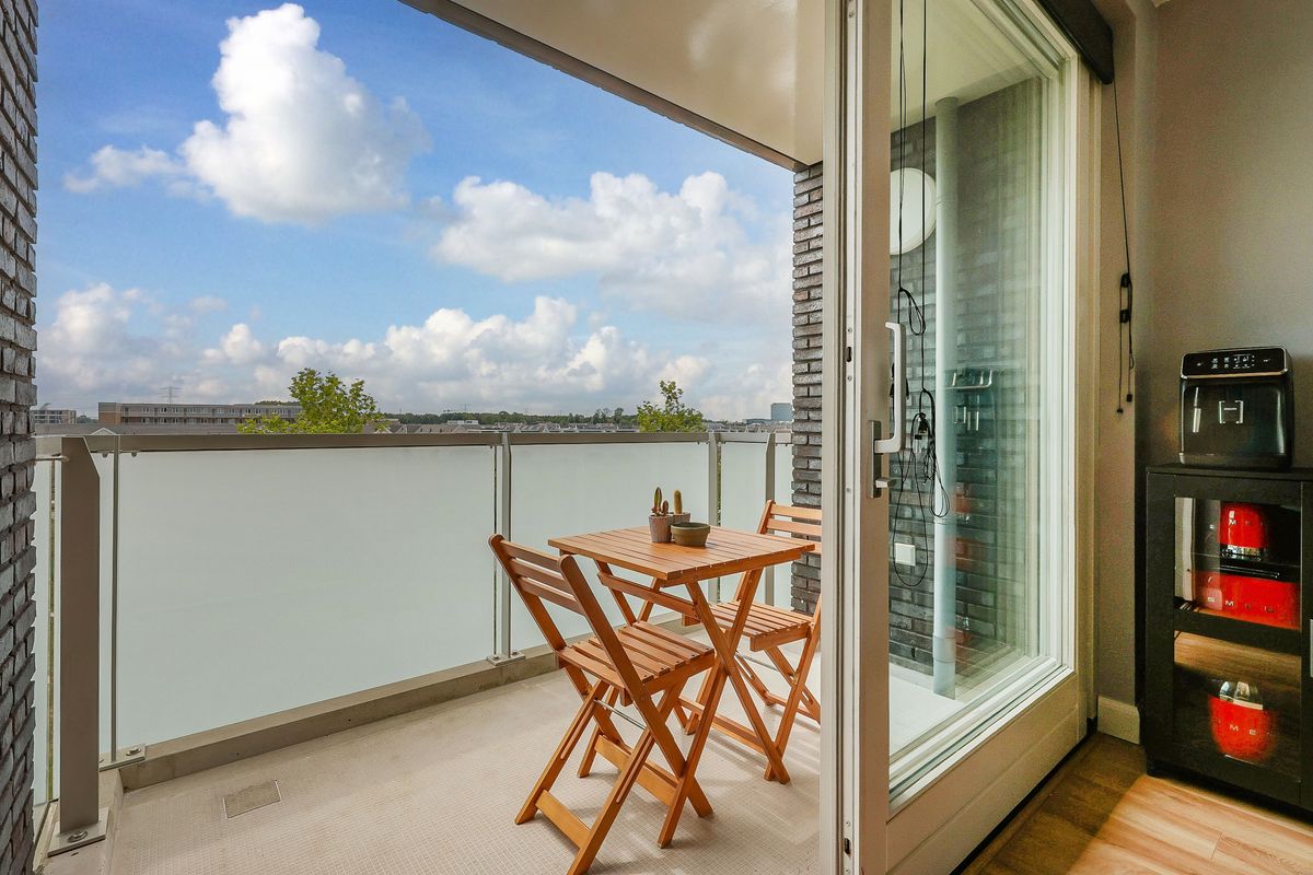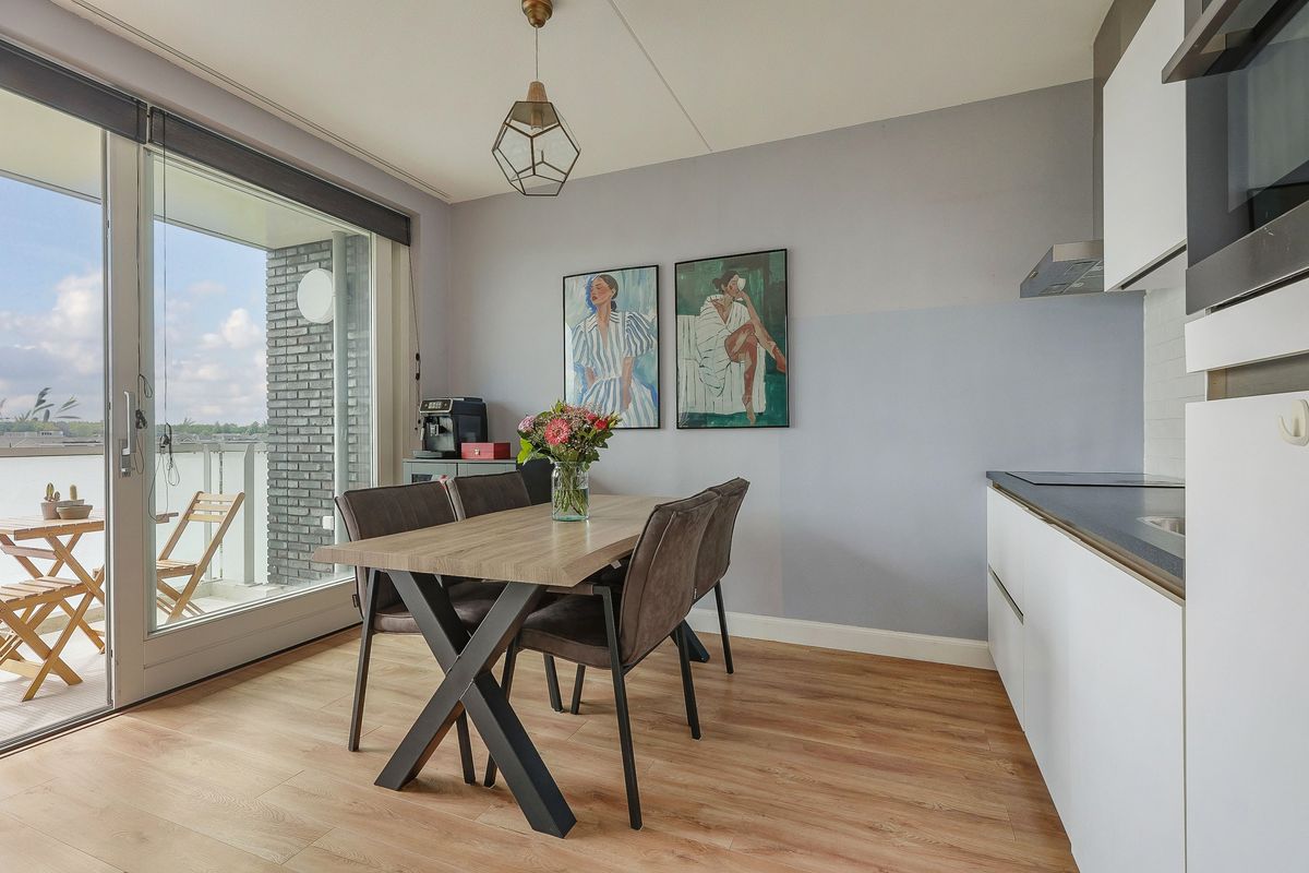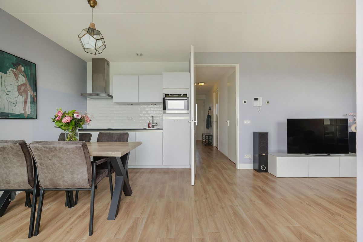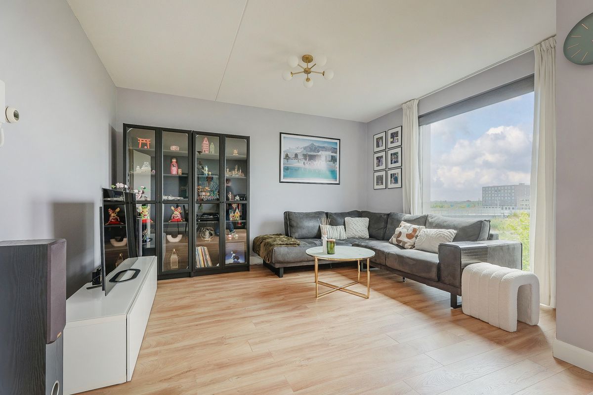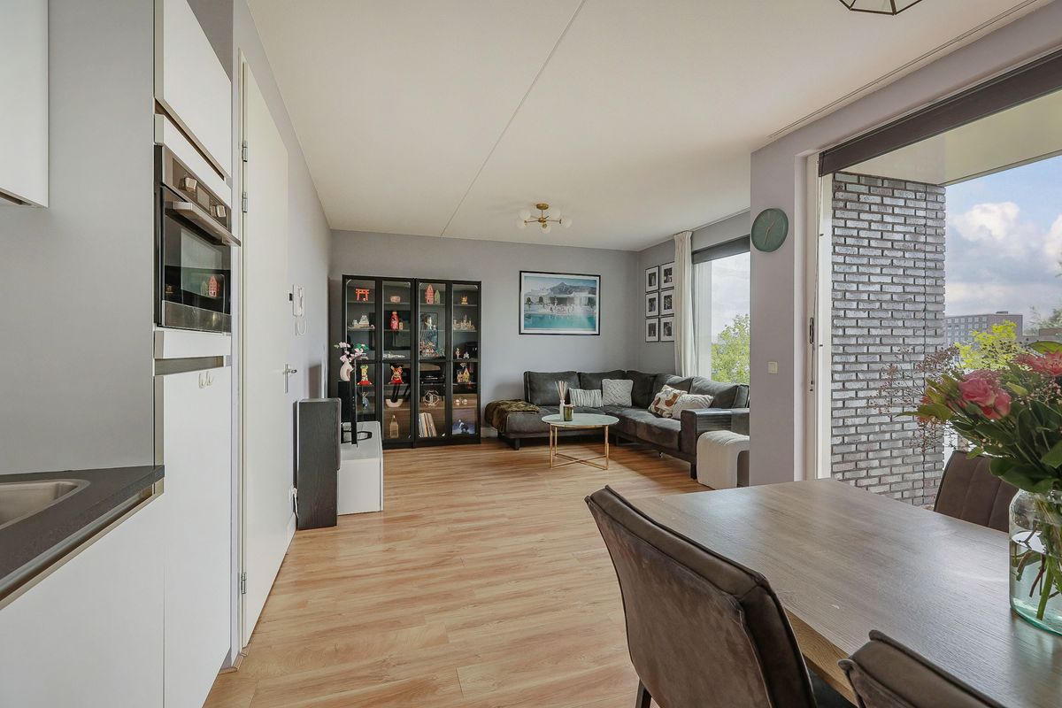 De lichte woonkamer vormt het hart van de woning. Dankzij de grote ramen geniet je hier van veel daglicht en een mooi vrij uitzicht. Vanuit de woonkamer loop je zo het zonnige balkon op het zuiden op, een heerlijke plek om te ontspannen.