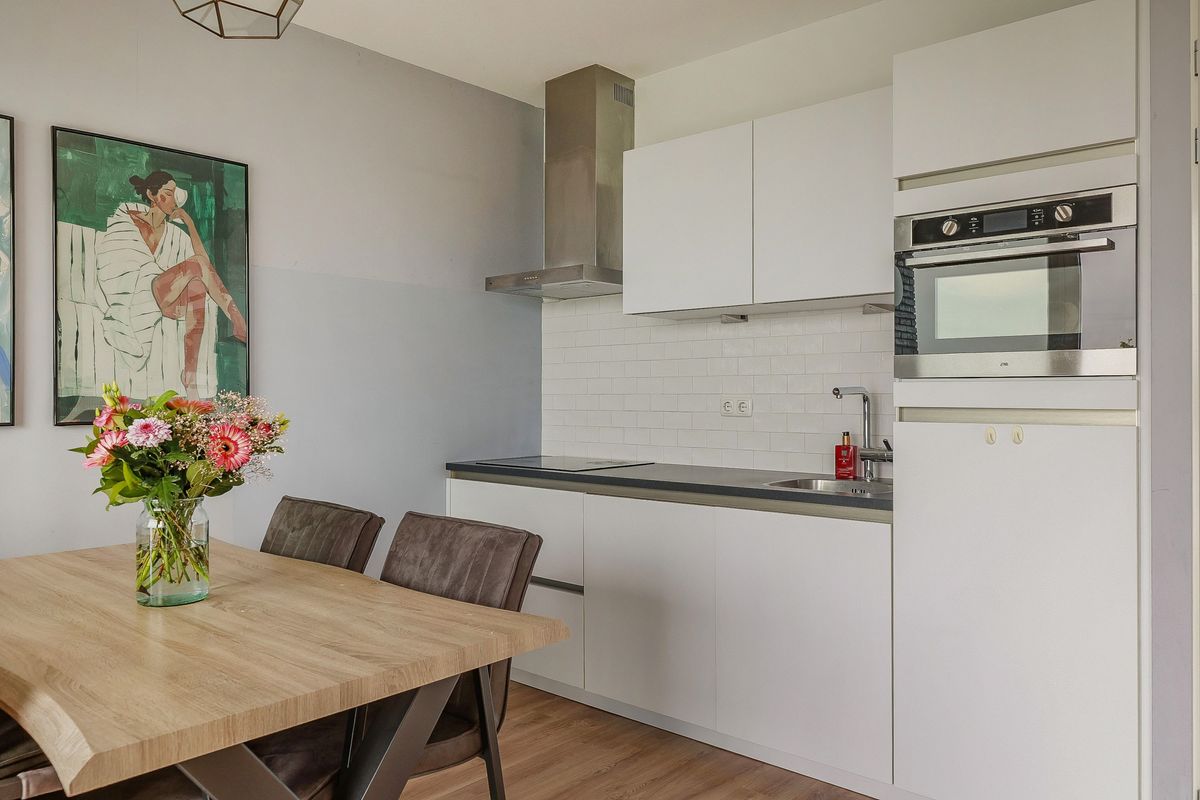 De moderne open keuken is strak afgewerkt en voorzien van alle gemakken, waaronder een inductiekookplaat, combimagnetron, vaatwasser, afzuigkap en koelkast.