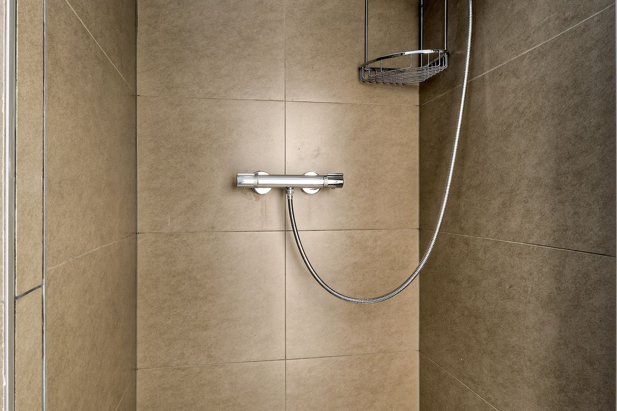 De slaapkamer ligt aan de rustige achterzijde en biedt voldoende plek voor een tweepersoonsbed en kastruimte. Aangrenzend bevindt zich de badkamer, voorzien van zowel een ligbad als een separate douche — een fijne luxe in het stadsleven.