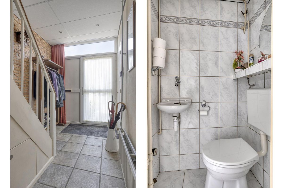 Binnenkomst in de ruime hal met vernieuwde meterkast, praktische trappenkast en toilet met fonteintje.