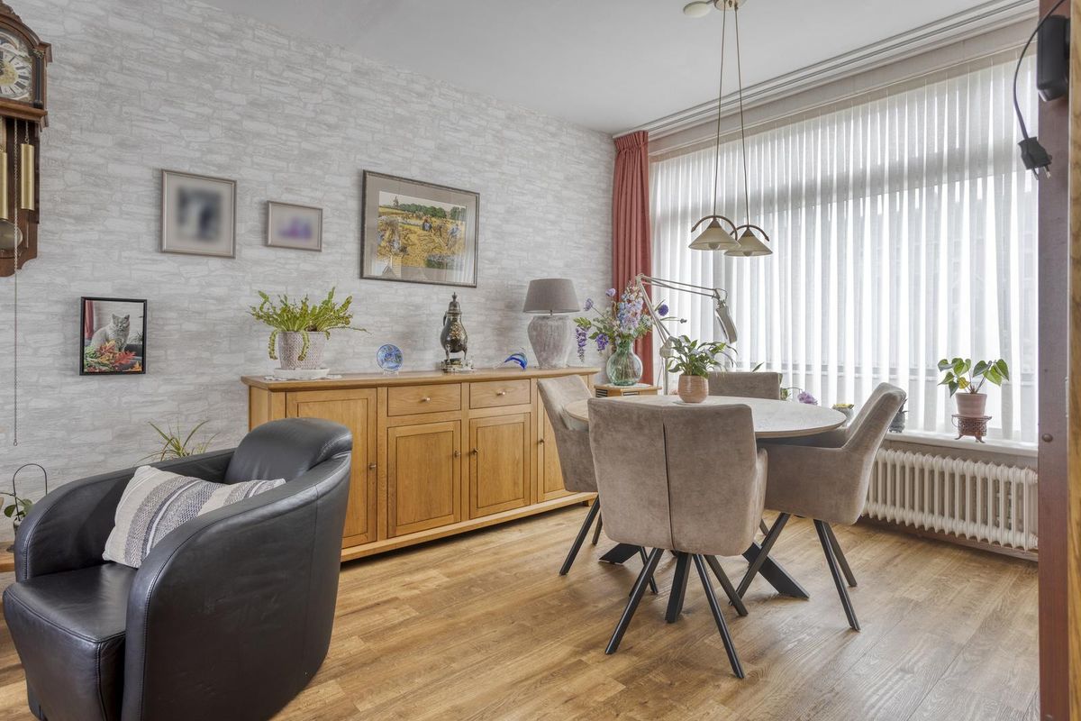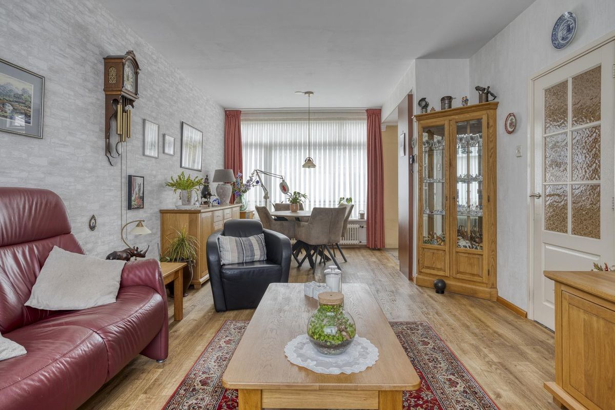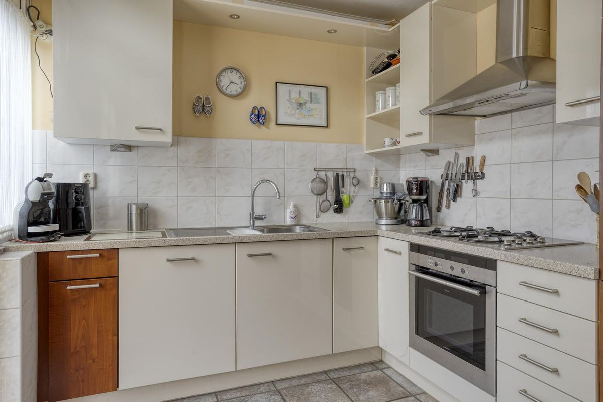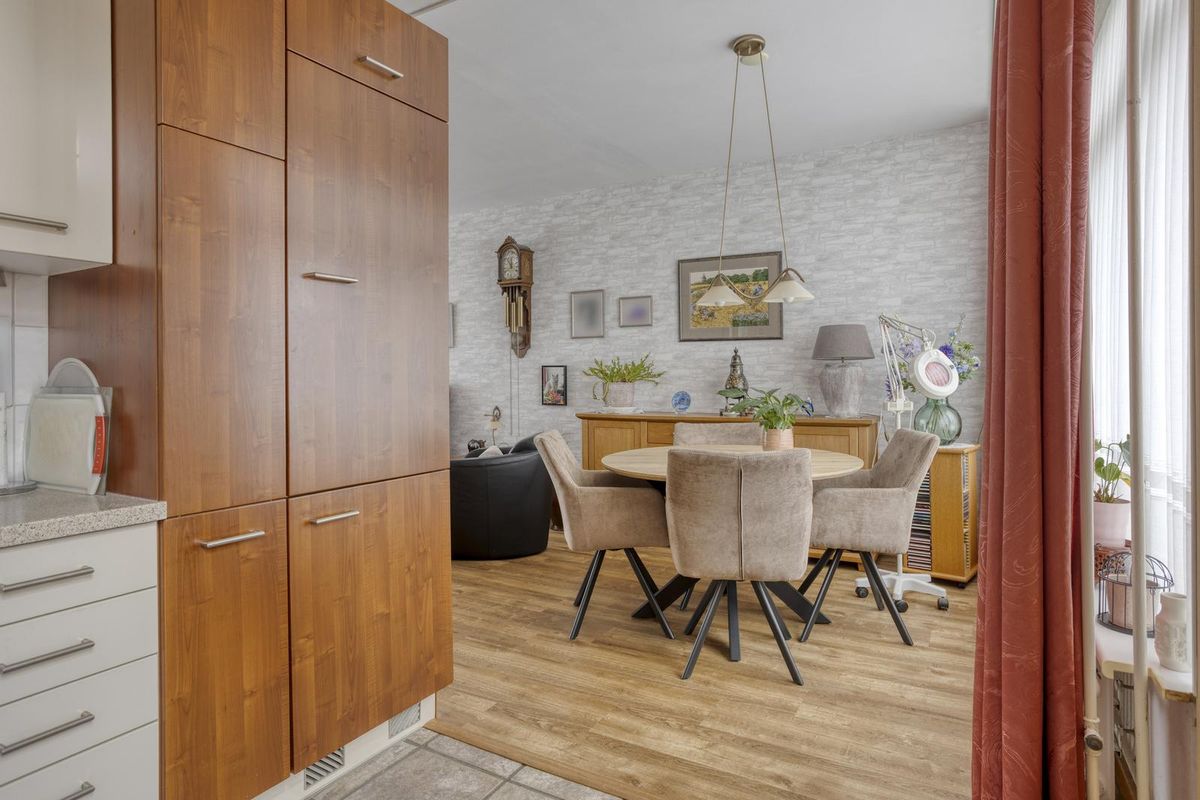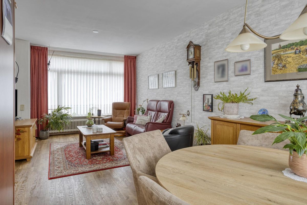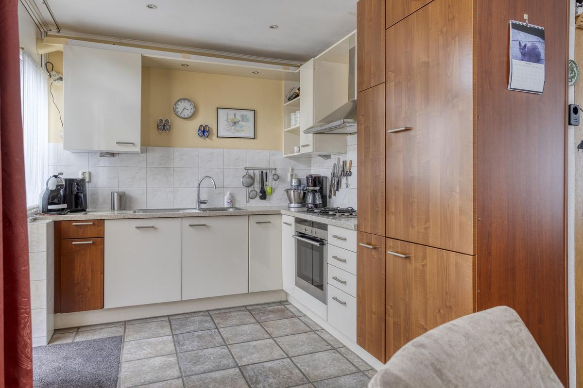 De woonkamer met half open keuken heeft door de grote raampartijen een aangename hoeveelheid licht en is afgewerkt met een PVC vloer. De nette keuken is in hoekopstelling geplaatst en voorzien van inbouwapparatuur zoals 4pits gaskookplaat, afzuigkap, oven, koelkast, vriezer en vaatwasmachine. Vanuit de keuken is de tuin en de stenen berging bereikbaar.