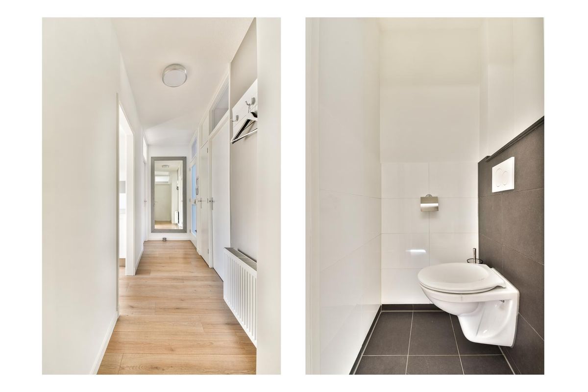 Entree/hal met meterkast, modern betegeld toilet v.v. wandcloset en toegang tot alle vertrekken. De woonkamer ligt aan de voorzijde en biedt ruim voldoende plek voor een living en eethoek. Via de hal is er toegang tot de aan de achterzijde gelegen keuken, welke beschikt over een koel-vriescombinatie, een vaatwasser, een combi-oven/-magnetron, een vierpits gaskookplaat, een afzuigkap en de wasmachine-aansluiting. Door de opstelling aan twee kanten is er veel bergruimte. Verder is de keuken afgewerkt met inbouwspots. Via de keuken is er toegang tot de badkamer. De badkamer is modern afgewerkt en beschikt over een douche, een wastafel met meubel en een designradiator.