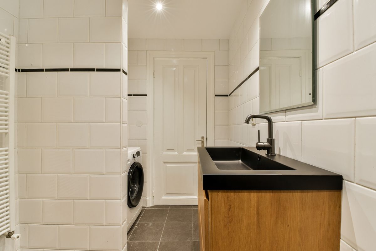 Luxe badkamer voorzien van een inloopdouche, ligbad, wastafelmeubel, designradiator en aansluitingen voor de wasmachine/droger.