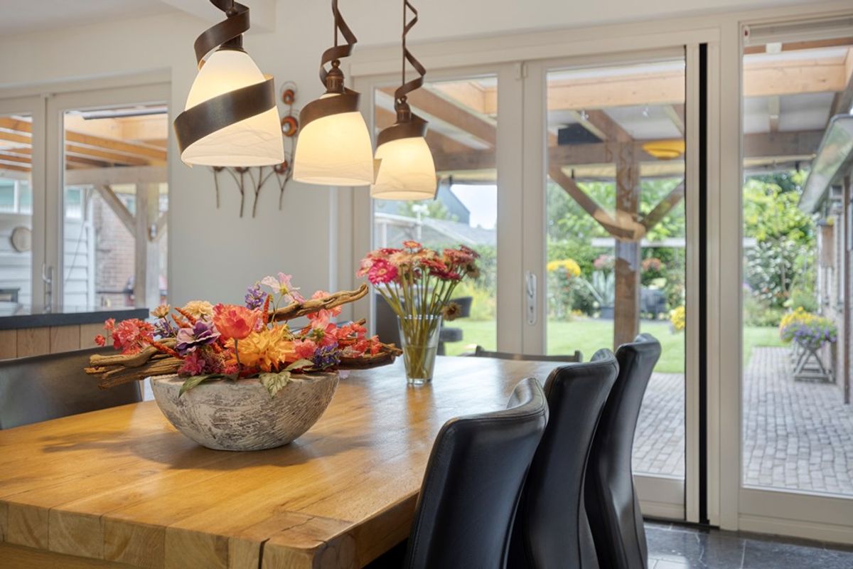 • Woonkamer (met open keuken): strakke muren en schuurwerkplafond. Door de grote raampartijen aan de voorzijde van de woning en de 2x dubbele tuideuren aan de achterzijde is de woonkamer lekker licht. De toegangsdeur naar de woonkamer is eveneens gezet met fraai glas-in-lood.