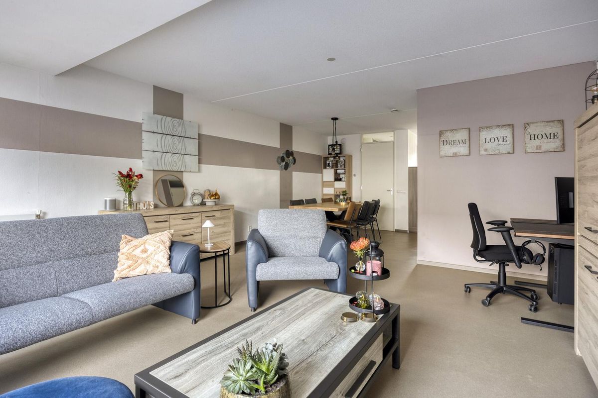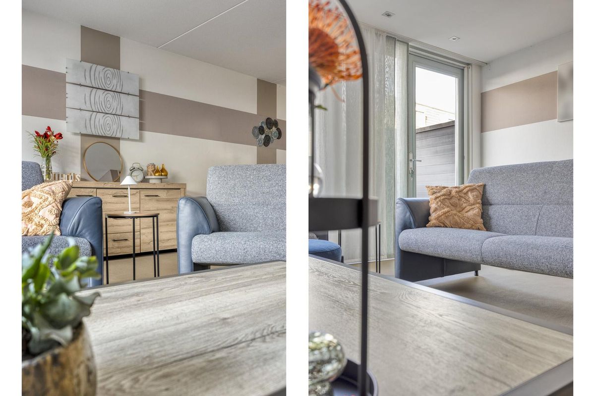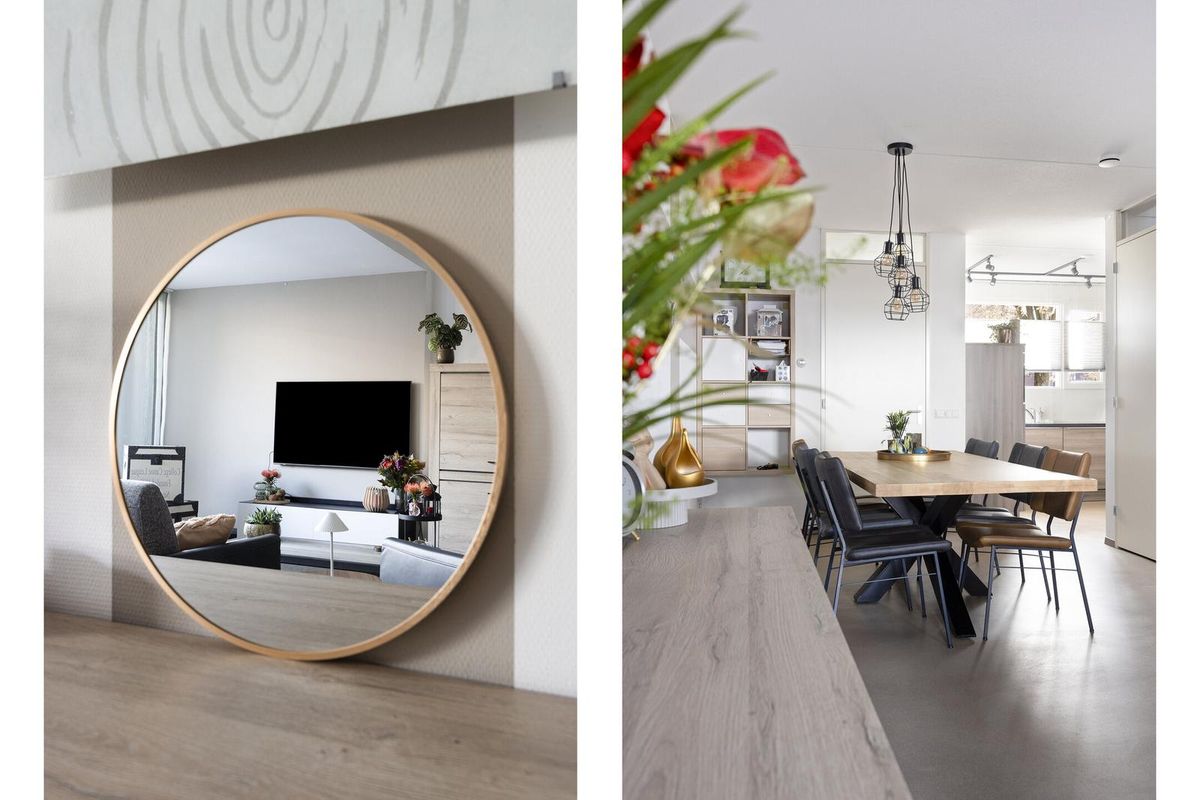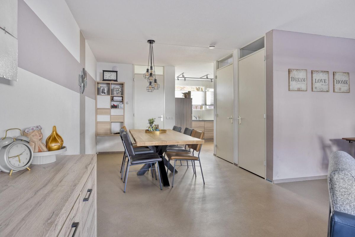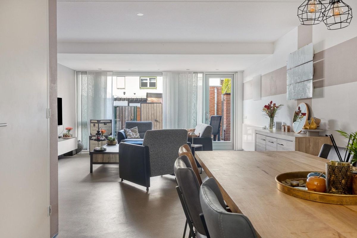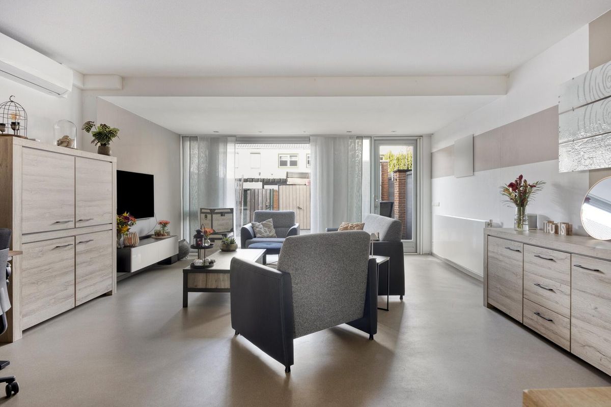 - De ruime uitgebouwde woon-/eetkamer (ca. 41 m²) is voorzien van een zandgietvloer met vloerverwarming, airconditioning, trapkast en veel lichtinval dankzij grote raampartijen aan beide zijden. De achtertuin is via een openslaande deur in de uitbouw bereikbaar.