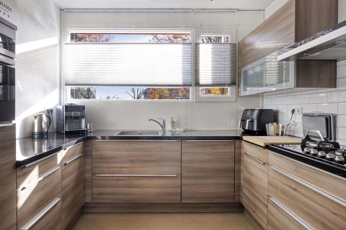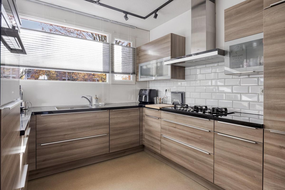 - De open keuken (ca. 9 m²) aan de voorzijde van de woning heeft een moderne U-vormige opstelling met granieten werkblad en diverse inbouwapparatuur, waaronder een 5-pits gaskookplaat, afzuigkap, combioven, vaatwasser, en een koel-vriescombinatie. Vanuit het keukenraam geniet je van een sfeervol uitzicht over het groene Friezenplein (lees: kun je een oogje houden op de daar spelende kinderen).