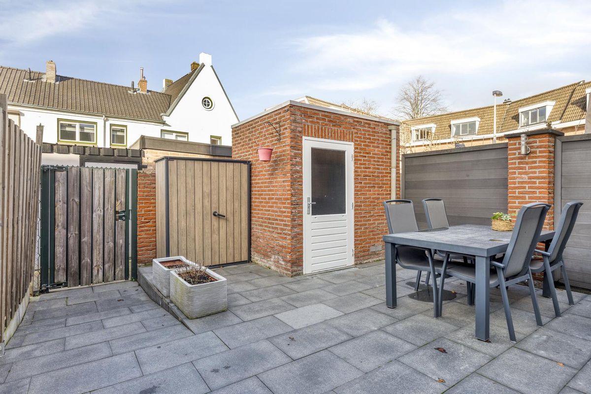 De verzorgde achtertuin met vrijstaande stenen berging is via een achterom te bereiken.