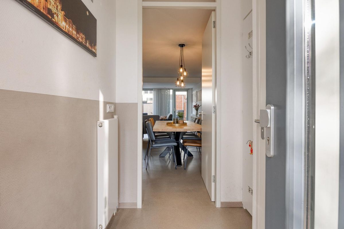 - In de entreehal met garderobe is de meterkast en toiletruimte met wandcloset en fonteintje, en de deur naar de woon-/eetkamer.