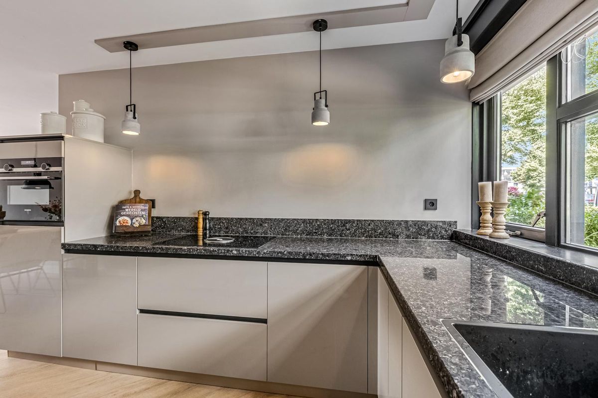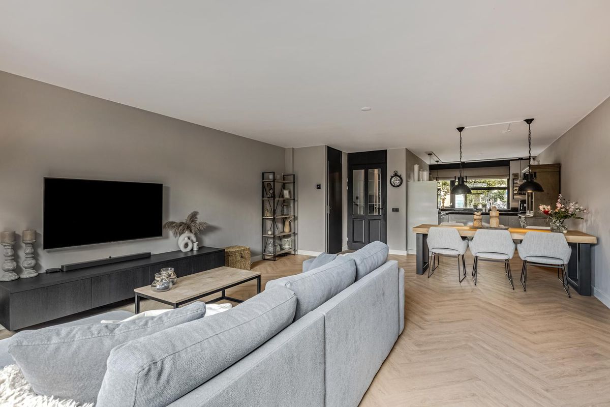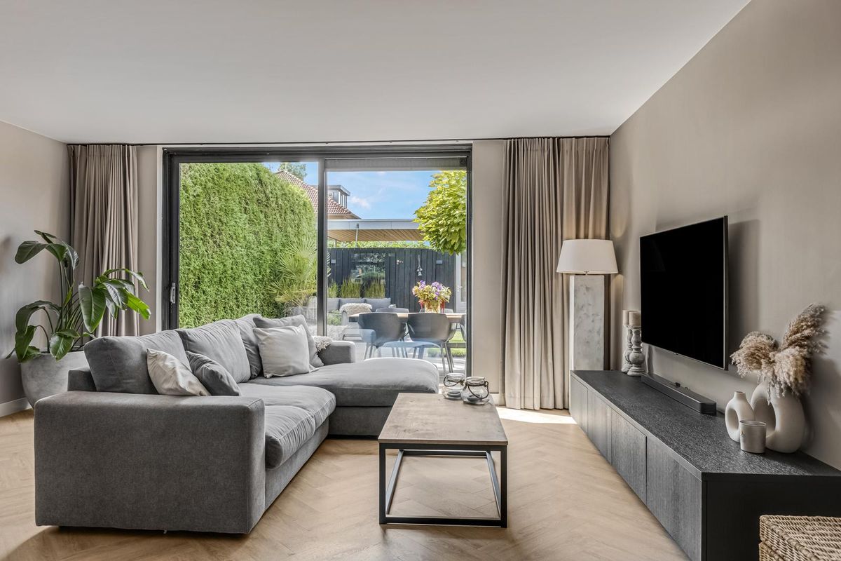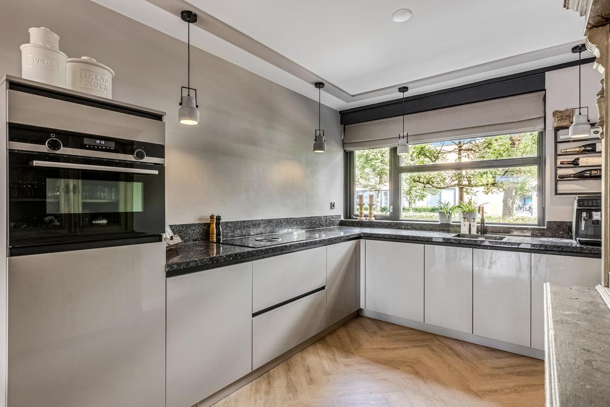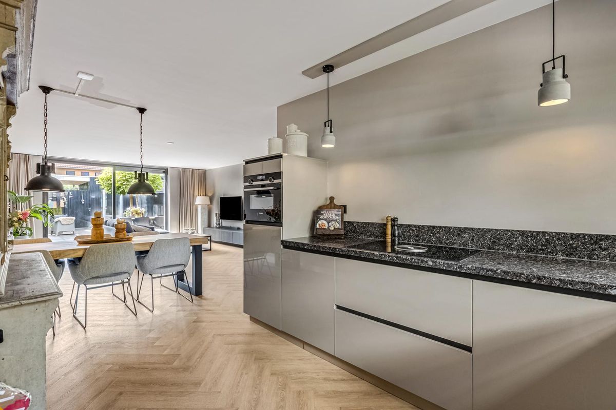De woonkamer aan de achterzijde is heerlijk ruim en dankzij de grote aluminium schuifpui baadt de ruimte in het licht. Aan de voorzijde bevindt zich de moderne open keuken (2019), uitgevoerd in een stijlvolle groen/taupe kleurstelling met greeploze kasten en lades met soft-close systeem. Luxe apparatuur zoals een Bora inductie kookplaat, Siemens combi-oven, AEG vaatwasser en een koelkast maken koken hier een feestje. Het stenen blad en de subtiele sierlijst met verlichting geven de keuken een designlook.