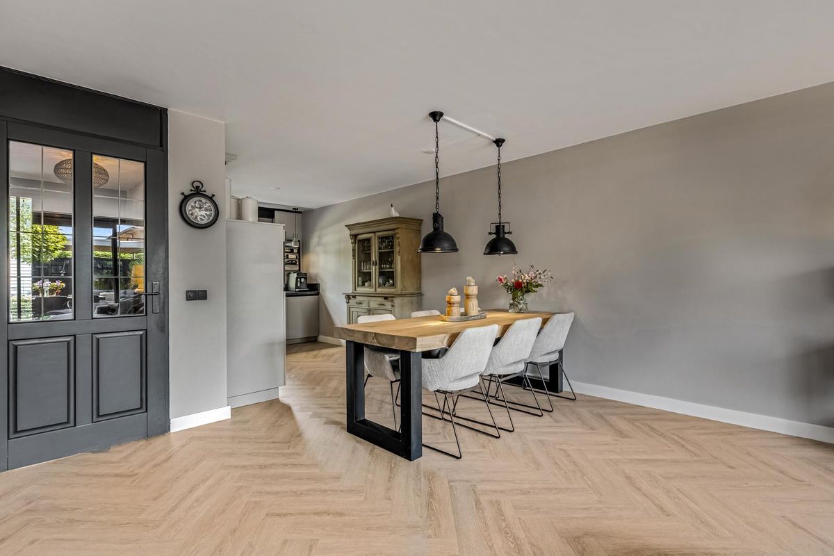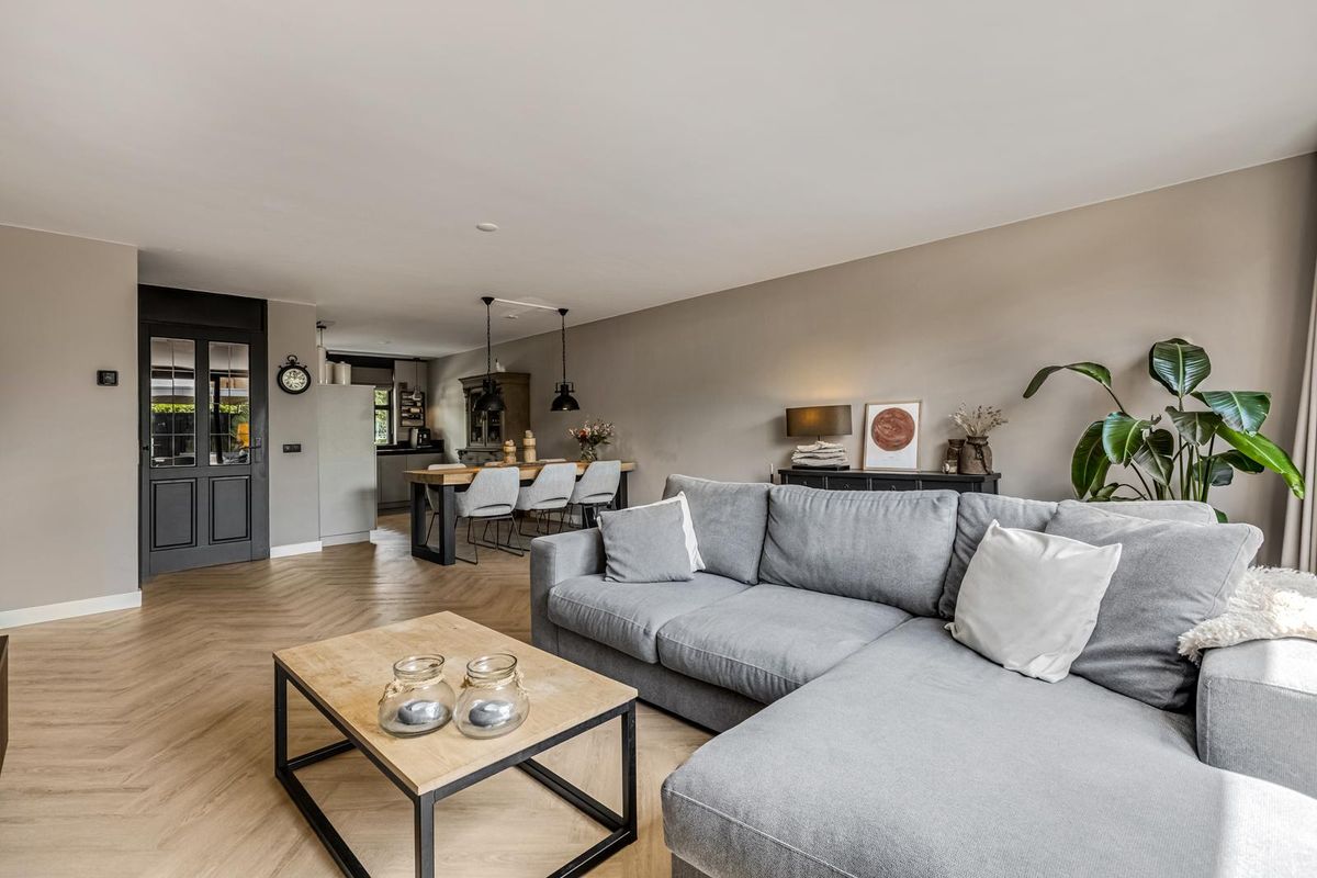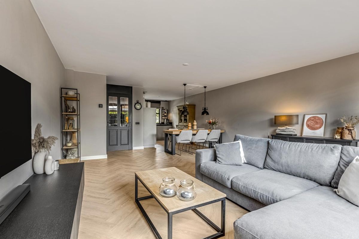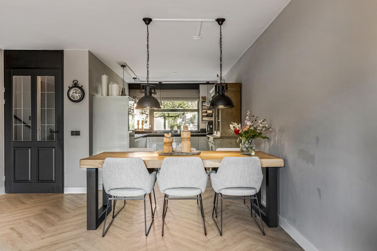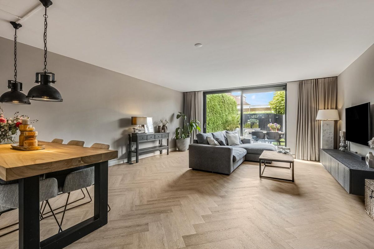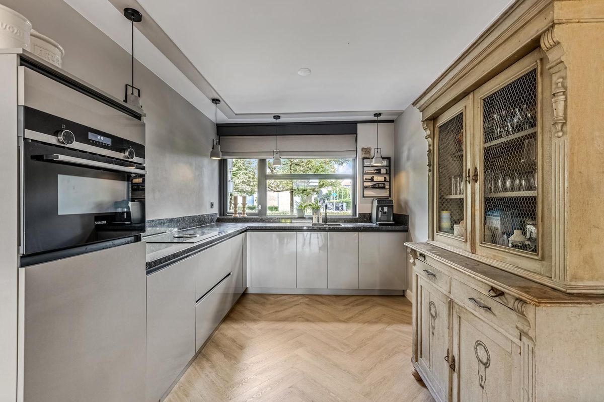 De woonkamer aan de achterzijde is heerlijk ruim en dankzij de grote aluminium schuifpui baadt de ruimte in het licht. Aan de voorzijde bevindt zich de moderne open keuken (2019), uitgevoerd in een stijlvolle groen/taupe kleurstelling met greeploze kasten en lades met soft-close systeem. Luxe apparatuur zoals een Bora inductie kookplaat, Siemens combi-oven, AEG vaatwasser en een koelkast maken koken hier een feestje. Het stenen blad en de subtiele sierlijst met verlichting geven de keuken een designlook.