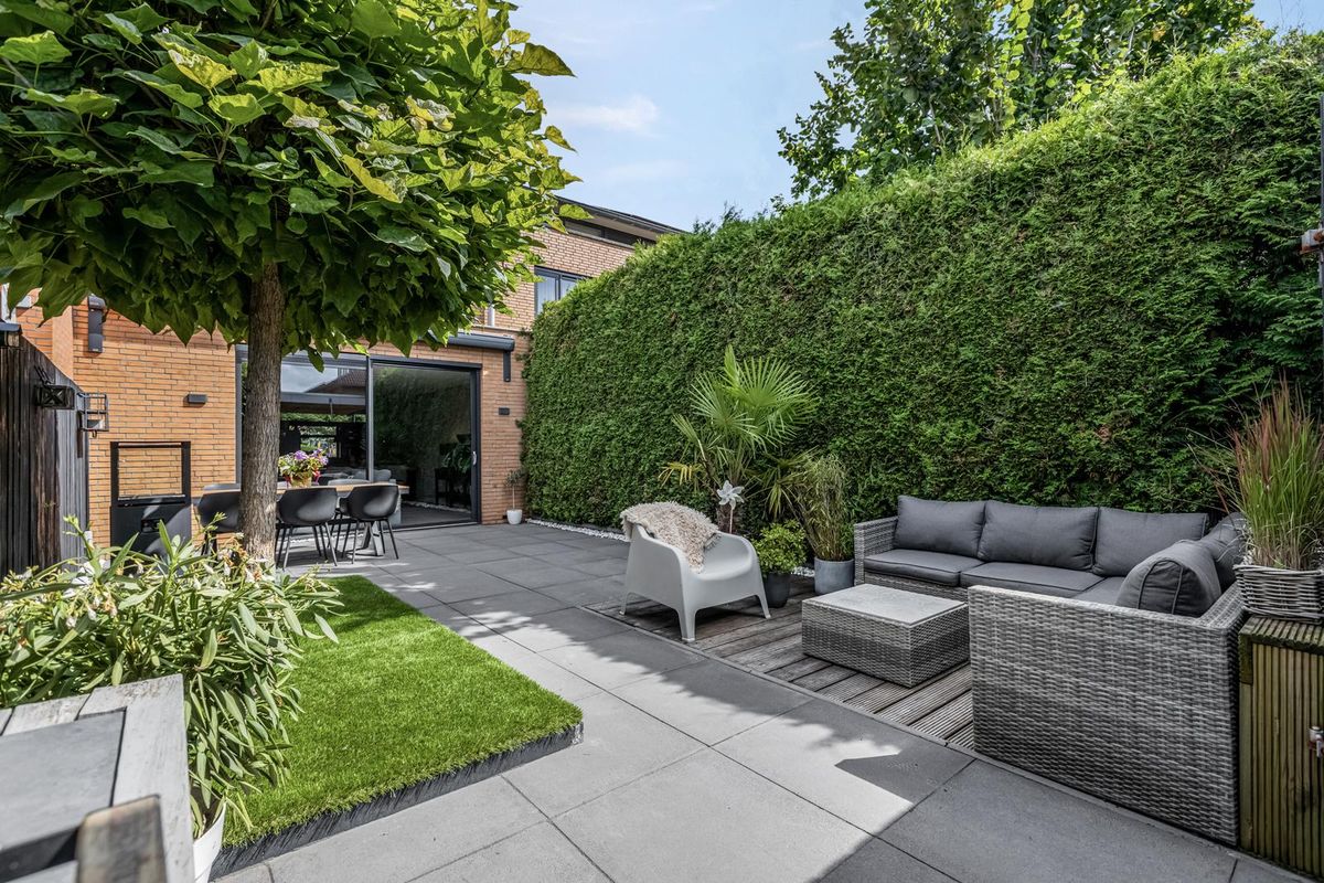 De achtertuin is strak en onderhoudsvriendelijk aangelegd. Direct achter het huis vind je een terras met een elektrisch zonnescherm voor de warme zomerdagen. Verder bestaat de tuin uit kunstgras met enkele bomen en een gezellige loungehoek achterin. Achter in de tuin staat een praktische berging en via de poort bereik je de carport (2022) en je eigen parkeerplaats.