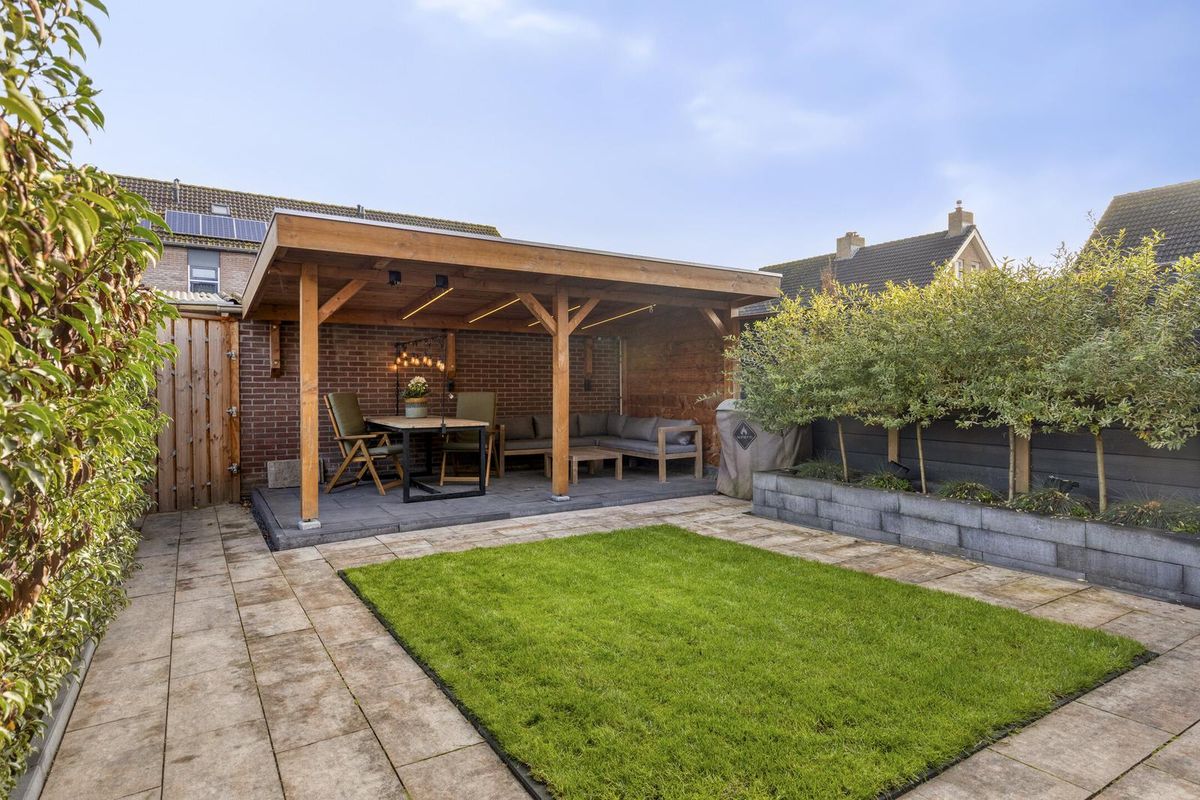 Zowel de voor- als achtertuin zijn recentelijk vernieuwd en keurig onderhouden. De achtertuin is gelegen op het oosten en biedt goede zonligging en veel privacy. Hier is altijd wel een plekje te vinden waar u heerlijk in de zon kunt zitten. Achterin de tuin is een fraaie overkapping (met verlichting) geplaatst, ook hier is het heerlijk vertoeven. Via de poort is de eigen ruime berging te bereiken, ideaal voor het plaatsen van tuinspullen en fietsen. De tuin beschikt over een vrije achterom.