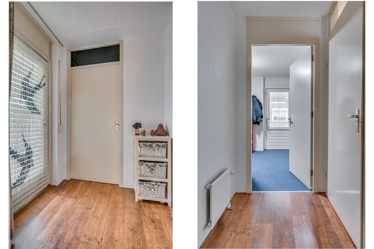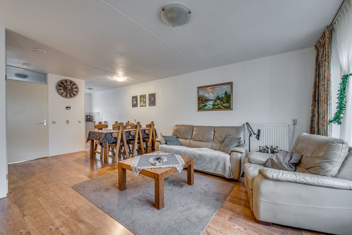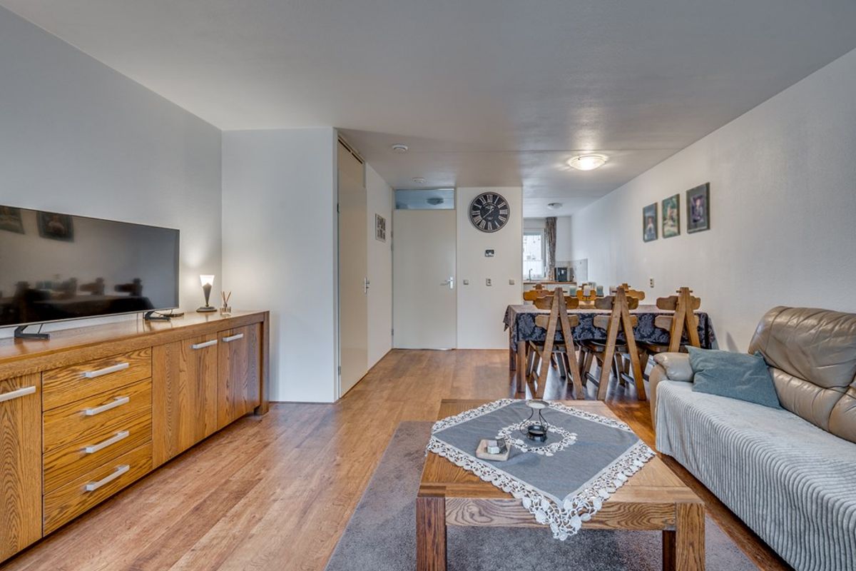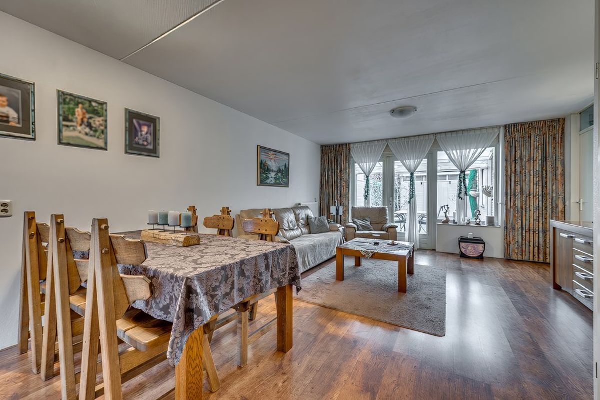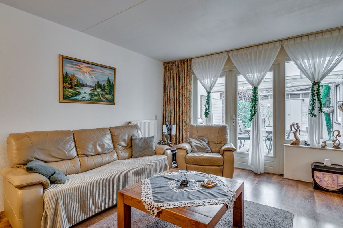 - Zonnige woonkamer met laminaatvloer, openslaande deuren naar de tuin en trapkast.