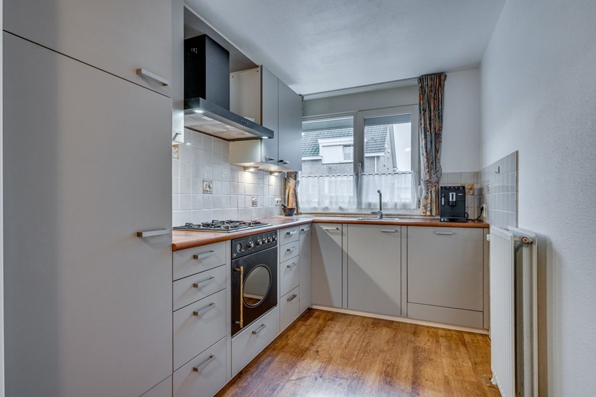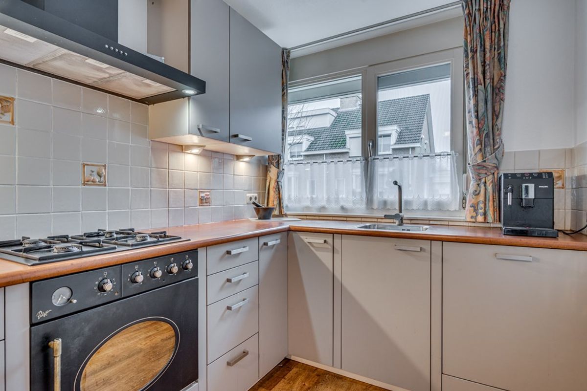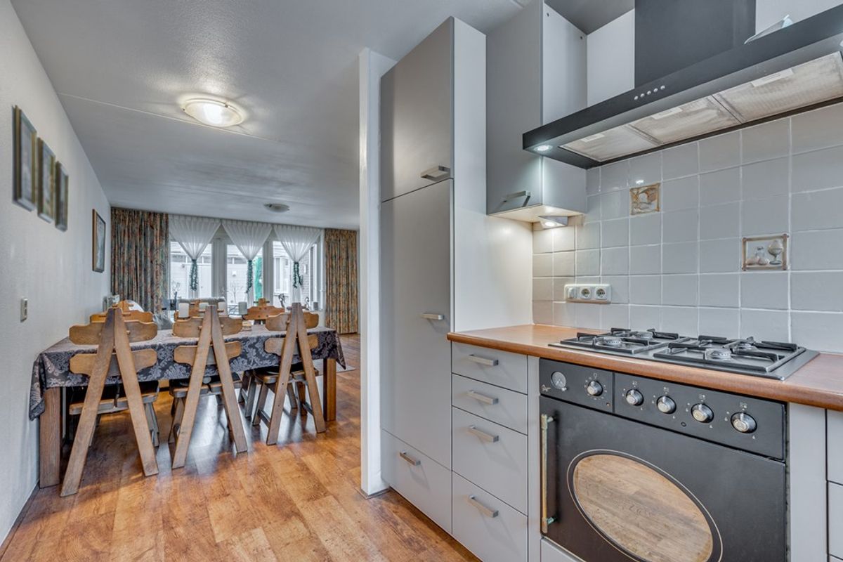 - Keuken, aan voorzijde gesitueerd, met hoek opgestelde inrichting voorzien van gasfornuis, afzuigkap, oven, koelkast en vaatwasser,