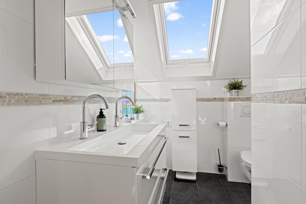 De badkamer ligt ook aan de voorzijde en heeft een moderne, praktische indeling met een dubbele wastafel, inloopdouche en toilet. Dankzij het dakraam en een extra zijraam is dit een heerlijke, lichte ruimte.